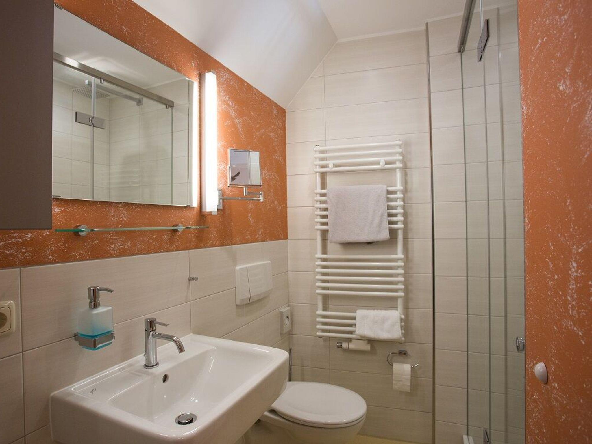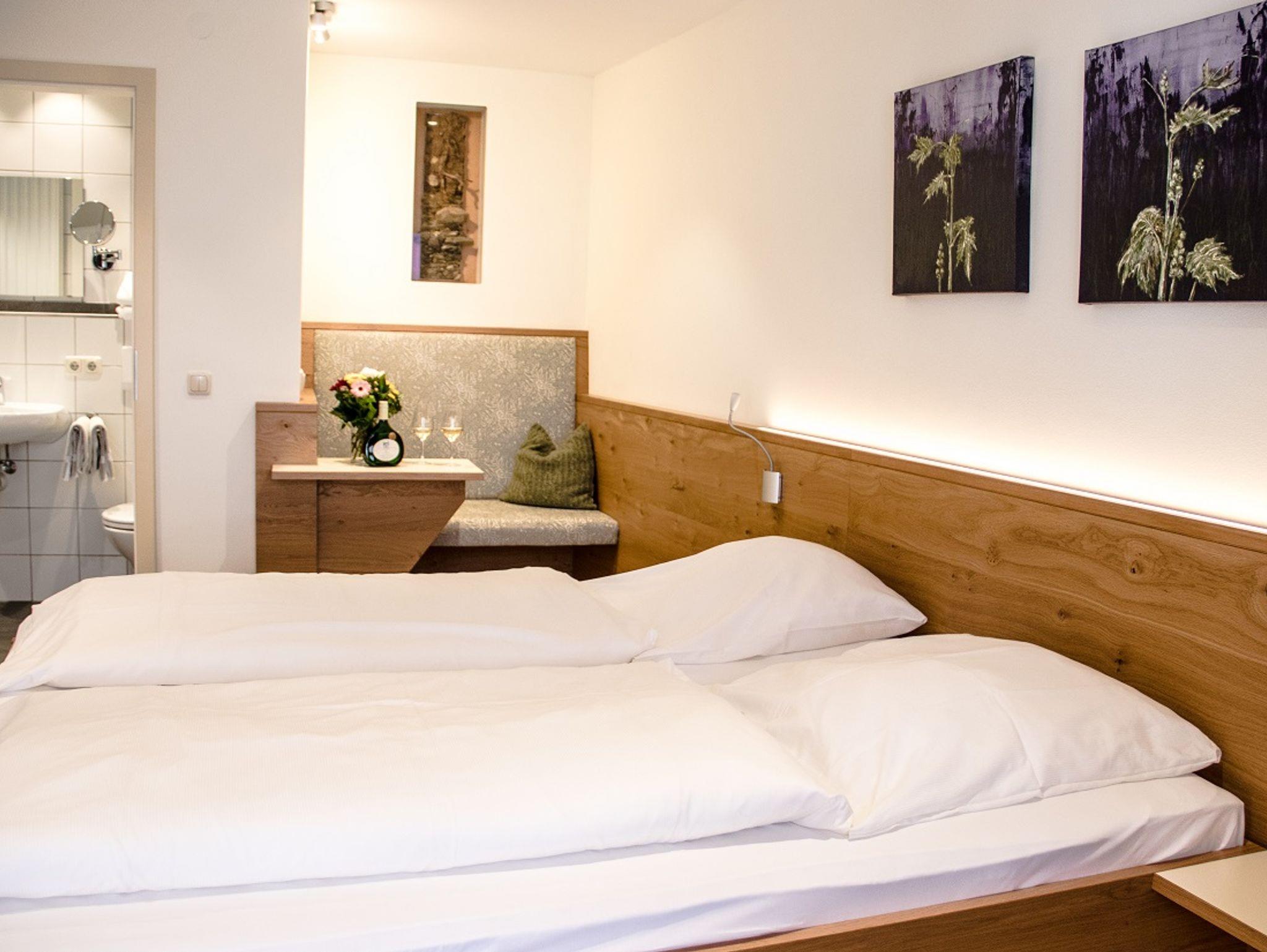 Unser Dreibettzimmer hat eine moderne Zimmereinrichtung und enthält ein Doppelbett, ein Einzelbett, eine kleine Sitzecke, einen Flachbild-TV, einen Schreibtisch und ein Bad mit WC und Dusche. Ein Zustellbett für die 4. Person wäre möglich. Im gesamten Haus stellen wir ihnen kostenfreies Wlan zur Verfügung. Frühstück ist zubuchbar für 12 Euro pro Person.