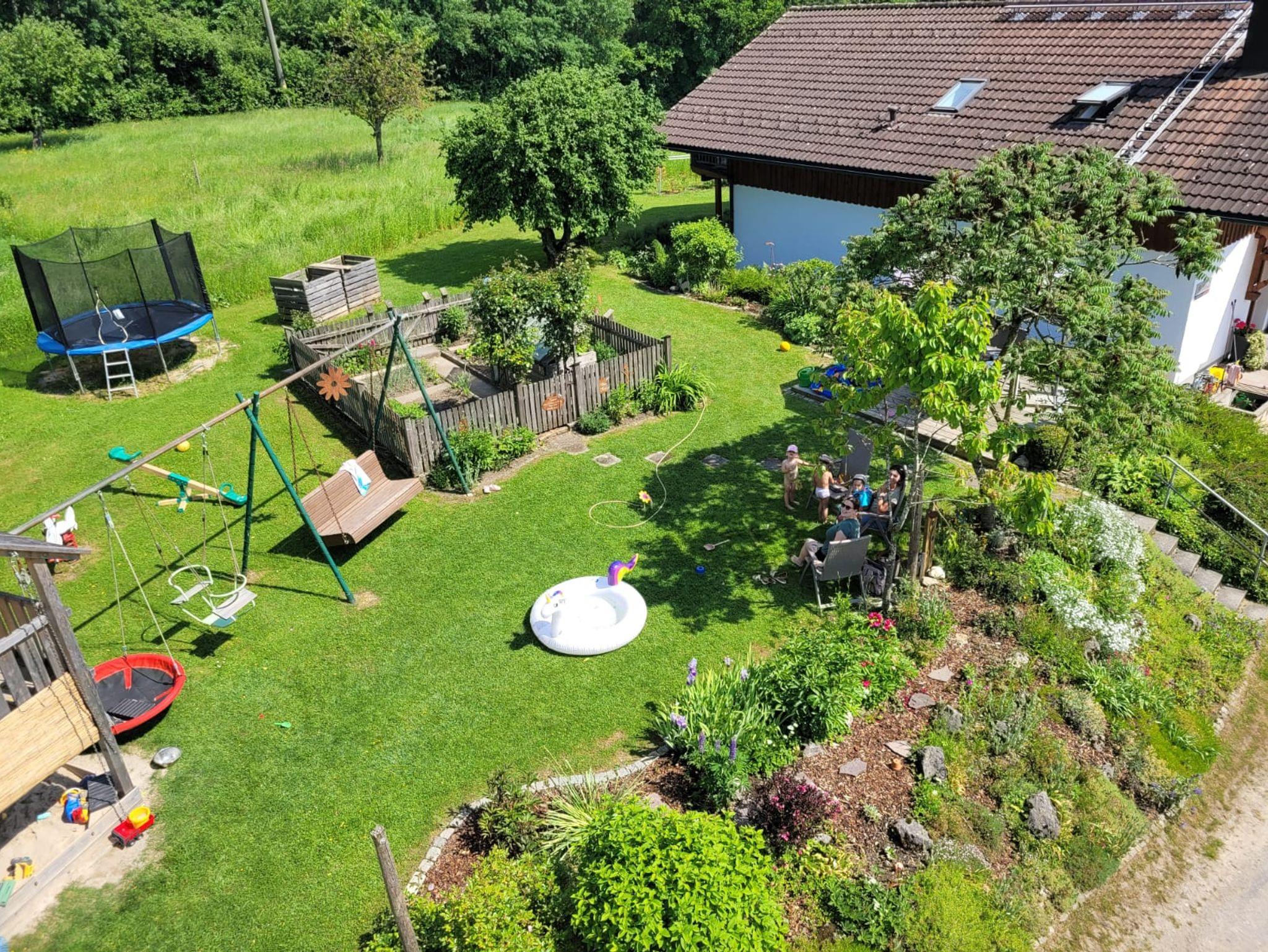 Es ist optimal für Kinder geeignet es gibt Spielemöglichkeiten (Sandkasten, Rutsche, Trampolin, Schaukel) und es herrscht kein Autoverkehr.