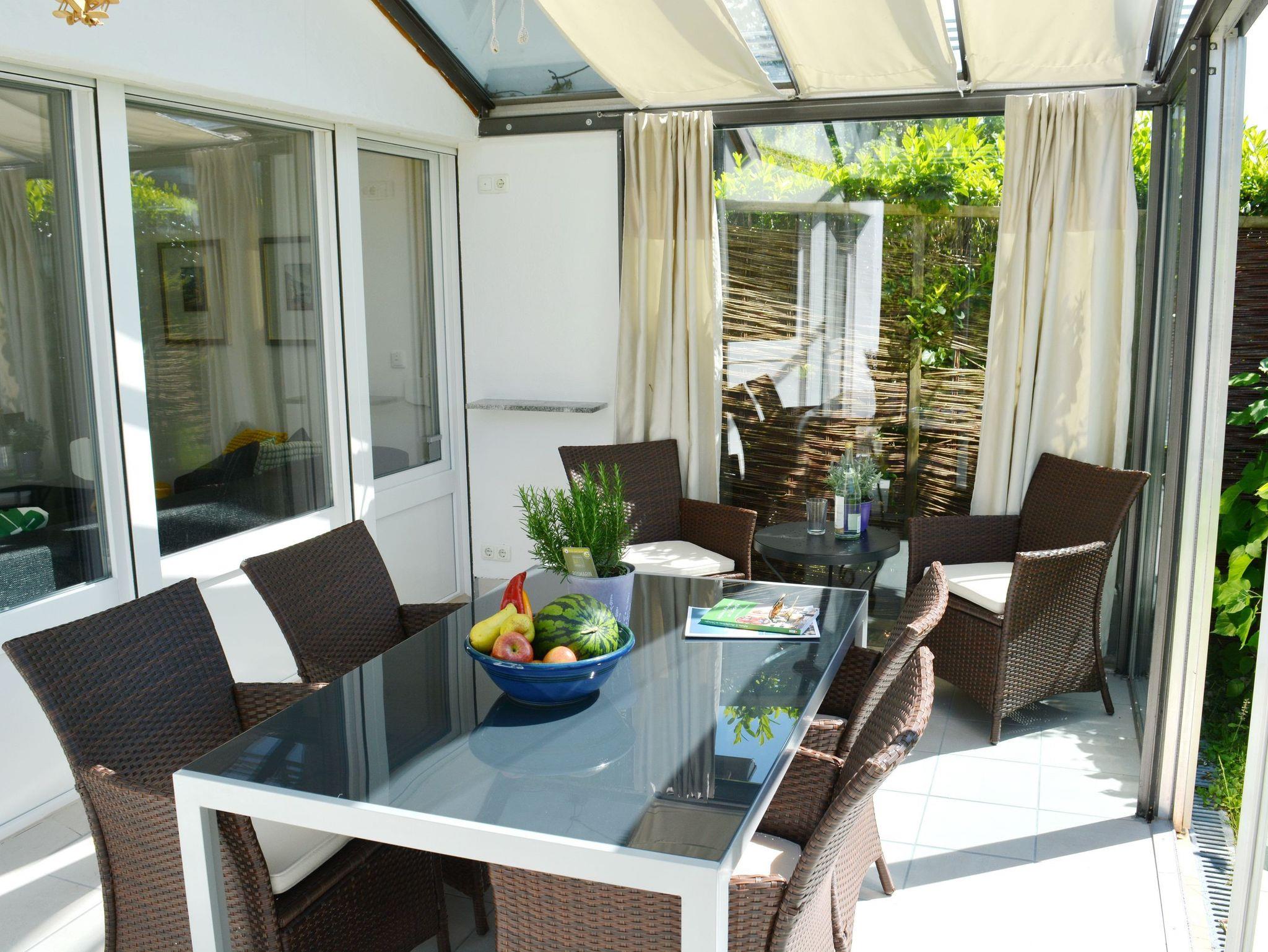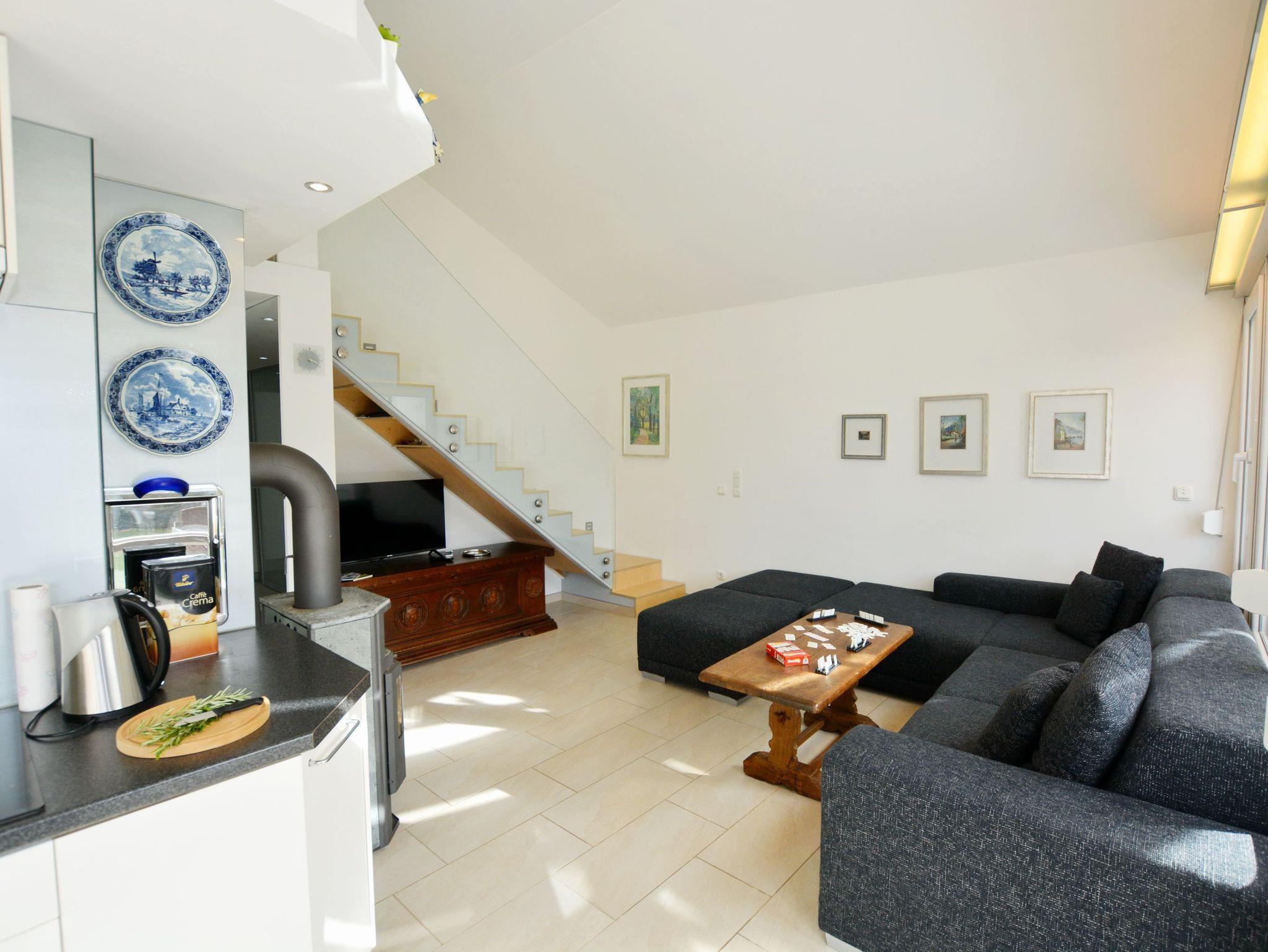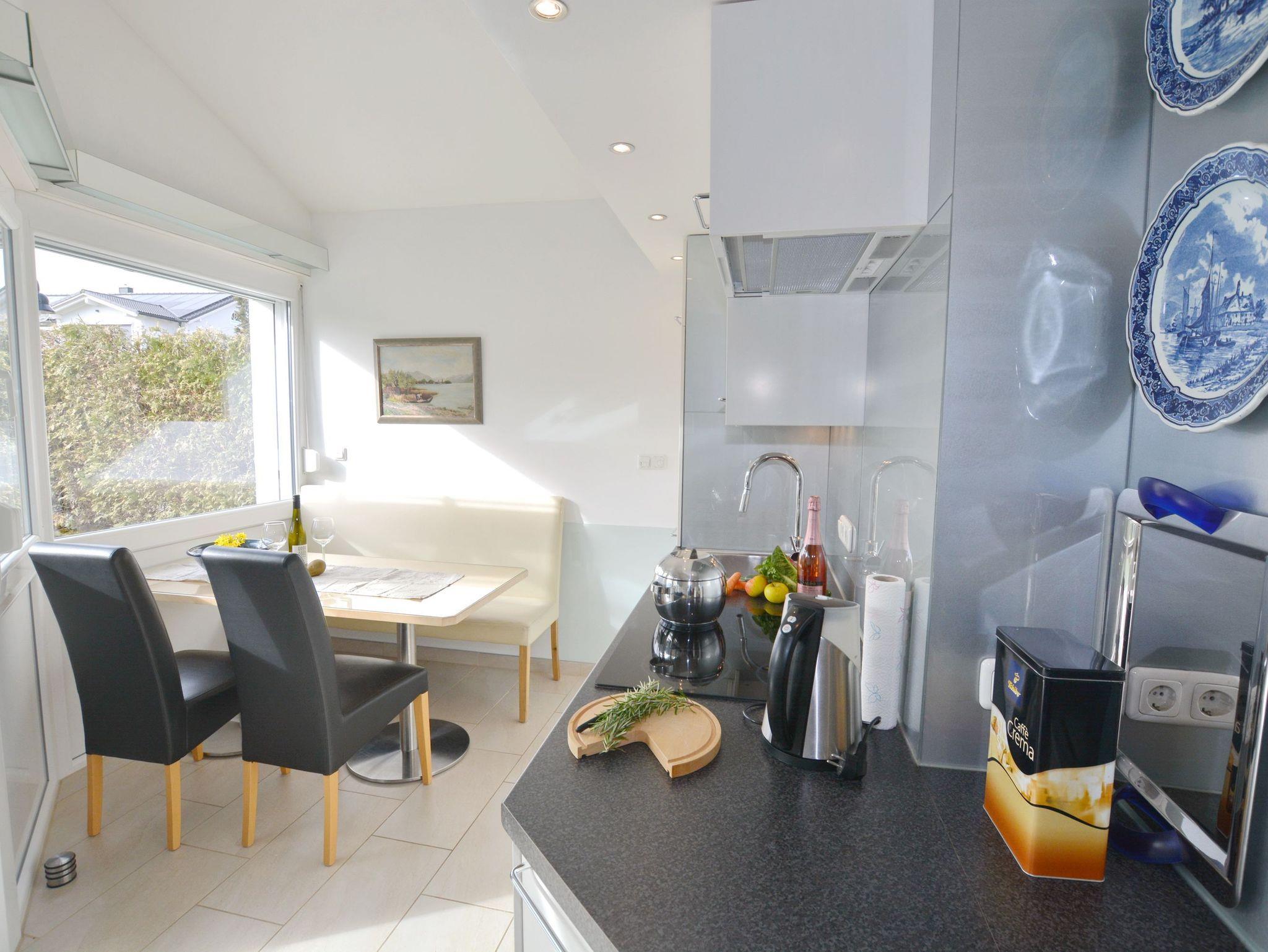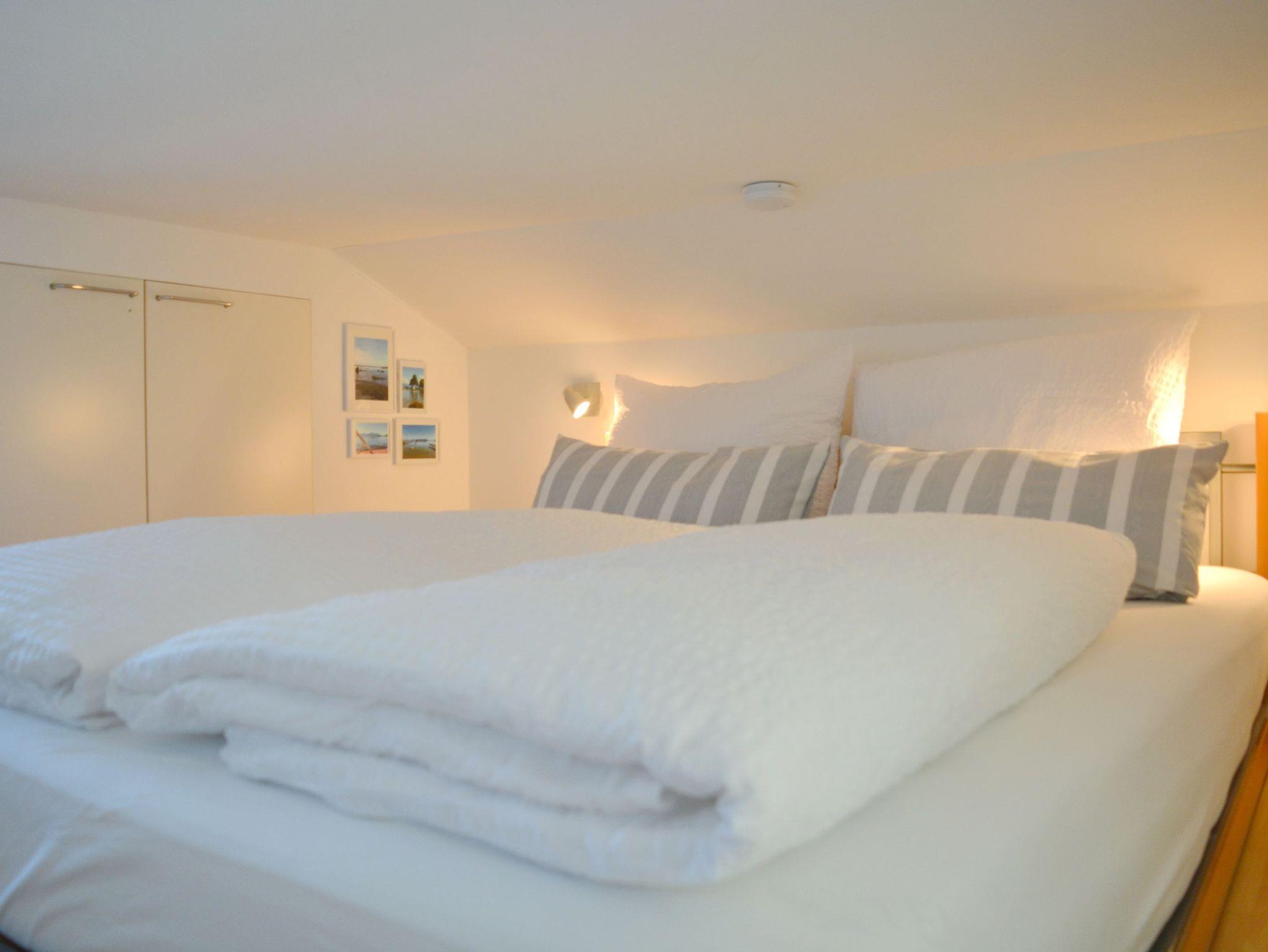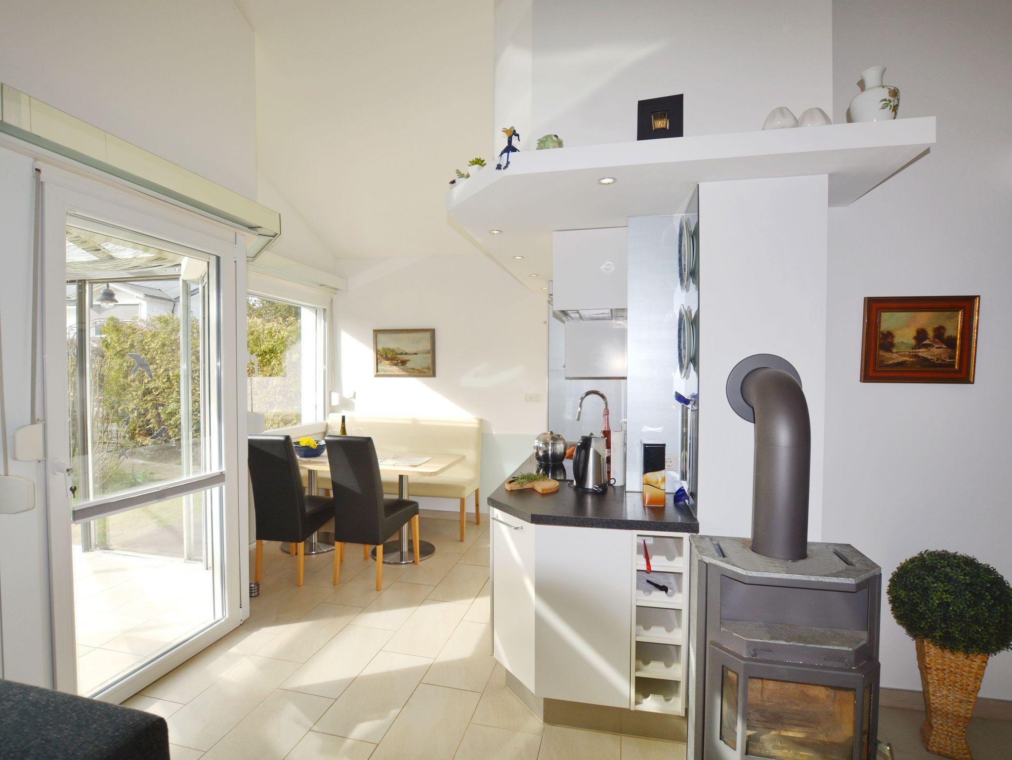 Im Herzen des kleinen, wunderschön gestalteten Häuschens befindet sich der helle und offene Wohnbereich. Hier kann man es sich auf dem Sofa vor dem knisternden Kaminfeuer gemütlich machen. Die offene Küche mit Essbereich ist direkt mit dem Wohnbereich verbunden. Ein besonderes Highlight ist der große Wintergarten, hier kann man die Seele baumeln lassen. Von dort aus gelangt man in den kleinen, eingewachsenen Garten, schöne Stunden sind schon jetzt vorprogrammiert. Einen weiteren Rückzugsort bietet der kleine, offene Wohnbereich mit Sofa und Fernseher im Eingangsbereich, der auch durch Schiebetüren abgetrennt werden kann. Im Erdgeschoss befinden sich außerdem ein Schlafzimmer mit Doppelbett, ein Flur und ein modernes Badezimmer mit Doppelwaschbecken, ebener Dusche mit Regenbrause und WC. Eine Treppe führt vom Wohnbereich zum Schlafbereich im Dachgeschoss, welcher ebenfalls mit einem Doppelbett ausgestattet ist - allerdings ist hier aufgrund der Dachschrägen kein aufrechtes Stehen möglich.