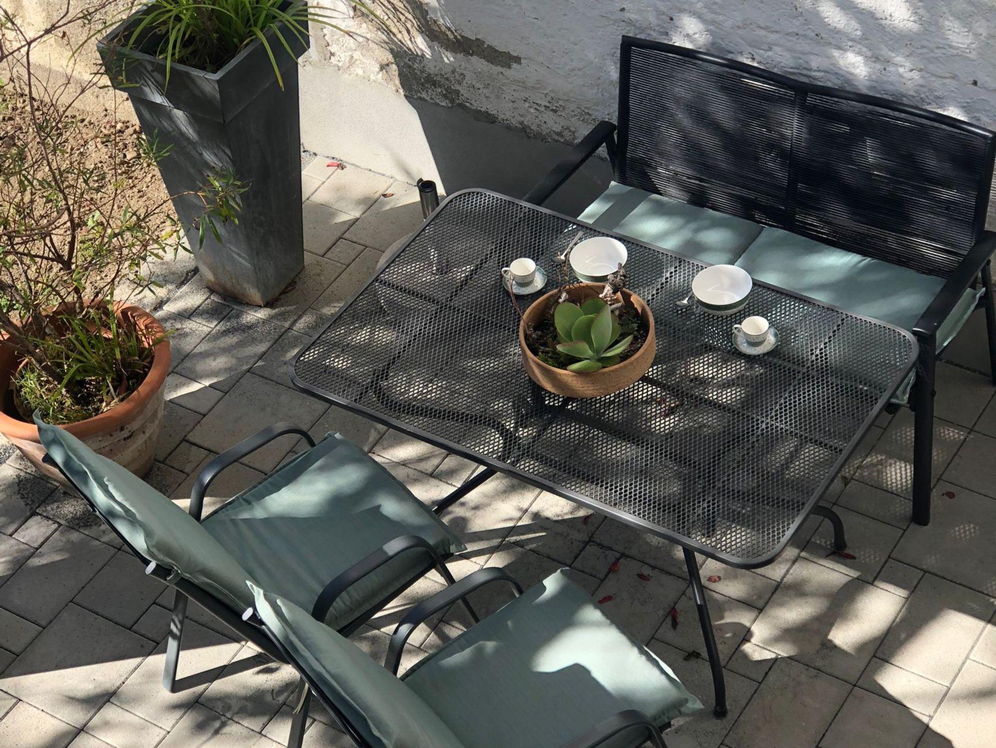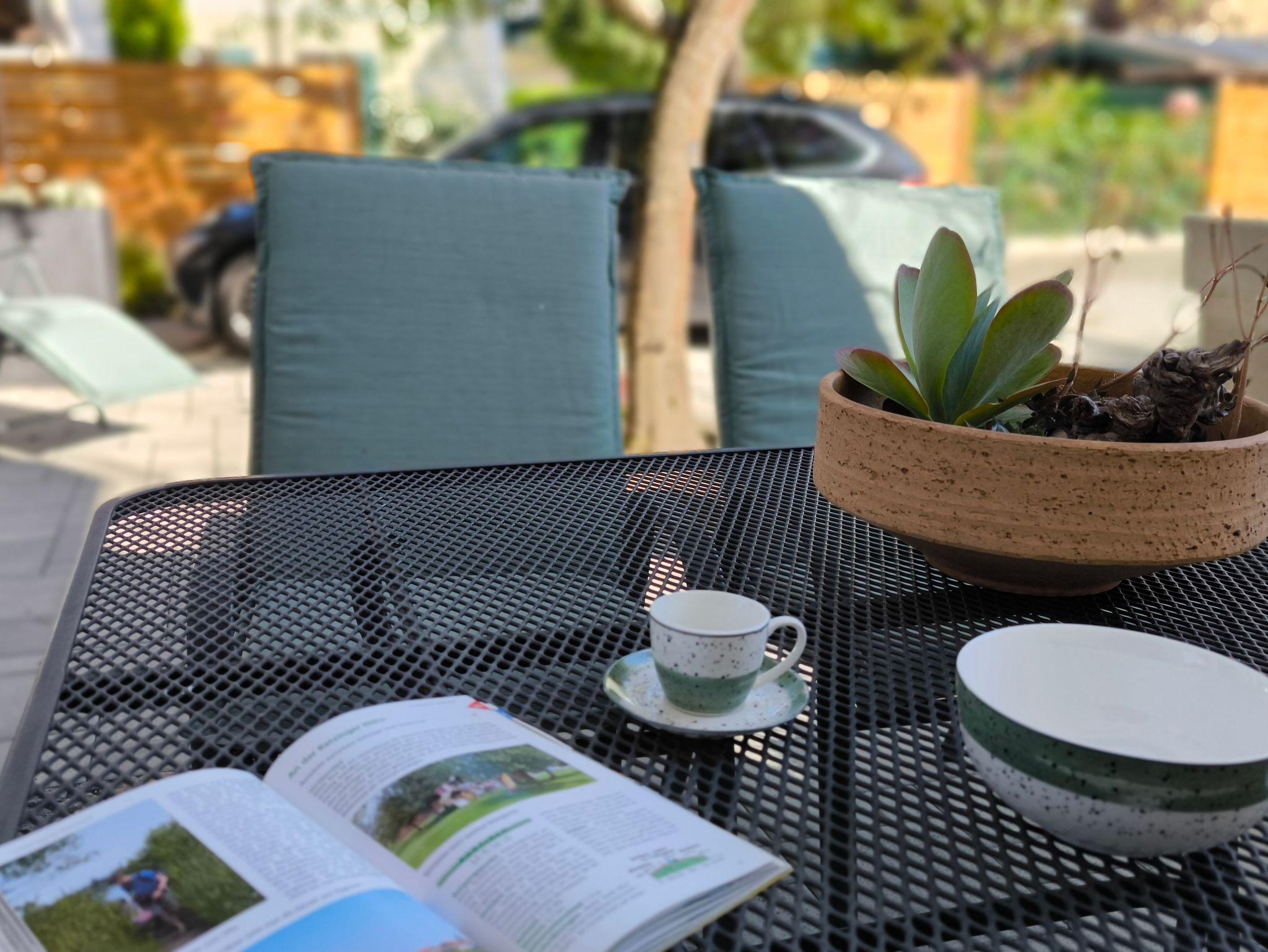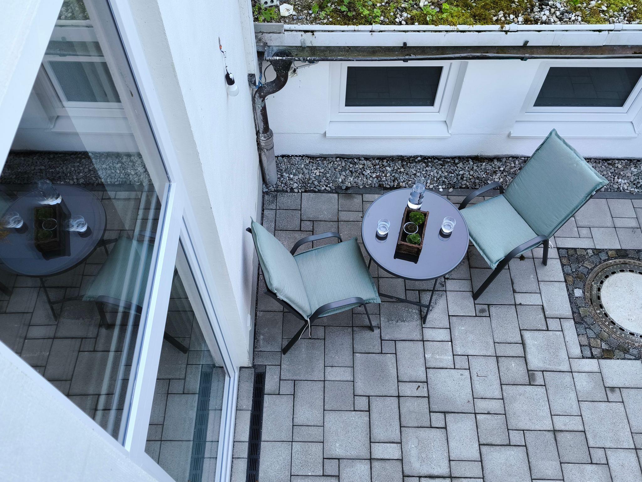 Diese ruhig gelegene Terrasse liegt angenehm im Schatten – perfekt, um sich an heißen Sommertagen abzukühlen. Ausgestattet mit gemütlichen Sitzmöbeln und einem kleinen Tisch, lädt sie zum entspannten Lesen, Kaffeetrinken oder einfach zum Zurückziehen ein. Der Bereich ist gut abgeschirmt und bietet maximale Privatsphäre.