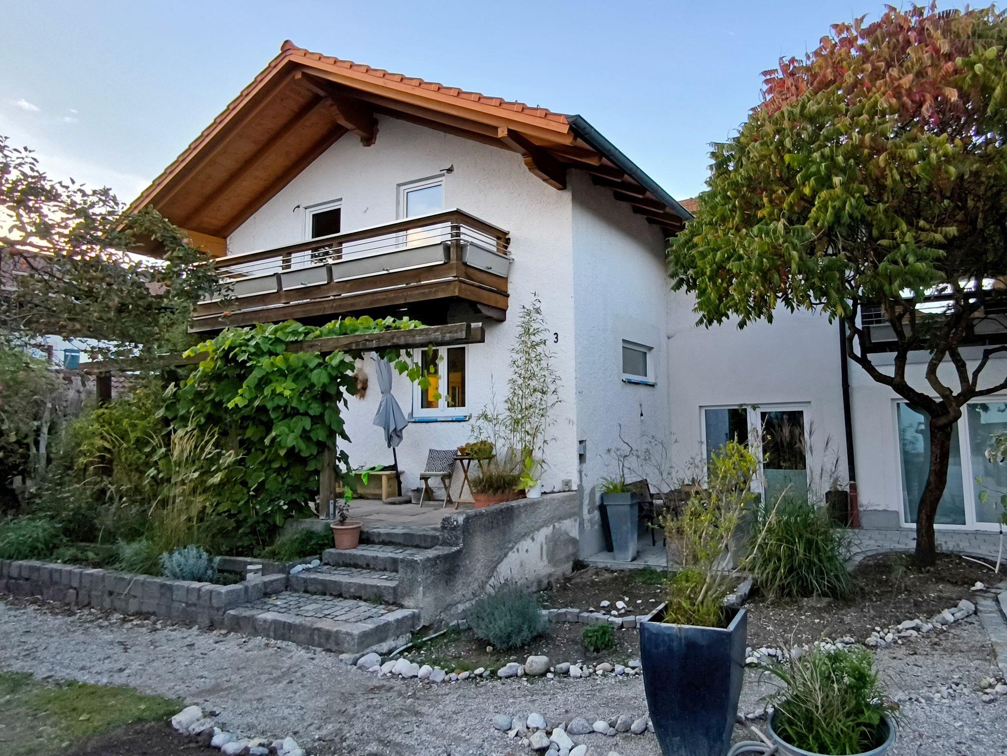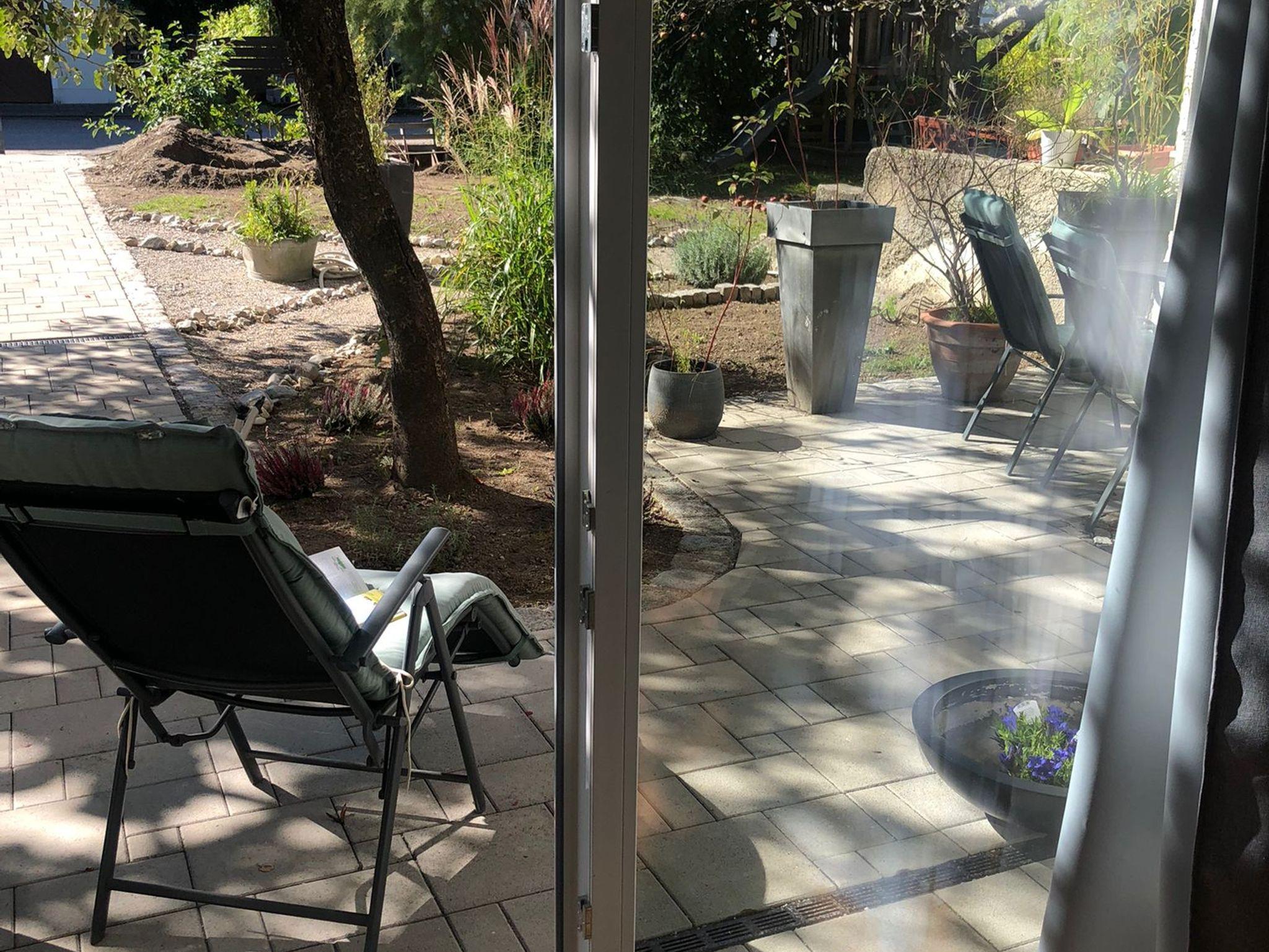 Die großzügige Südterrasse ist der ideale Ort für sonnige Stunden. Schatten bietet unser schöner Essigbaum und ein Sonnenschirm. Hier erwartet Sie ein großer Tisch, an dem Sie gemütlich frühstücken, gemeinsam zu Mittag essen oder den Tag nach einer Wanderung bei einem Glas Wein ausklingen lassen können. Die Terrasse ist direkt am Eingangsbereich der Ferienwohnung gelegen und bietet einen Blick in den grünen Garten.