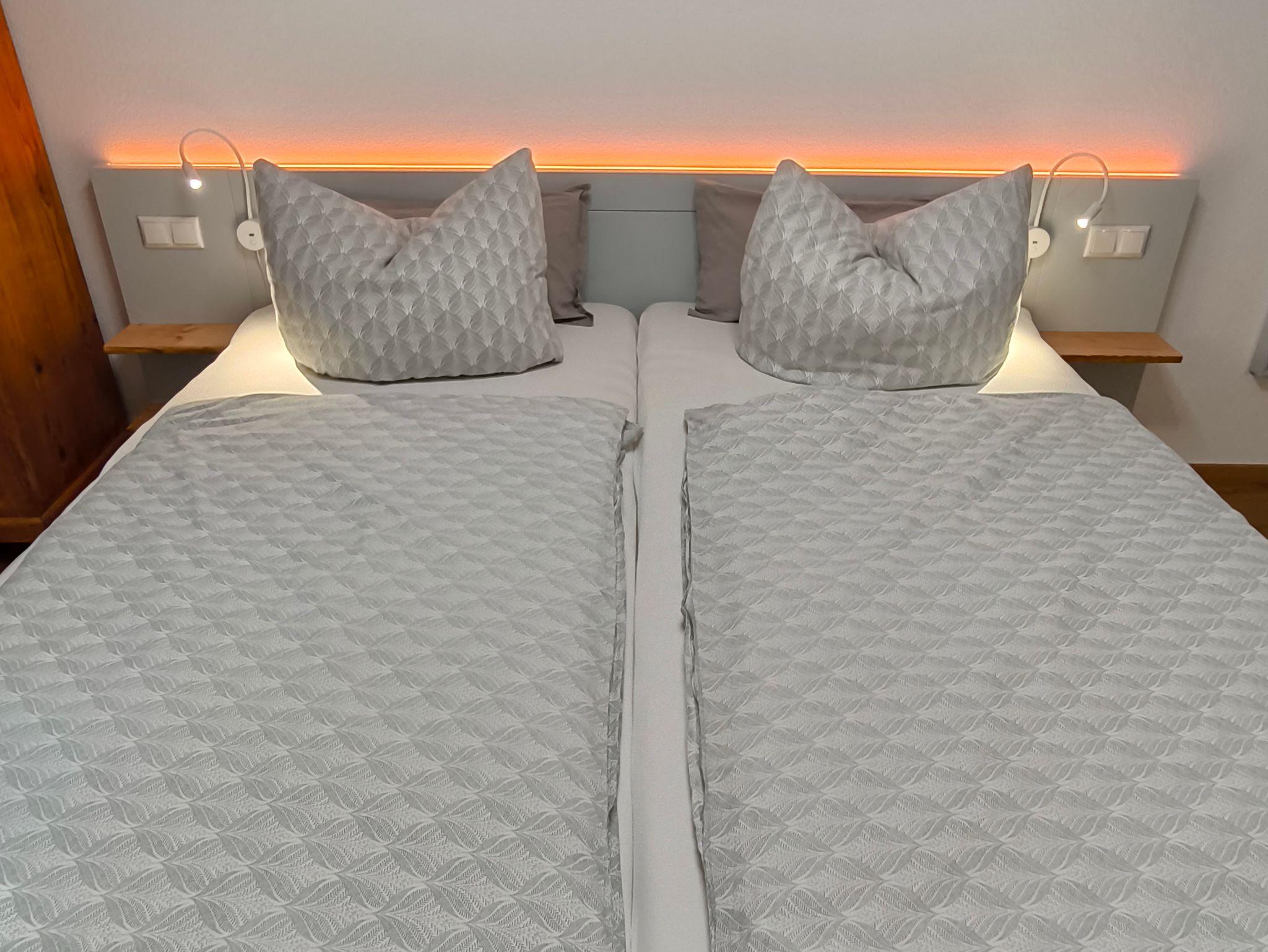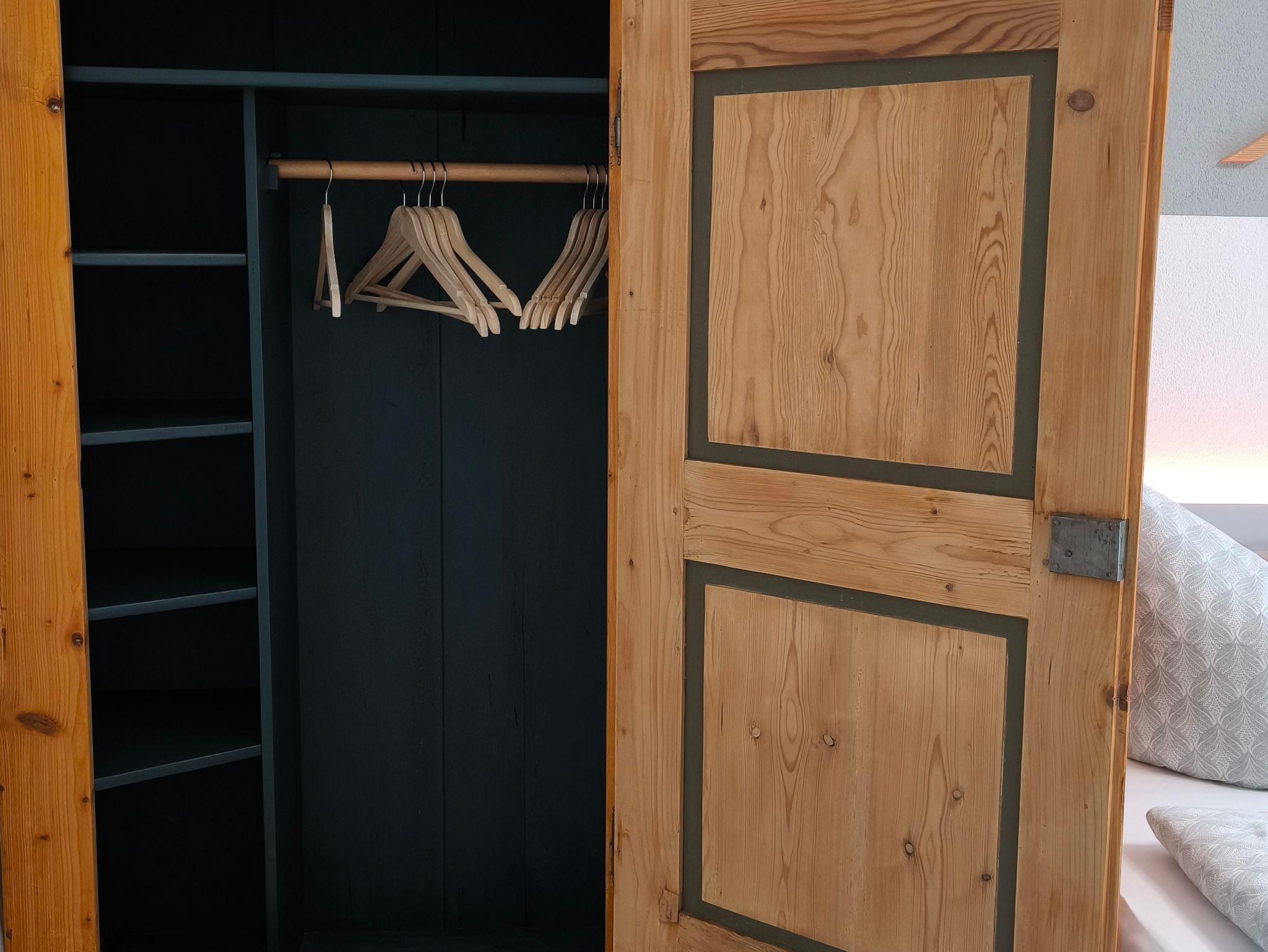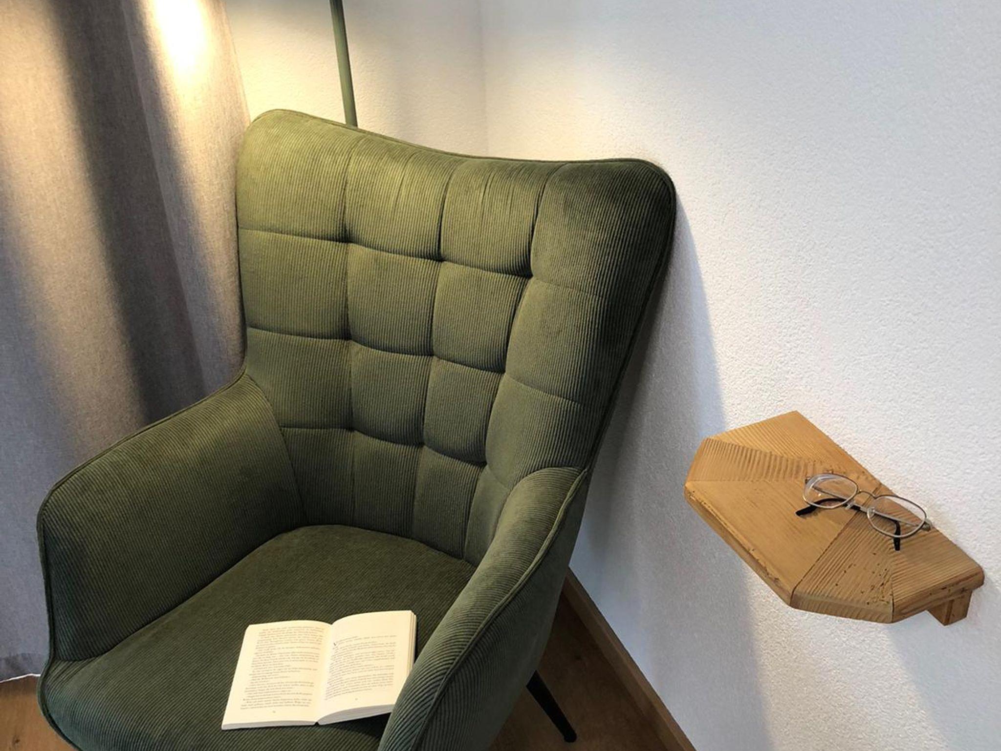 Das Schlafzimmer bietet mit einem extra breiten (2m), komfortablen Doppelbett viel Platz für erholsamen Schlaf. Ein charmantes Highlight ist der originale Bauernschrank, der nicht nur Geschichte, sondern auch ausreichend Stauraum für Kleidung und Gepäck bietet. Der Lesesessel mit Stehlampe und Buchablage läd zum Lesen oder Entspannen ein. Verdunklungsvorhänge sorgen für angenehme Dunkelheit – ideal für einen ruhigen Schlaf.