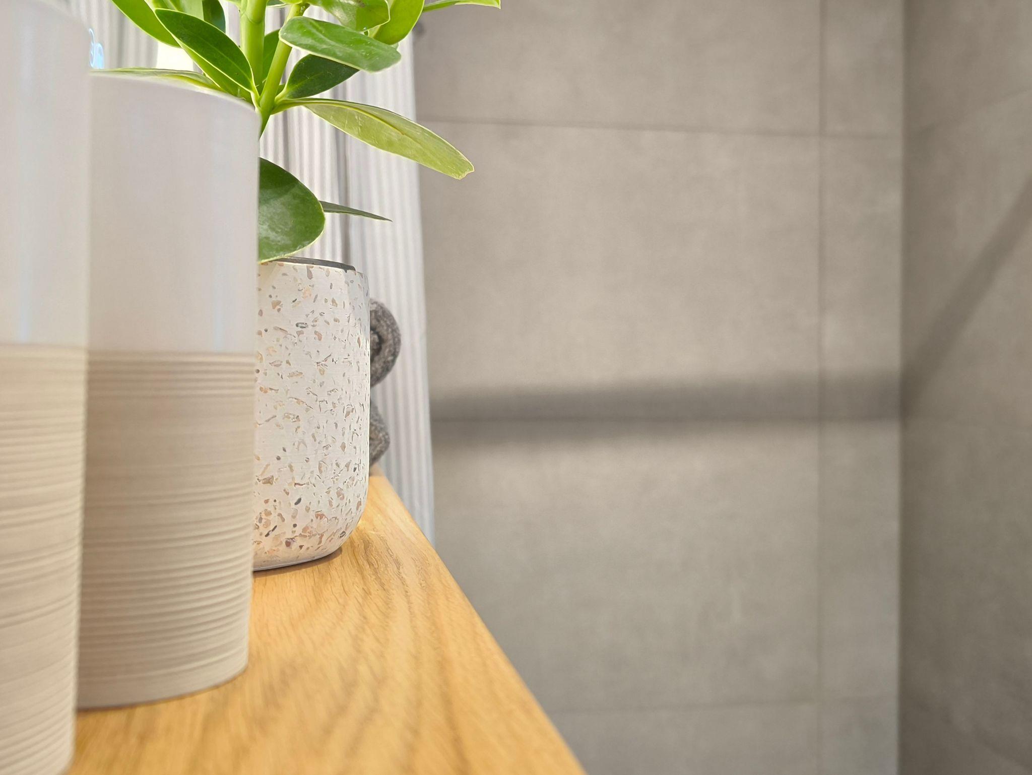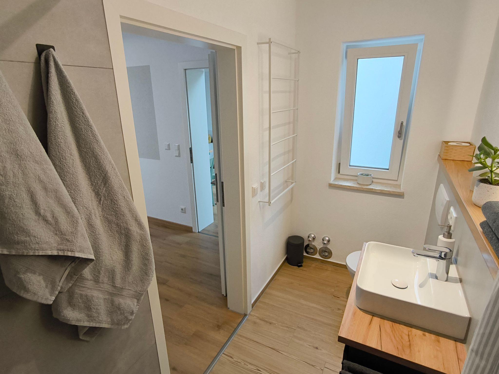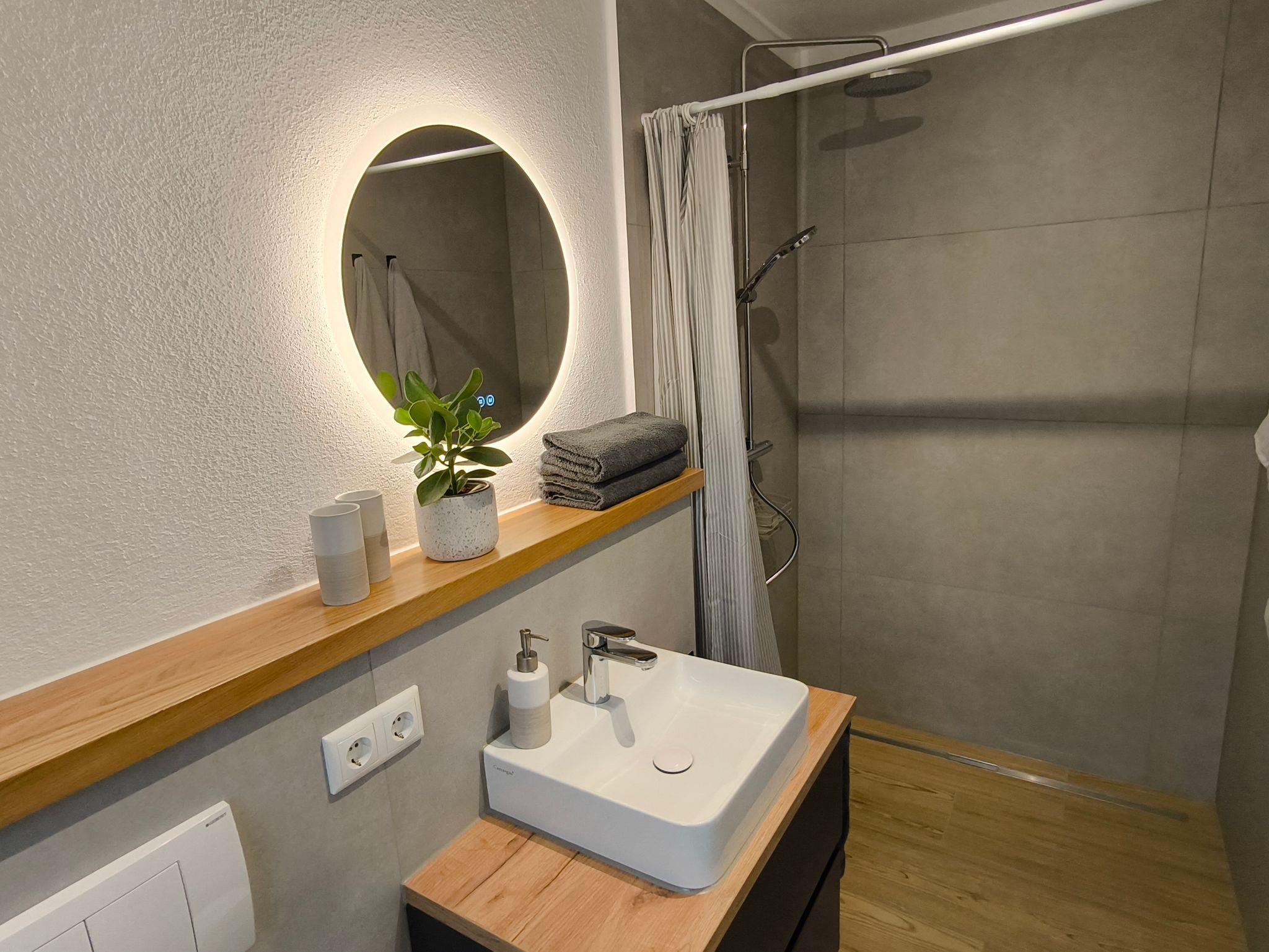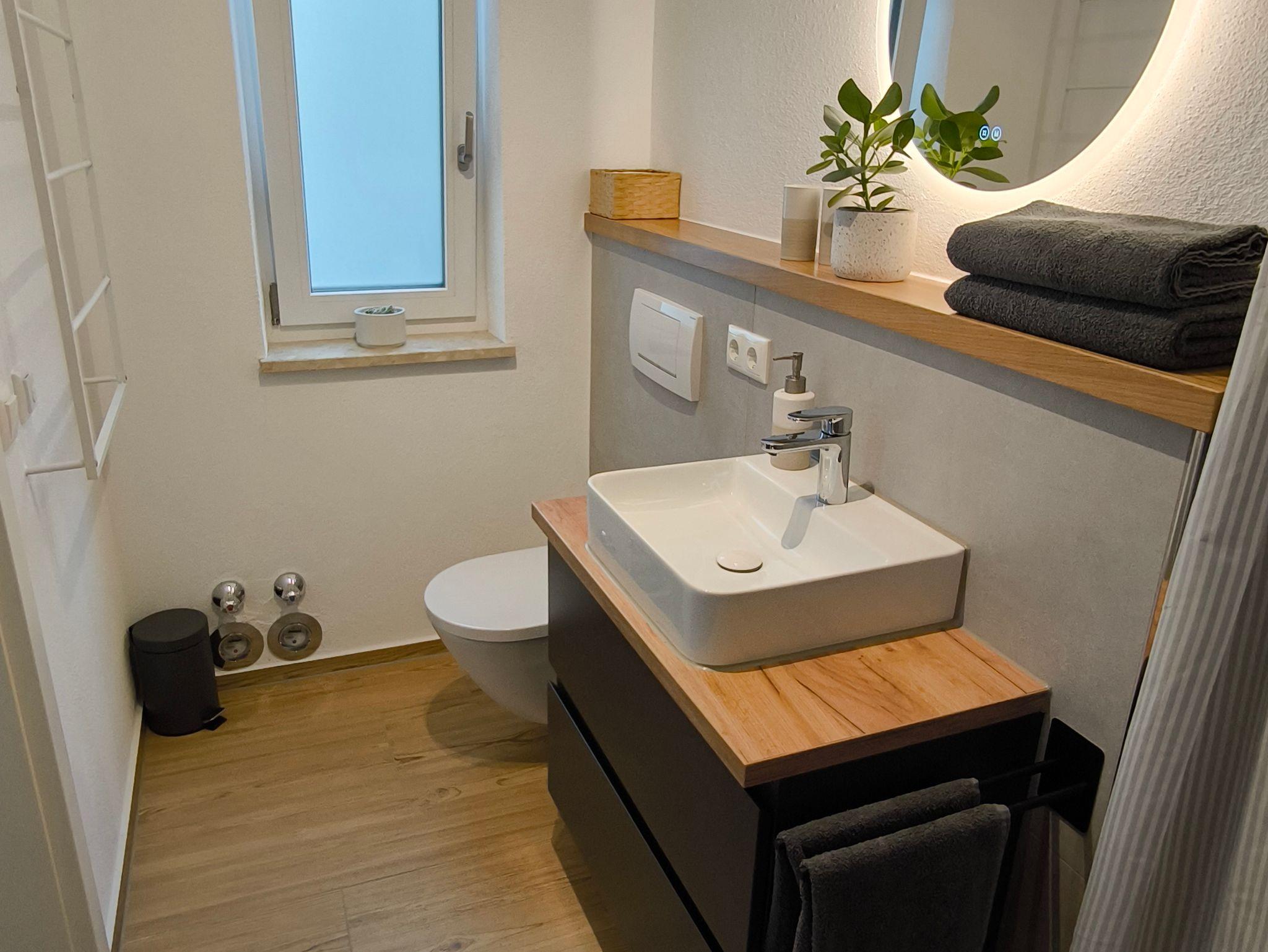 Das frisch renovierte Bad besticht durch seine moderne Gestaltung und einer hochwertigen Ausstattung. Eine ebenerdige Dusche mit Hand- und Kopfbrause sorgt für komfortables Duschen, während natürliche Holzelemente für eine warme Atmosphäre sorgen. Ein Fenster bringt Tageslicht und sorgt für eine angenehme Belüftung.