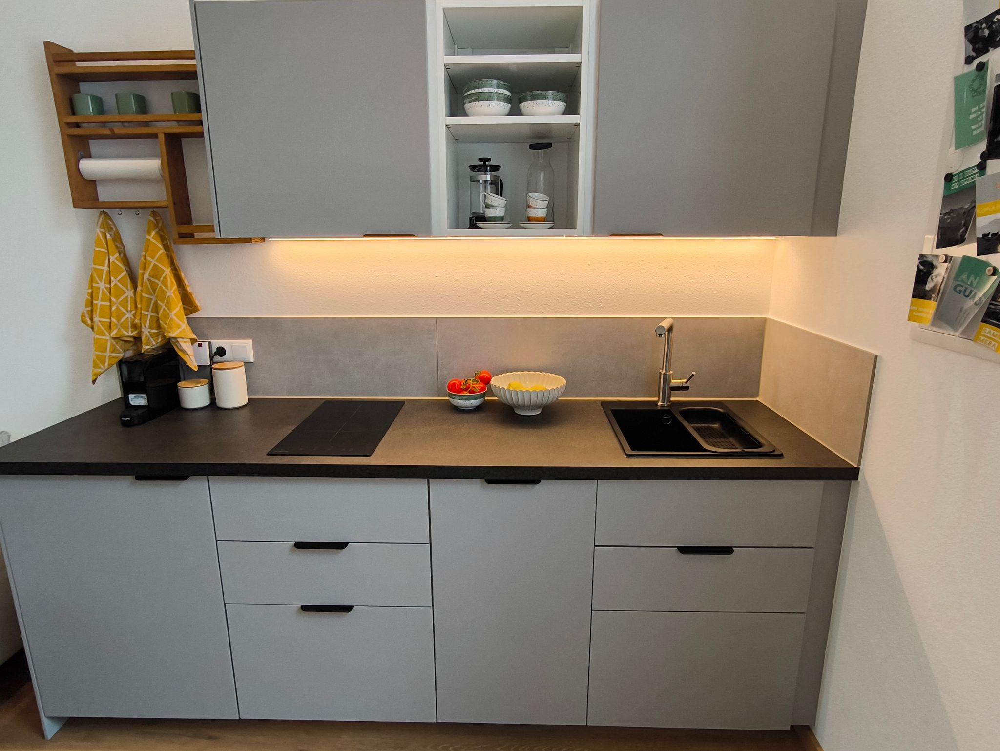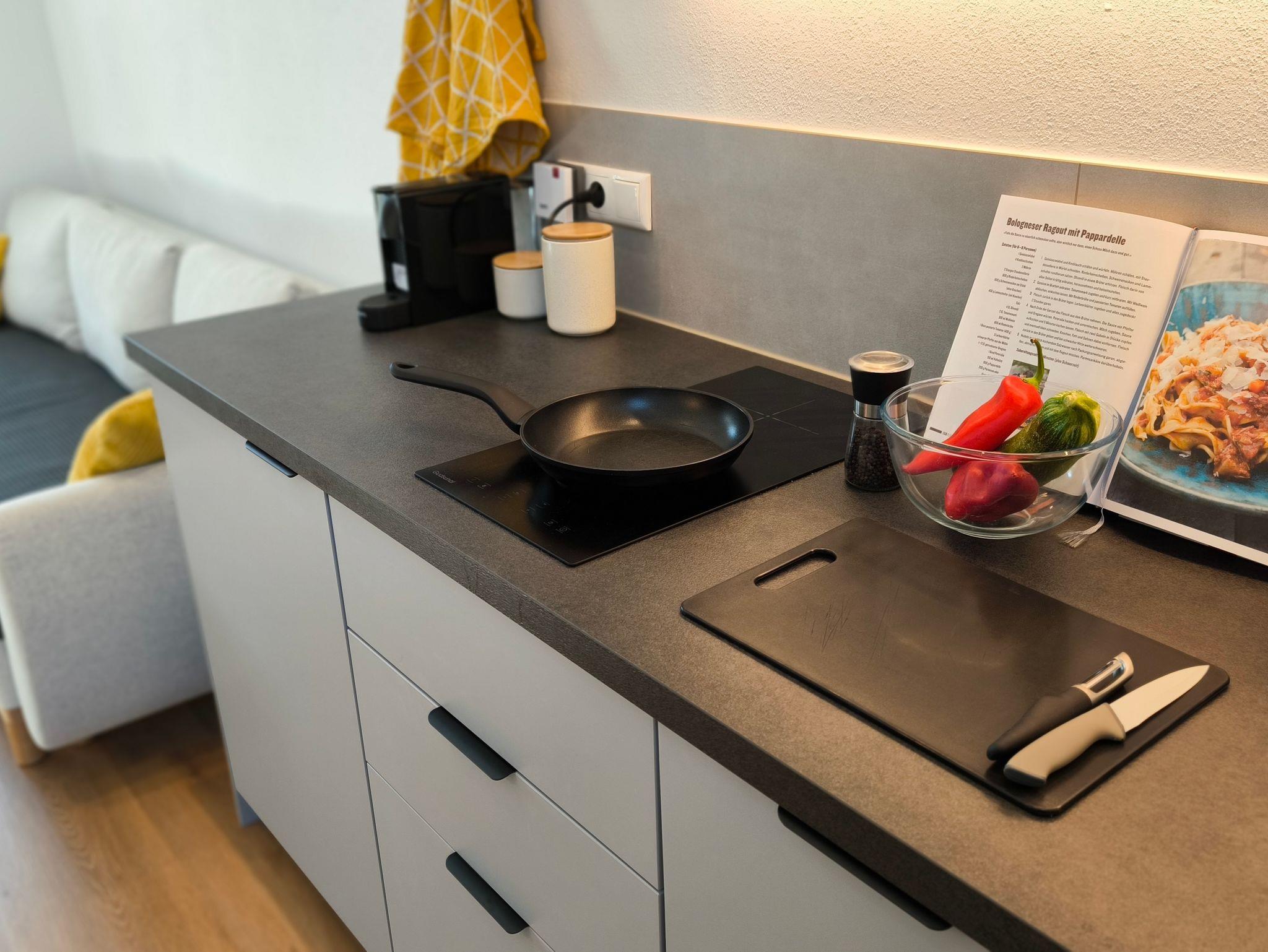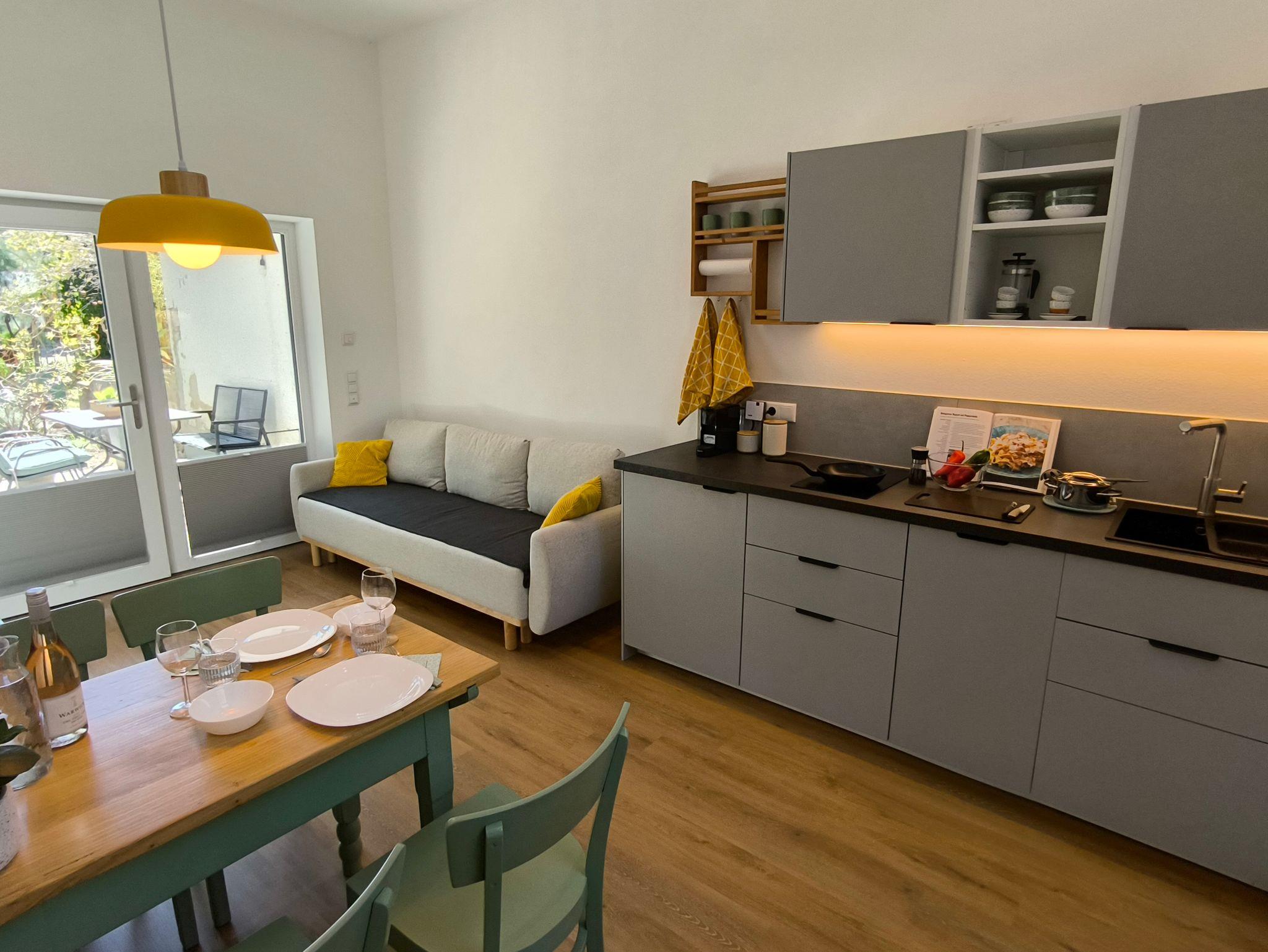 Die Wohnküche vereint Kochen, Essen und Entspannen in einem stilvollen Ambiente. Die moderne, voll ausgestattete Küche bietet alles, was man für den täglichen Bedarf benötigt – inklusive Kapselkaffeemaschine und Induktionskochfeld. Der Esstisch bietet Platz bis zu vier Personen und eignet sich auch ideal als Arbeitsplatz für mobile work. W-LAN steht in der gesamten Ferienwohnung kostenlos zur Verfügung. Ein gemütliches Sofa lädt zum Verweilen ein und lässt sich bei Bedarf in eine komfortable Schlafcouch verwandeln. Zur abendlichen Unterhaltung oder Entspannung kann das All-In-One-Audio System (Radio, Bluetooth, CD, USB) oder der Flachbild-Fernseher dienen.