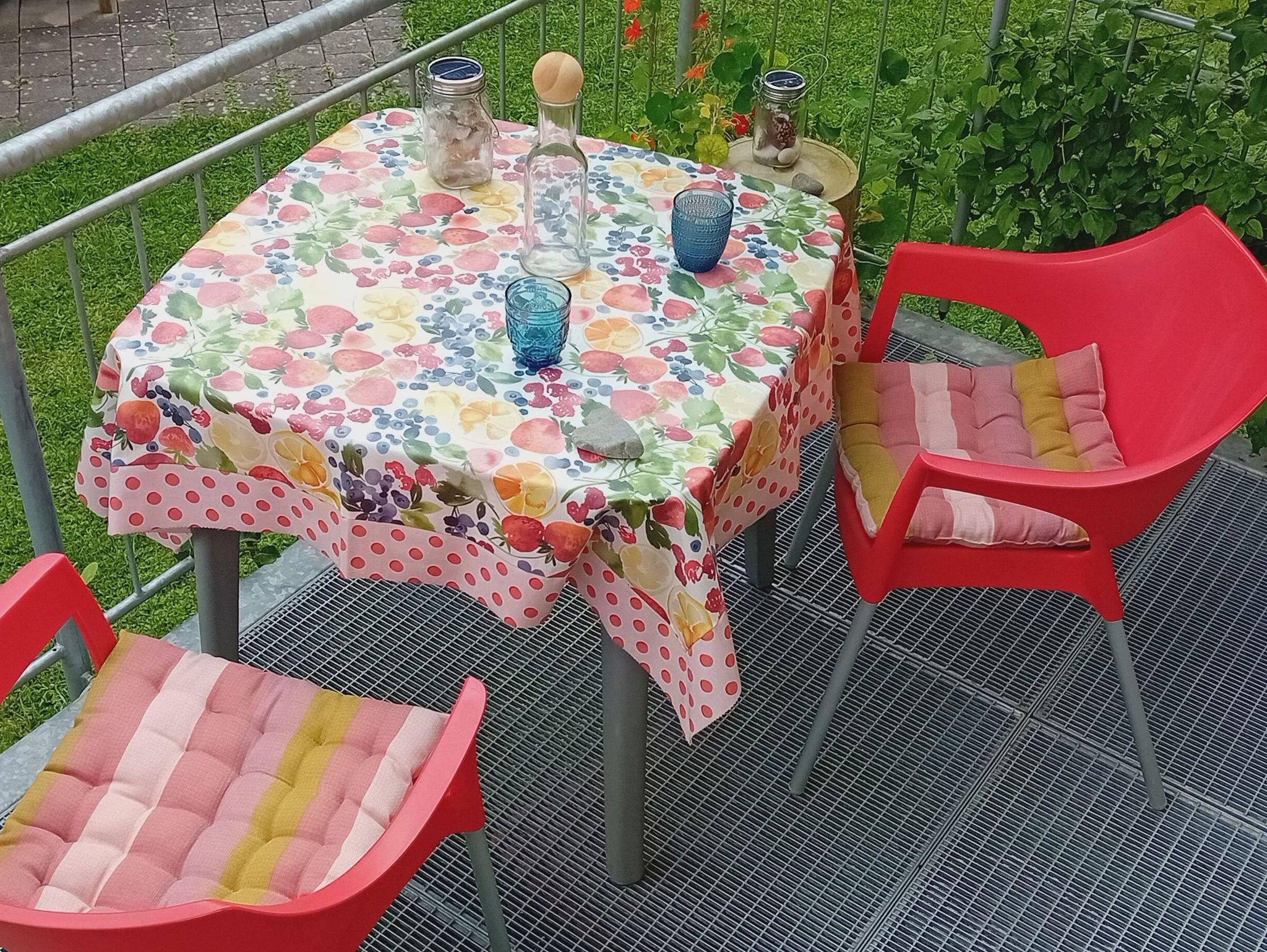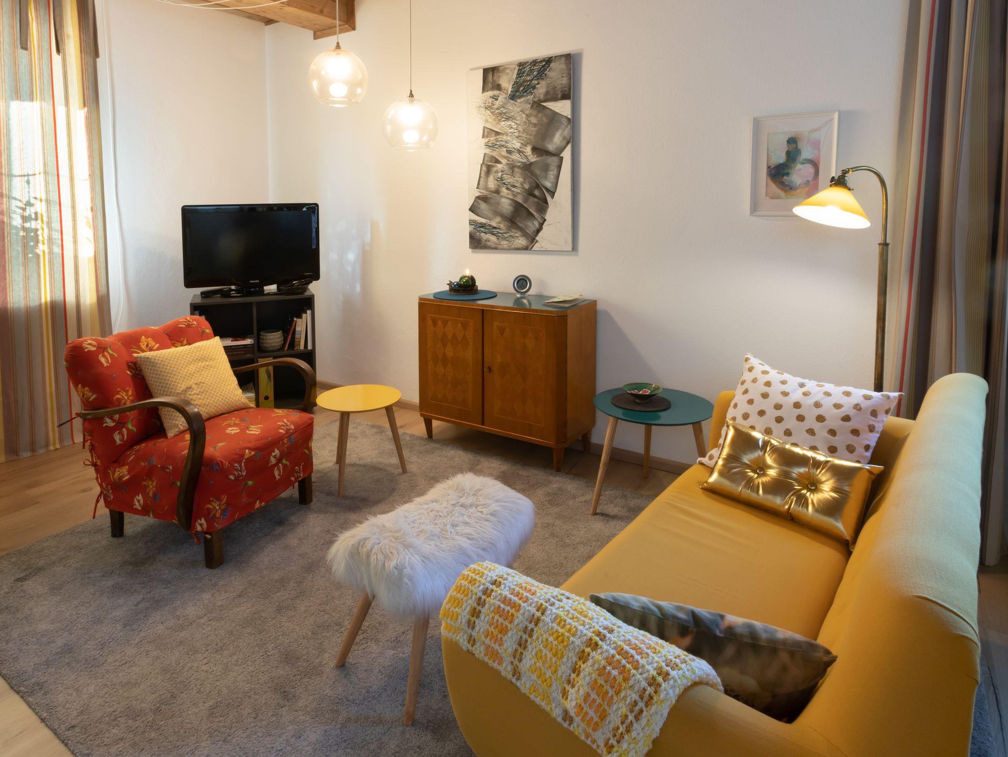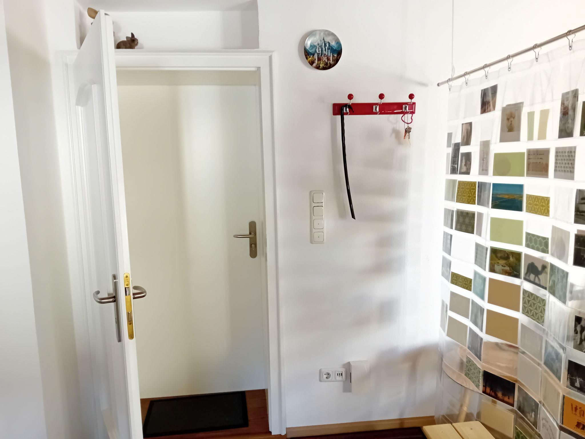 Die Ferienwohnung liegt im Hochparterre eines traditionellen Hauses mit drei Parteien. Von der Terrasse geht der Blick in den Garten und auf den Buchenwald des Herrnberg.