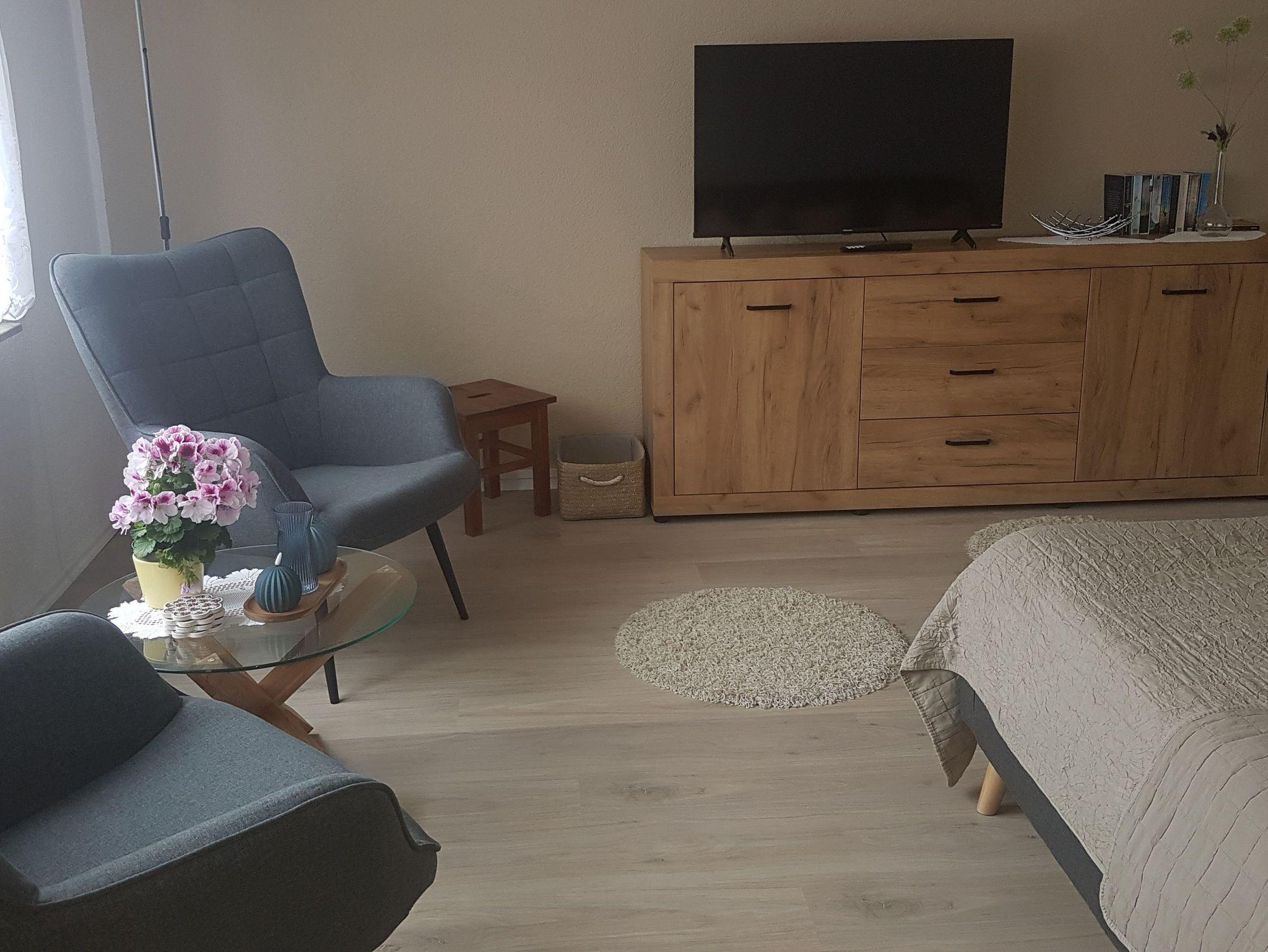 Die Ferienwohnung hat eine Wohnfläche von ca. 40 qm und verfügt über einen kombinierten Wohn- und Schlafraum sowie einer separaten Küche und einem Bad mit ebenerdiger Dusche. Sie ist 2024 renoviert und im Wohn-/Schlafbereich mit neuem Mobiliar ausgestattet.