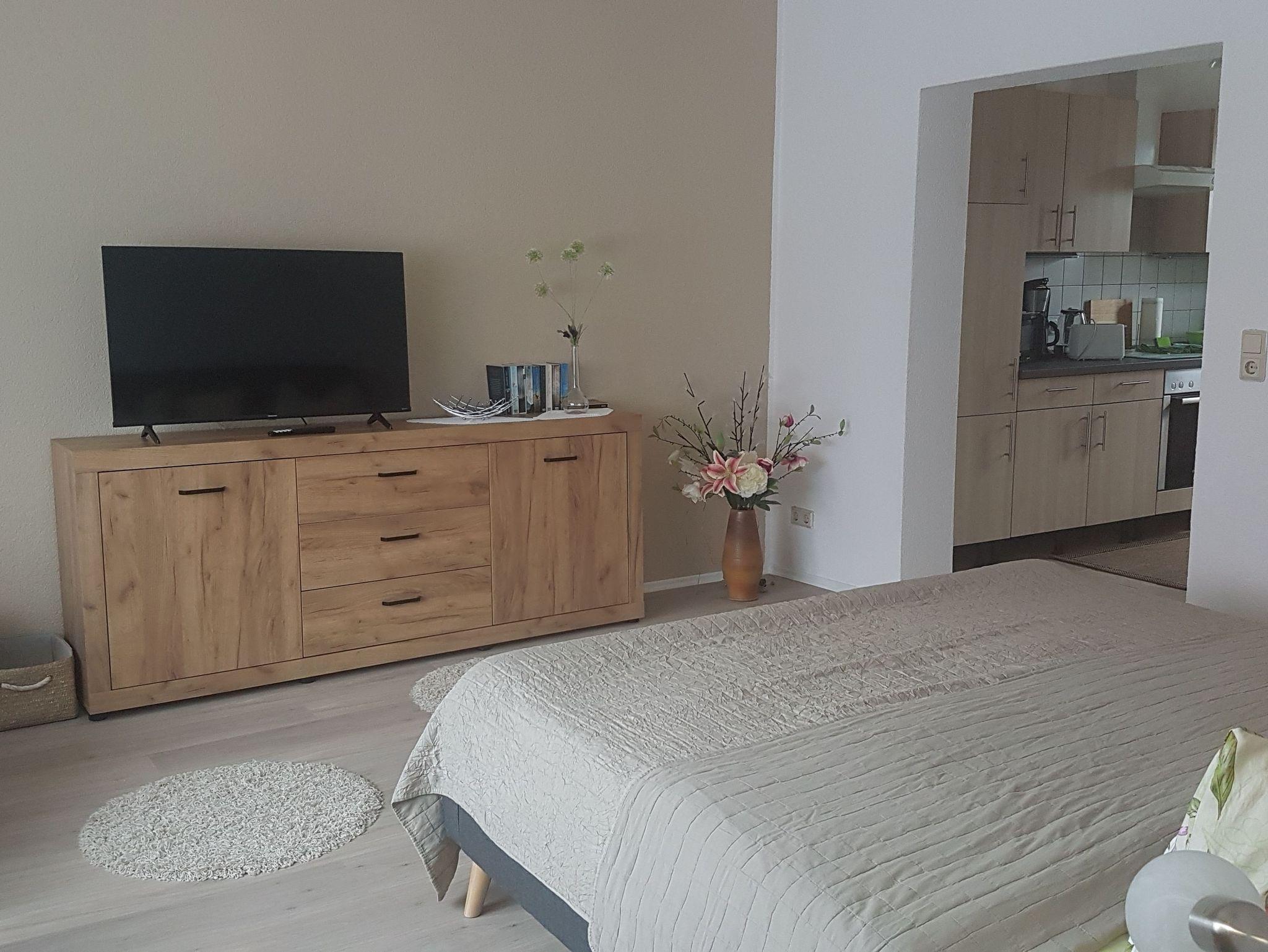 Im kombinierten Wohn- und Schlafraum steht ein großes Doppelbett , ein kleiner Tisch mit 2 bequemen Sesseln sowie ein große Anrichte, auf der sich ein Flachbild-TV befindet und es Ihnen ermöglicht, bequem vom Bett aus, vor dem schlafen noch einen Film gucken zu können - der Bodenbelag ist mit Laminat ausgestattet. Die Küche und das Bad sind mit Fliesenboden versehen.