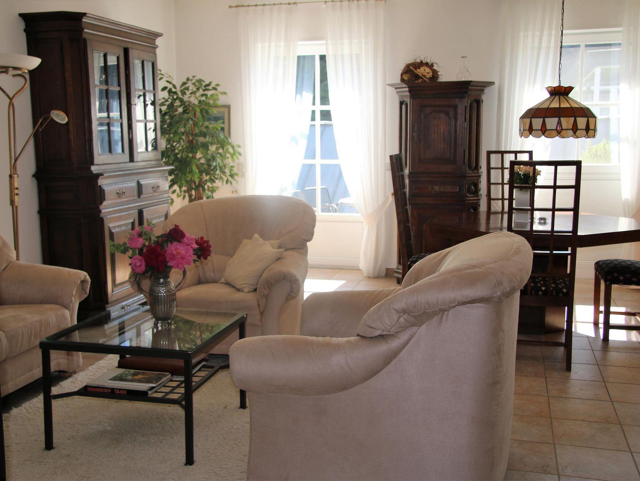 81 m² große Ferienwohnung (Nichtraucher) mit Terrasse bzw. Balkon, individuell und komfortabel gestaltet und eingerichtet, 2 separate Schlafzimmer, Bad mit Badewanne und separater Dusche, Fön, Sat-TV, Radio, CD-Player, Telefon, Kaminofen, Küche mit Backofen, Herd, Spülmaschine, Microwelle, Bettwäsche, Bademäntel und Handtücher inkl. bei Bedarf, - nach Absprache und gegen Gebühr Waschmaschine und Trockner.