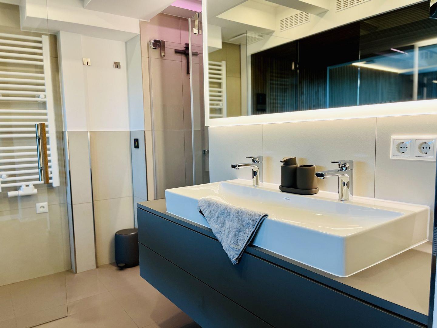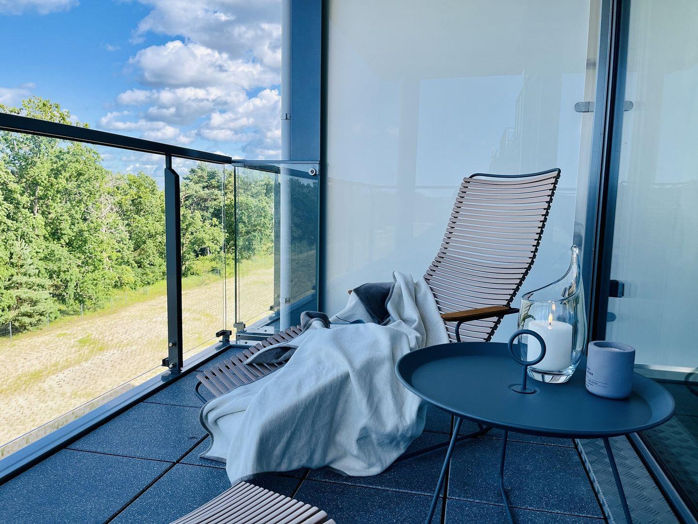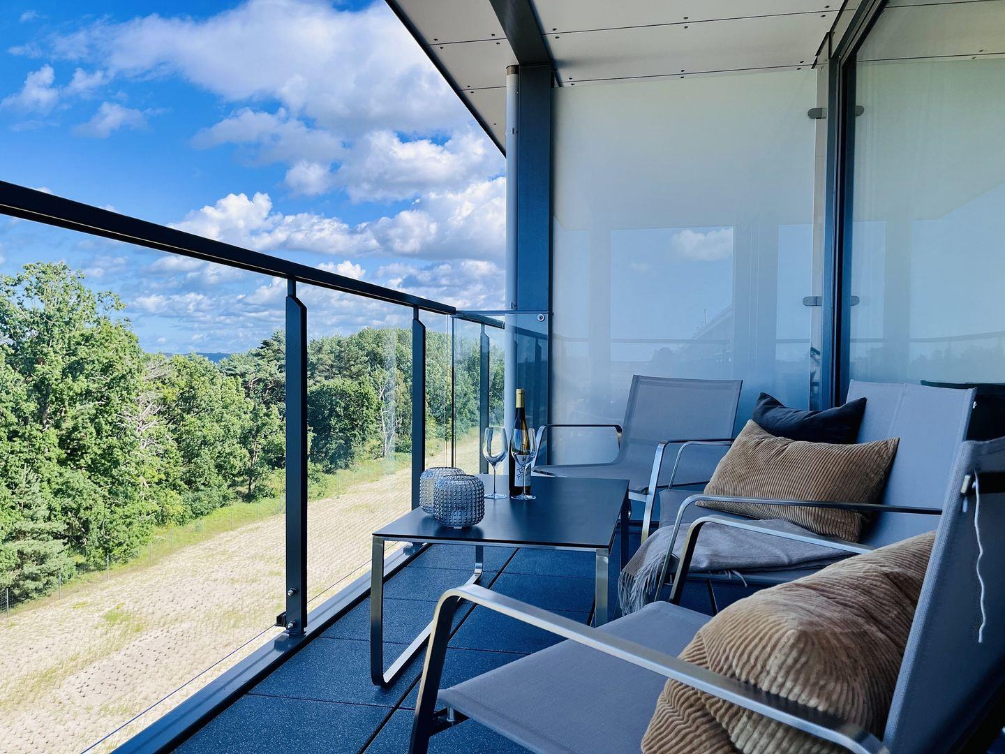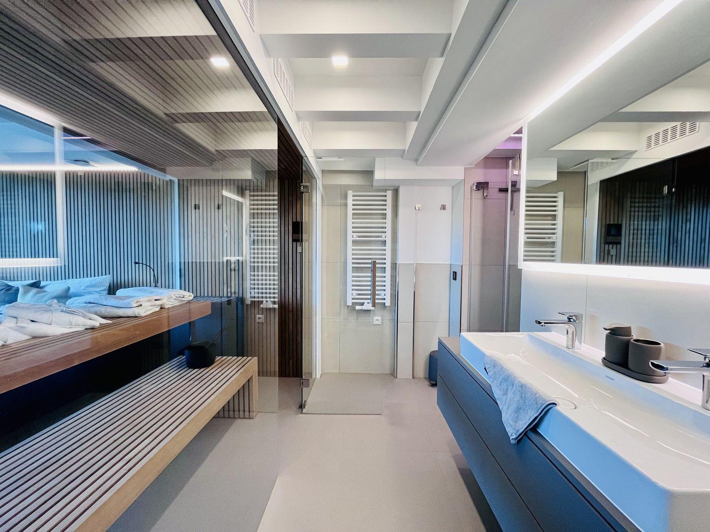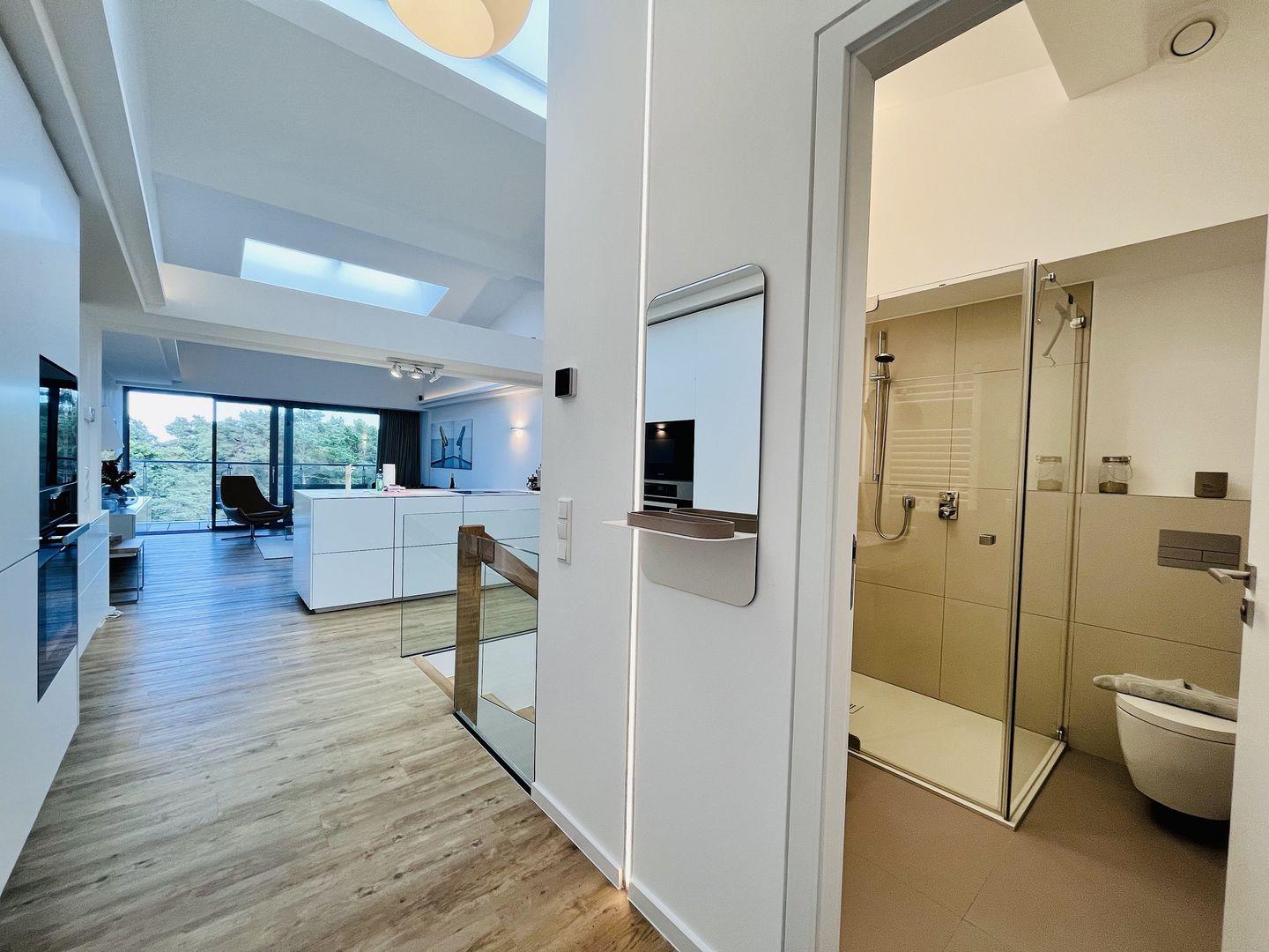 Das Maisonette-Appartement "Purbaltic" ist ein neu fertiggestelltes Juwel im 5. und 4. Obergeschoss von Haus Zudar in Prora. Mit 104 m² bietet es einen sonnigen Rückzugsort mit moderner Einrichtung und direktem Strandzugang. Zwei Schlafzimmer mit hochwertigen Doppel-Boxspringbetten und OLED-TVs bieten Komfort. Das Hauptschlafzimmer verfügt über eine luxuriöse Design-Sauna mit Blick auf die Ostsee und die Düne, während das zweite Schlafzimmer einen großzügigen Schreibtisch bietet. Kostenloses Internet und ein Stellplatz sind inklusive. Die voll ausgestattete Design-Küche, der Essbereich und der gemütliche Wohnbereich bieten einen herrlichen Blick auf die Terrasse, Kiefern und Ostsee. Zwei Balkone, einer mit Sitzgelegenheiten und einer mit Relaxliegen, laden zum Entspannen ein. Waschmaschine und Trockner sind ebenfalls vorhanden.