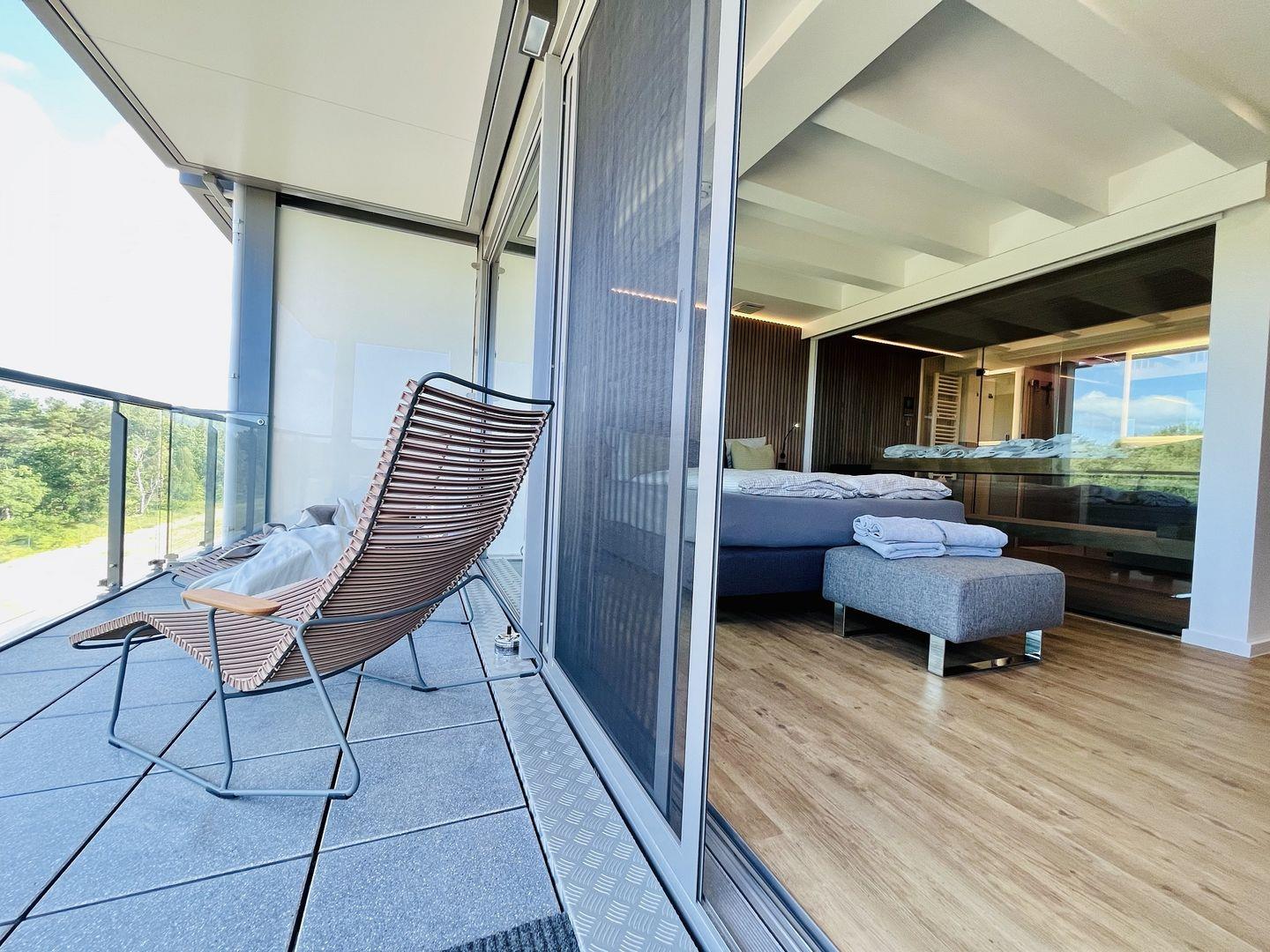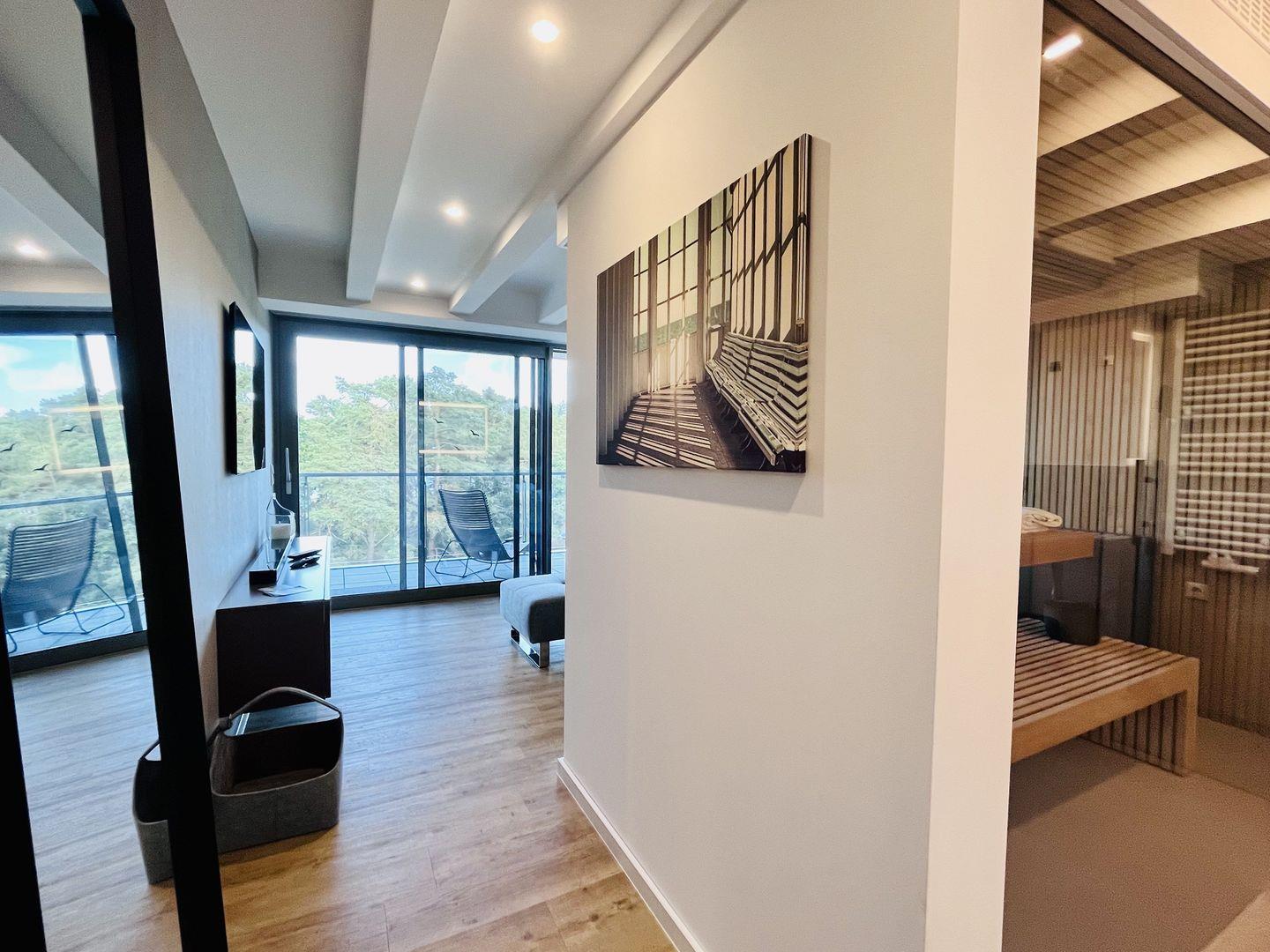 Das 2022 neu fertiggestellte Maisonette-Appartement "Purbaltic" befindet sich im 5. und 4. Obergeschoss von Haus Zudar in Prora. Die Wohnung ist 104 m² groß und befindet sich nur 100 m mit direktem Zugang vom Strand entfernt. Die Wohnung bietet eine helle, moderne Einrichtung. Das Appartement hat 2 Schlafzimmer mit hochwertigen Doppel-Boxspringbetten. Das Hauptschlafzimmer ist mit einer luxuriösen Design-Sauna ausgestattet, die einen direkten Blick auf die Ostsee sowie die Düne bietet.
