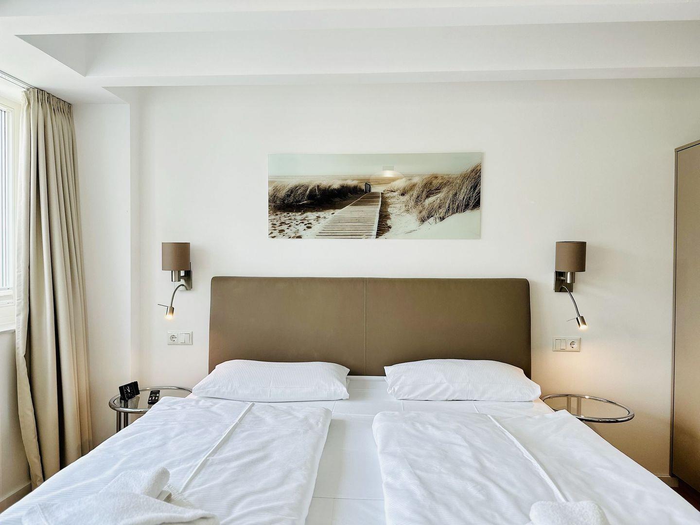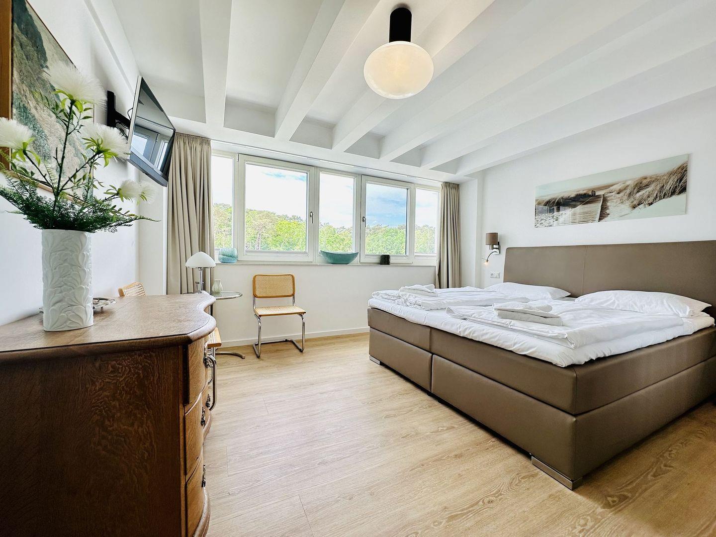 In beiden Schlafzimmern dieser Rügen Ferienwohnung befinden sich hochwertige Boxspringbetten, die Sie in den Schlaf schweben lassen, um Ruhe und Kraft zu tanken und den neuen Tag ausgeschlafen und erholt zu beginnen. Sie sind jeweils ausgestattet mit Flatscreen SmartTV-Geräten, sodass Sie auch vom Bett aus einem guten Film ansehen können. Für eine besonders ungestörte Nachtruhe besteht die Möglichkeit, die Fenster in beiden Schlafzimmern komplett zu verdunkeln. Durch die Fliegengitter im Fenster können Sie zudem Ihre Nachtruhe genießen, ohne von lästigen Blutsaugern gestört zu werden. Die Nach Belieben austauschbaren Vier-Jahreszeitenbetten sind allergikerfreundlich.