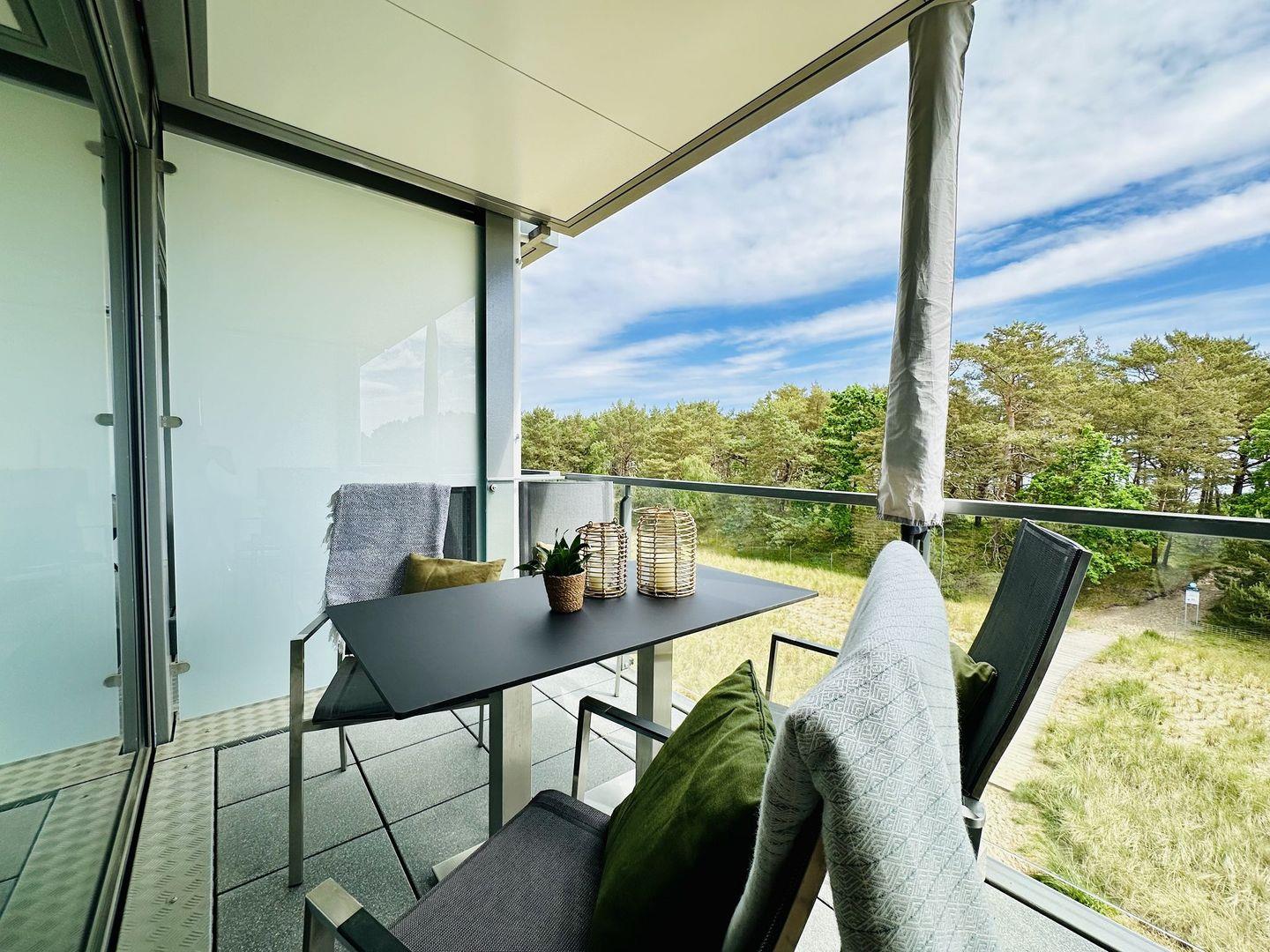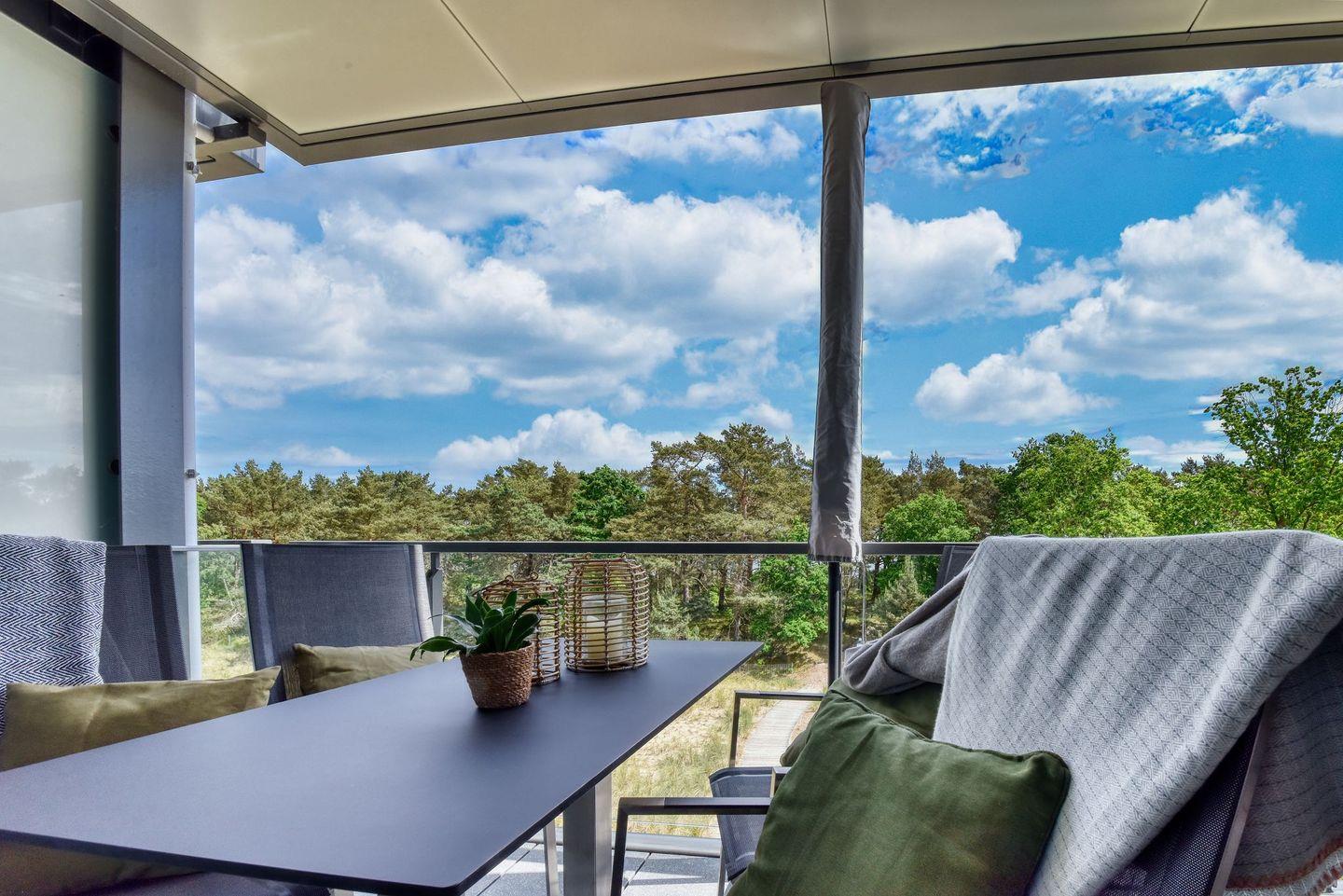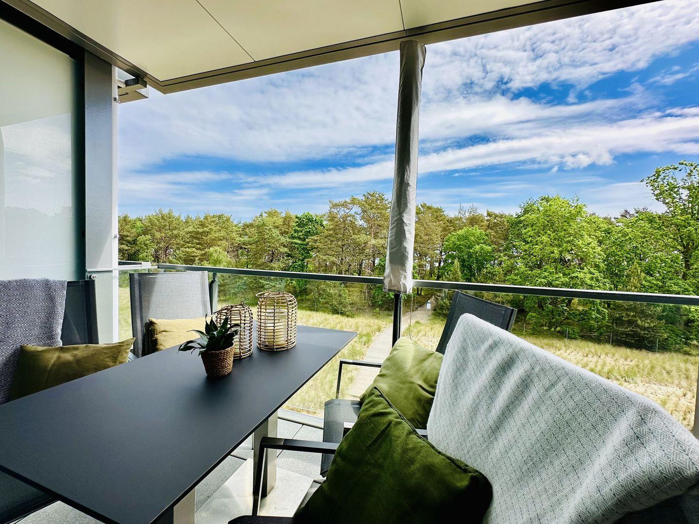 Eintreten und erholen! Den Blick schweifen lassen durch die raumbreiten Panoramafenster mit traumhaftem Blick über die Dünenlandschaft durch das Kiefernwäldchen aufs Meer, als wäre man selbst Teil der Natur. Und dann wenige Meter durch den eigenen Strandzugang über die Düne an einen der längsten und feinsten Sandstrände der Ostsee.