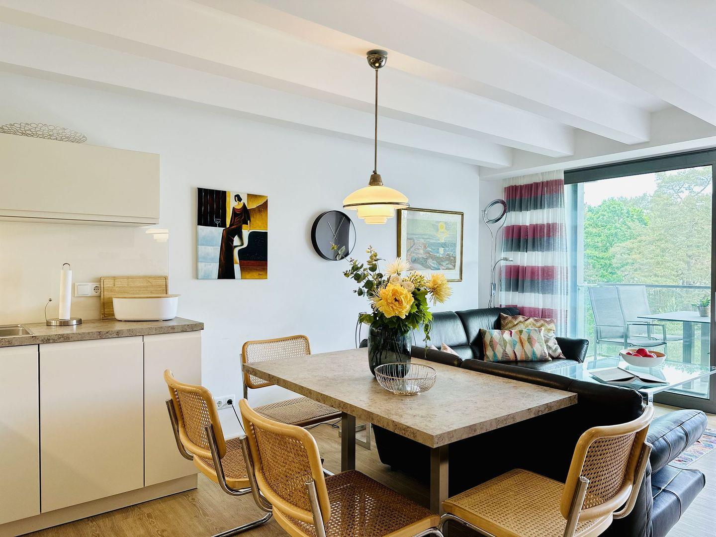 Zum Abendessen können Sie viele unterschiedliche Restaurants in unmittelbarer Umgebung besuchen. Oder Sie laufen über die Seepromenade nach Binz und stürzen sich dort ins bunte Treiben. Sie können es sich aber auch einfach in Ihrer Wohnung bequem machen und in der schönen, hochwertig und umfangreich ausgestatteten Küche etwas kochen. Der kombinierte Wohn-/Essbereich lädt zum geselligen Beisammensein ein. Ein besonderes Highlight ist die „Lounge“ im Eingangsbereich, wo Sie die hereinscheinende Abendsonne bei einem Cocktail oder guten Glas Wein genießen und den Tag ausklingen lassen können.