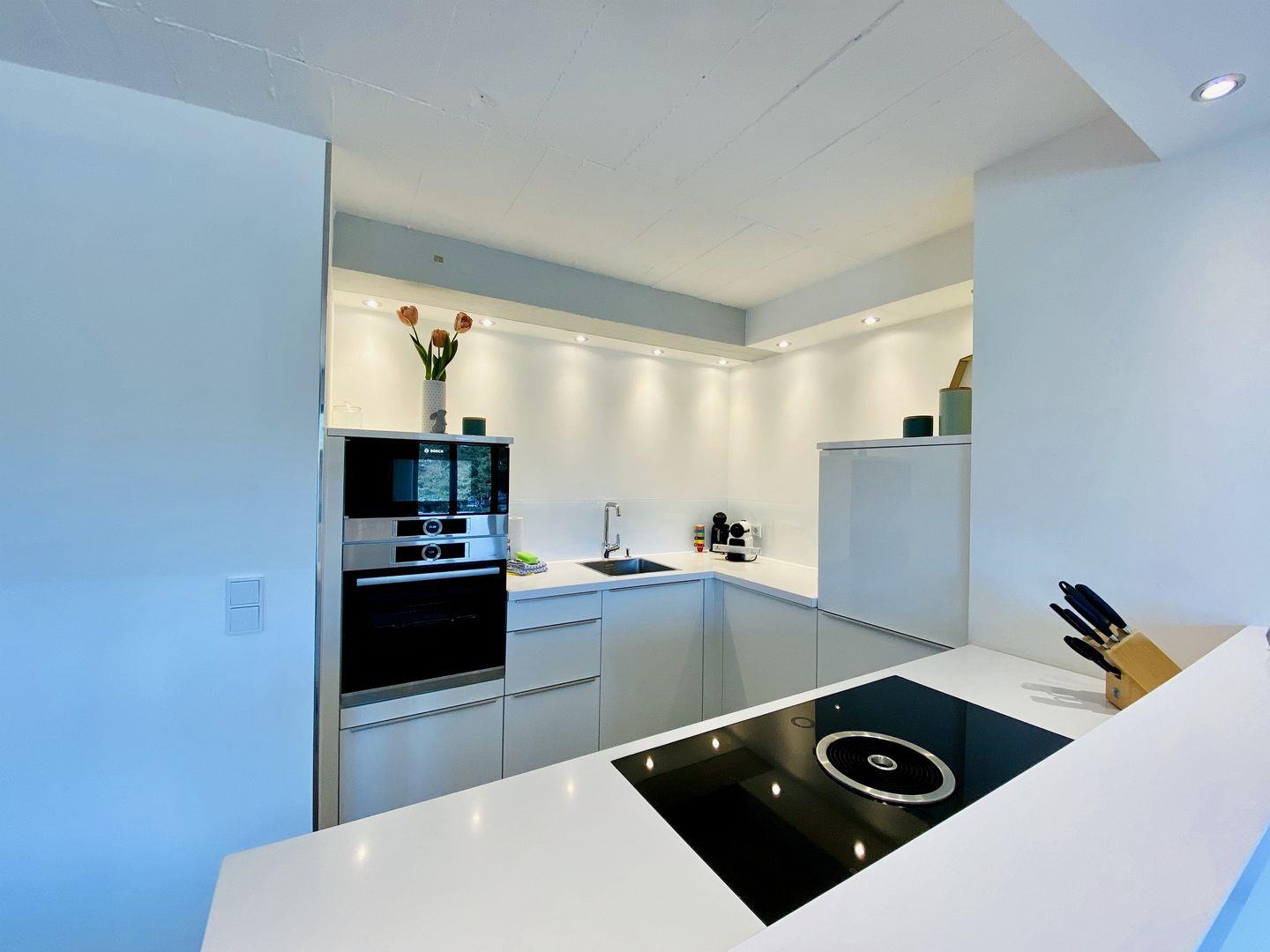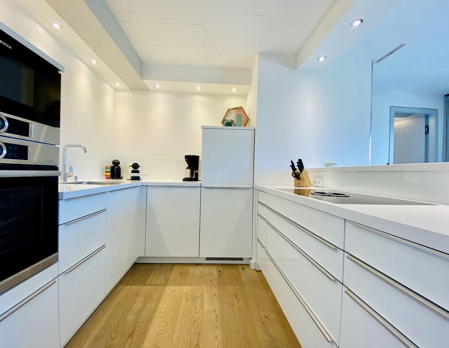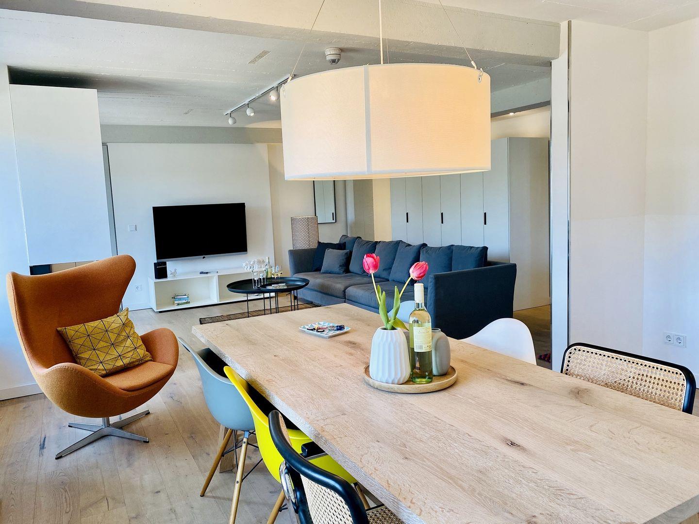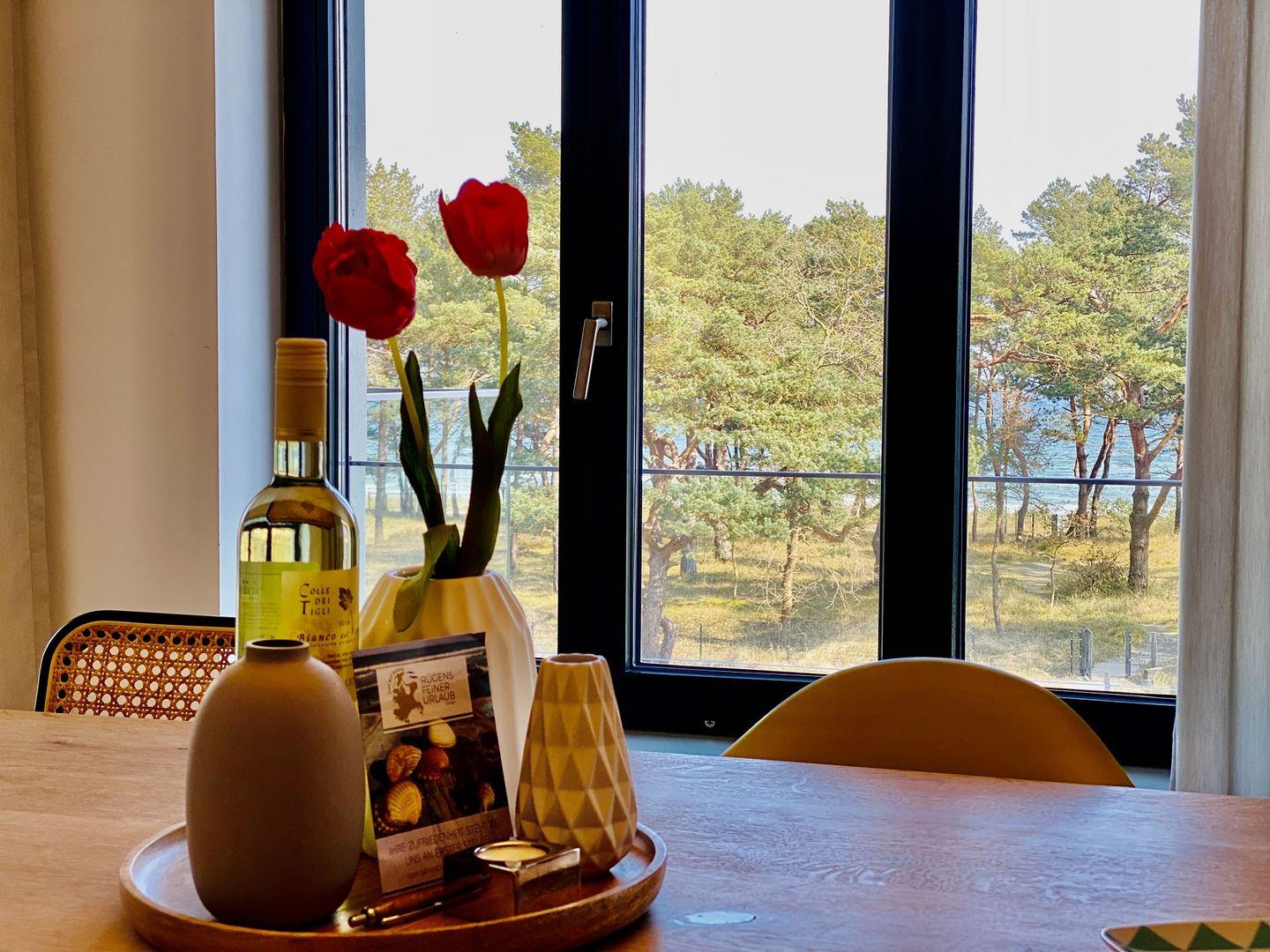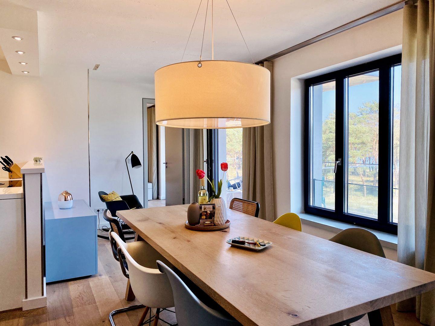Der Fahrstuhl bringt Sie direkt in die dritte Etage der Düne 7. Ein wunderschönes und großzügiges Meerblick-Appartement in stilvollem Design wartet hier auf Sie. Auf 105 m² können es sich bis zu vier Personen und ein Kind richtig gut gehen lassen, gemeinsam den Urlaub genießen und eine unvergesslich schöne Zeit auf der Insel Rügen verbringen. Die Einrichtung der 3-Raum-Wohnung besticht durch ihre schlichte und moderne Eleganz. Nordisches Design und dezente Accessoires vermitteln Wohnlichkeit, die jeden Gedanken an Stress vergessen lässt. Die offene und helle Wohnungsdecke ist im Stil der Vergangenheit belassen und etwas ganz Besonderes. Das große Wohnzimmer hat bodentiefe Balkonfenster Richtung Meer und Richtung Süden, die viel Licht ins Innere der Ferienwohnung lassen. Ein stylischer Gas-Kamin sorgt für Wärme und kuschelige Behaglichkeit. Auf dem gemütlichen Dreisitzer-Sofa und in den beiden bequemen Sesseln haben Sie beste Plätze für ruhige Abende und beruhigende Blicke durch die Kiefernschonung hindurch auf den hauseigenen Pool, den Strand und das Meer. Treten Sie hinaus auf den Balkon und genießen Sie den Blick auf die Ostsee und lauschen Sie dem Toben der Wellen und den Schreien der Möwen. In diesem Urlaubsdomizil entspannen Sie mit allen Sinnen. In der voll ausgestatteten Eckküche finden Sie alles, was das Herz begehrt. Hochwertige Markengeräte von Bosch und WMF, erlesenes Geschirr – da wird das Kochen zu einem richtigen Urlaubs-Event. Essen können Sie am wunderschönen, filigranen weißen Tisch auf komfortablen Lederstühlen. Für Kaffeeliebhaber bietet die Küche eine Kaffeefiltermaschine und eine Nespressomaschine inklusive einiger Starter-Kapseln für den ersten Kaffeegenuss am Anreisetag.