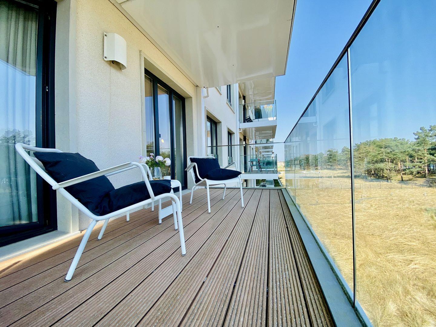 Im Masterbad wartet zudem eine kleine Wellness-Oase darauf, Ihnen noch mehr Entspannung zu verschaffen. Eine klassische Sauna von der Firma RUKU ist der ideale Ort, sich an ungemütlichen Tagen die Zeit zu verschönern – besonders nach einem stürmischen Strandspaziergang. Auch Ablagemöglichkeiten gibt es in den Zimmern reichlich. Ein Schlafzimmer hat Zugang zu einem der beiden Seeblick-Balkone, die zu dieser Wohnung gehören.