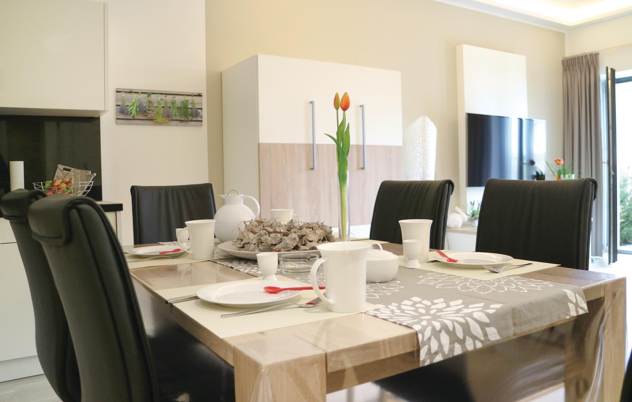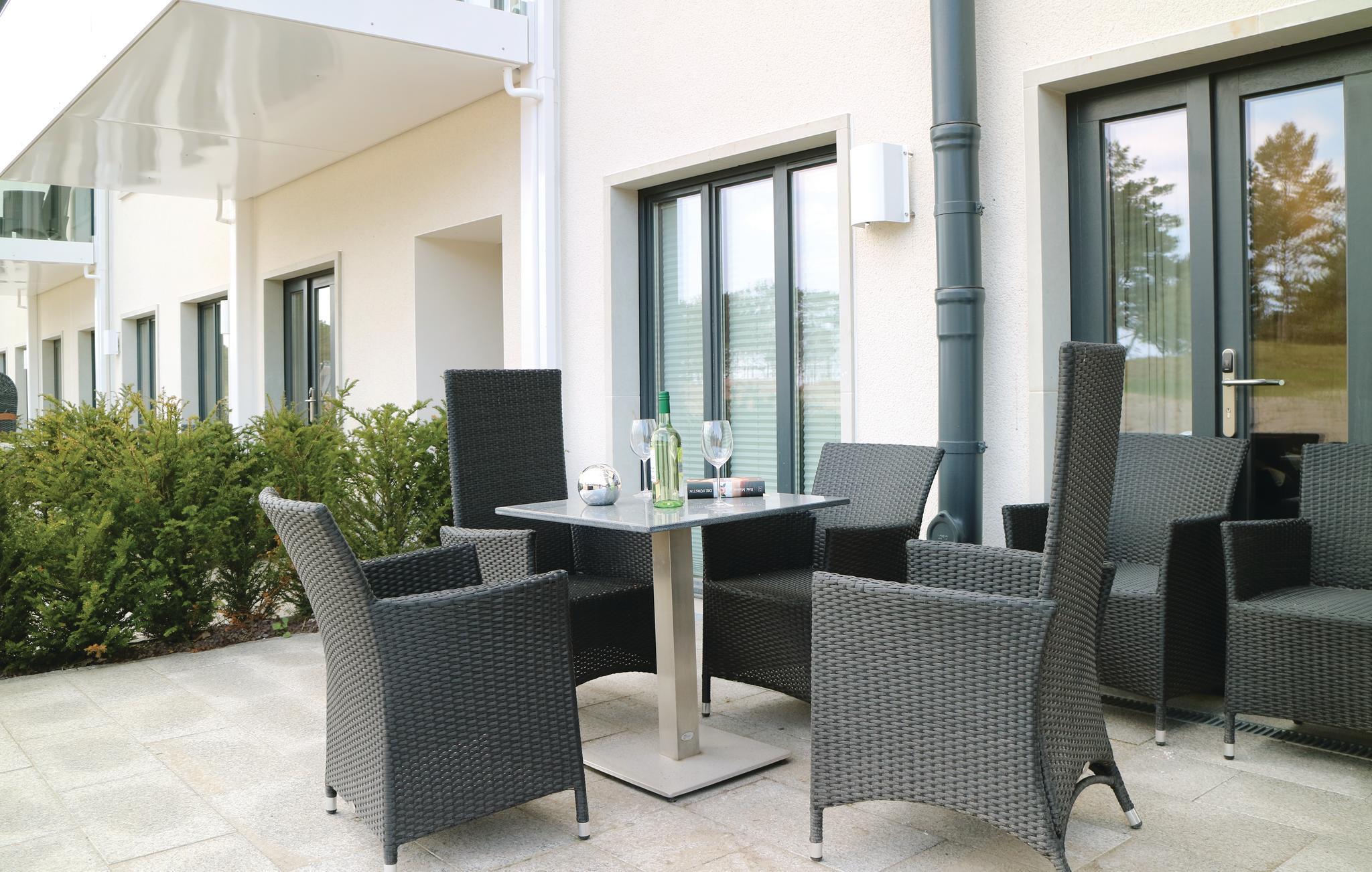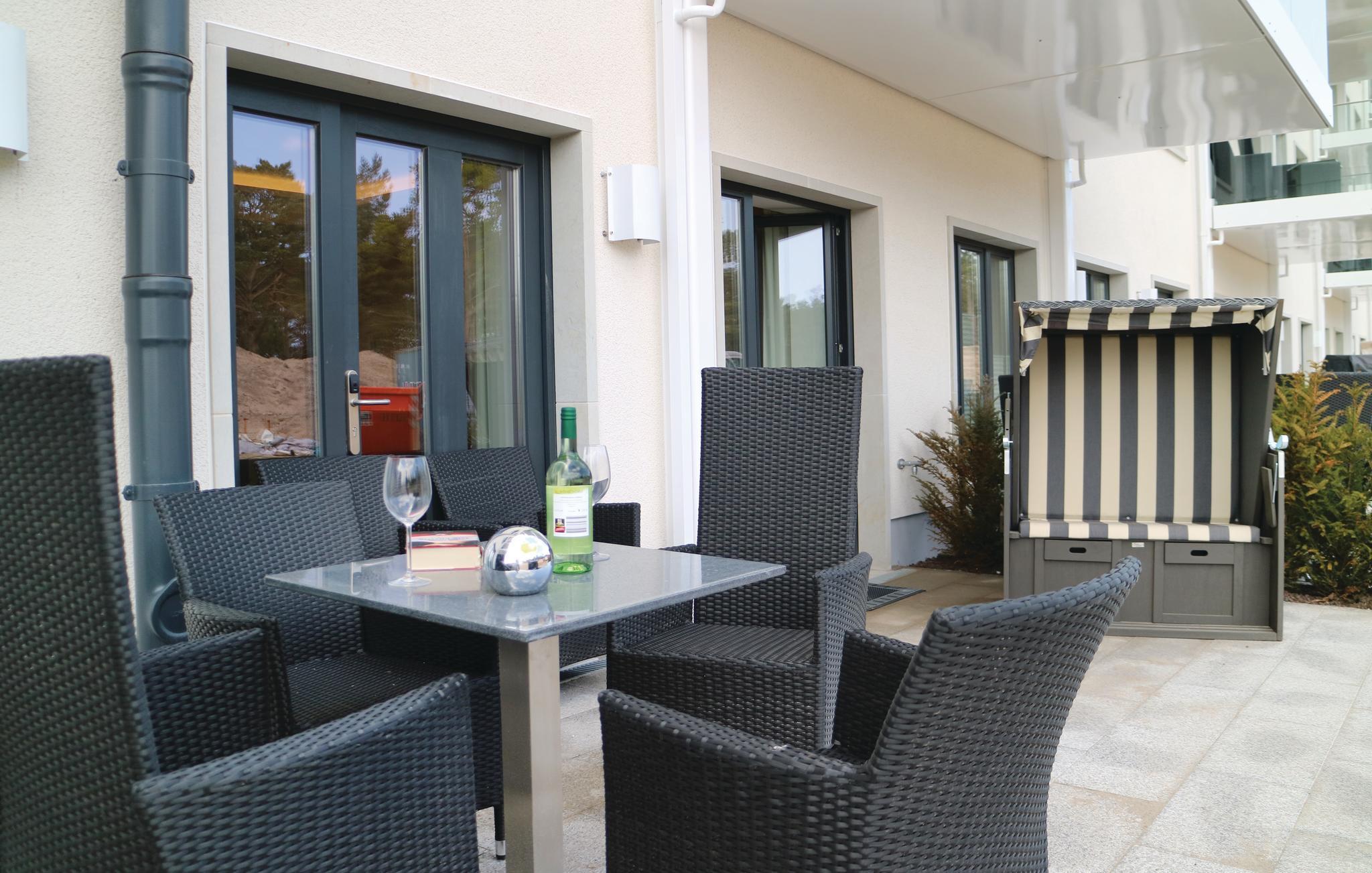 Soveværelset er udstyret med en særdeles luksuriøs dobbeltseng (2 x 2 m) af høj kvalitet og eget tv. Dertil byder lejligheden på sovemulighed for yderligere tre gæster i det næsten 30 m² store boligområde med en komfortabel sovesofa og en skabsseng. På lejlighedens store, private terrasse har I moderne havemøbler, en parasol og en strandkurv til rådighed og kan tilbringe afslappede timer i Østersøens rare luft. Der mangler intet i det veludstyrede køkken, hvor det er nemt at lave et lækkert feriemåltid. Alle der holder af kaffe, kan glæde sig til deres yndlingsversion fra Nespressomaskinen (tag selv kaffekapsler med).