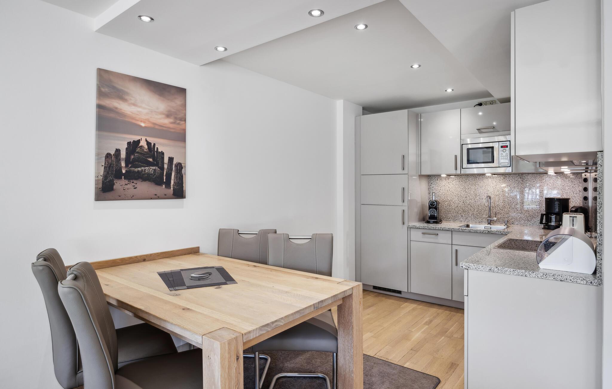 Denne ferielejlighed af typen "Junior" byder på næsten 60 m² plads til op til 6 personer, da der både i den generøse, lyse stue samt i garderobeværelset er mulighed for at folde en sofa ud til en komfortabel sovemulighed. Garderobeværelset er adskilt fra gangen med en moderne skydedør. De eksklusive møbler er udvalgt med stor omhu, og udtrykket virker elegant og harmonisk. Intet ved indretningen er overladt til tilfældighederne, og der er lagt vægt på et godt indeklima samt allergivenlige materialer. Især i det store soveværelse venter der meget komfort på jer, også takket være jeres separate garderobeværelse, eget tv og den enorme seng på 2 x 2 m. På altanen kan I tilbringe afslappede timer i Østersøens rare luft. Herfra kan I nyde en storslået udsigt over haven, fyrreskoven og Østersøen. Der mangler intet i det veludstyrede køkken, hvor det er nemt at lave et lækkert feriemåltid. Alle der holder af kaffe, kan glæde sig til deres yndlingsversion fra Nespressomaskinen (tag selv kaffekapsler med).