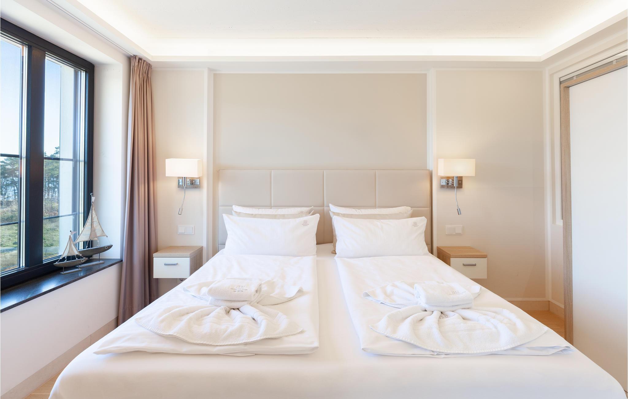 På over 40 m² kan I finde alt, som I har brug for i disse luksuriøst udstyrede lejligheder. Det generøse, åbne stueområde gennemstrømmes af lys fra de store vinduespartier, og I har udsigt over den lille fyrreskov og helt til Østersøens turkisblåt vand. Igennem to store døre kan I træde ud på den næsten 10 m² store altan med havemøbler af høj kvalitet. Ren afslapning. Der er eget tv i det særskilte soveområde, der er adskilt fra stuen med en moderne skydedør. Sofaen i stuen kan blive foldet ud til to komfortable sovemuligheder (1,60 x 2,00 m).