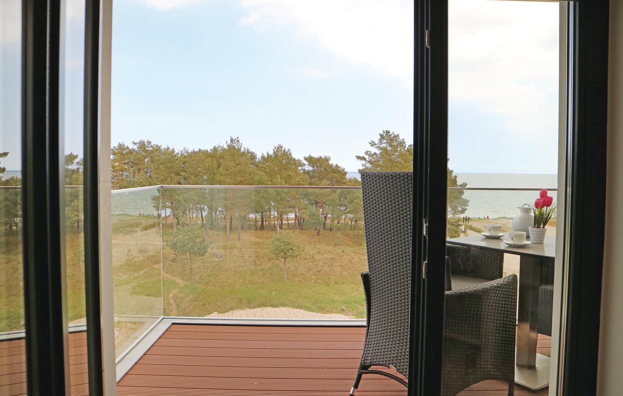 På over 40 m² kan I finde alt, som I har brug for i disse luksuriøst udstyrede lejligheder. Det generøse, åbne stueområde gennemstrømmes af lys fra de store vinduespartier, og I har udsigt over den lille fyrreskov og helt til Østersøens turkisblåt vand. Igennem to store døre kan I træde ud på den næsten 10 m² store altan med havemøbler af høj kvalitet. Ren afslapning. Det særskilte soveområde er adskilt fra stuen med en moderne skydedør. Sofaen i stuen kan blive foldet ud til to komfortable sovemuligheder (1,60 x 2,00 m).