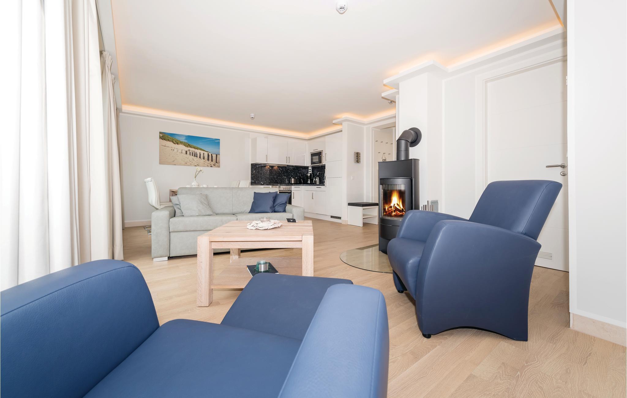 Fra den lyse, åbne stue, er der adgang til jeres private altan på ca. 10 m², hvorfra der er en betagende udsigt ud over den lille strandskov til Østersøen. Når I har gået en lange tur i den friske luft, så tænd op i kaminen i stuen og mærk varmen der hurtigt breder sig og skaber en særlig hygge. Naturligvis har I også kompleksets store wellnessområde i stueetagen med indendørs pool og flere saunaer til rådighed.