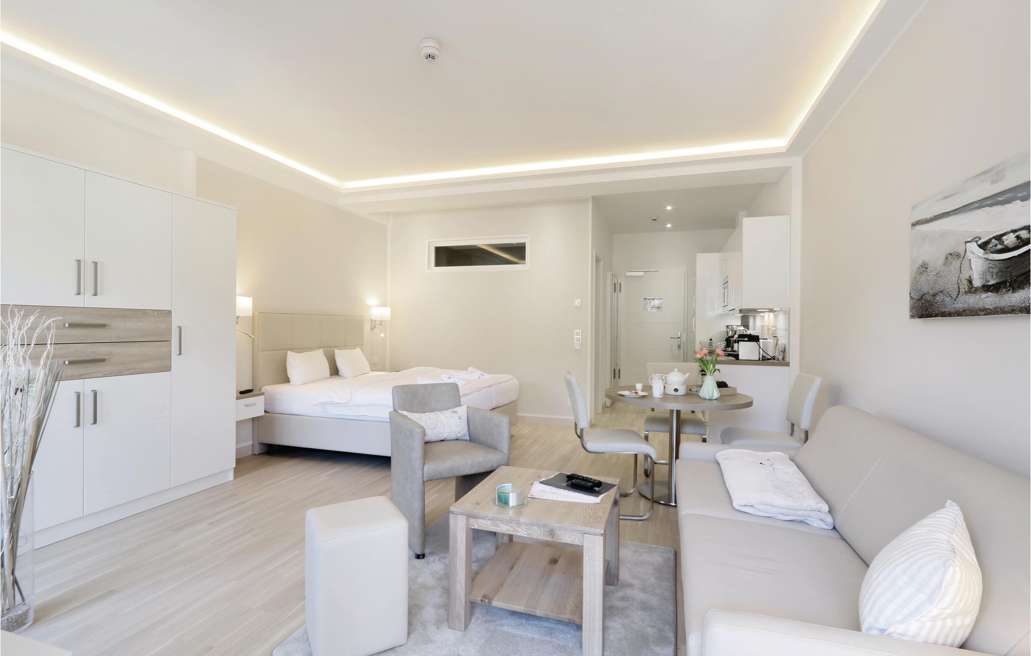 Denne eksklusive etværelseslejlighed er den perfekte bolig til en drømmeferie for to på den smukke ø Rügen. Lejligheden er raffineret indrettet, så I kan finde alt, som I har brug for på lidt plads: Det praktiske køkkenhjørne med spisebord, soveområde med boksmadras af høj kvalitet, et hyggeligt, lyst dagligområde og naturligvis lejlighedens highlight, jeres egen terrasse tæt på stranden.