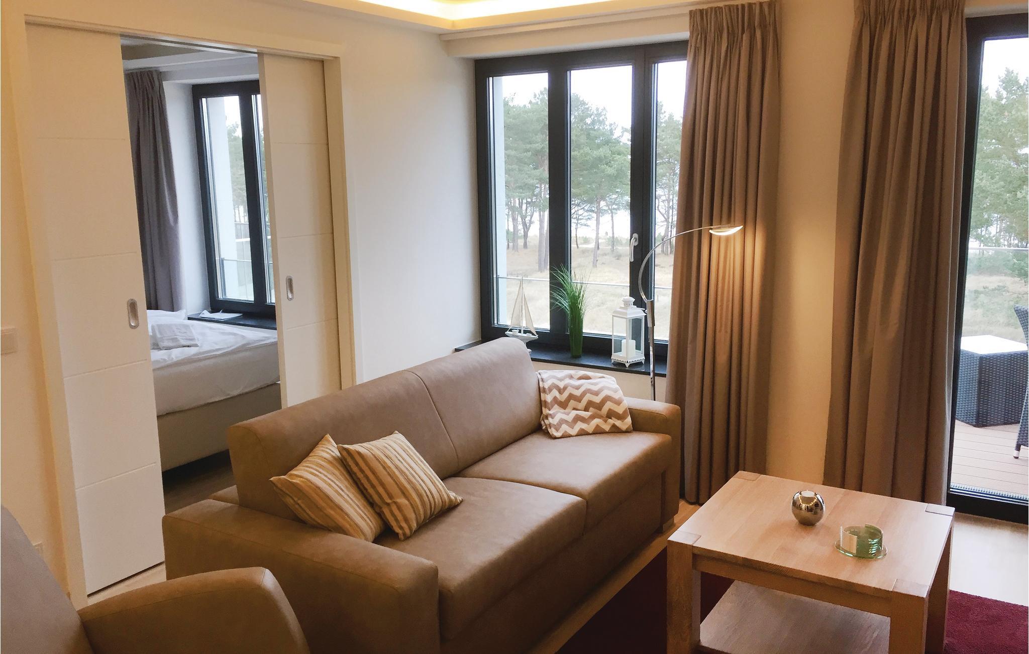 På over 40 m² kan I finde alt, som I har brug for i disse luksuriøst udstyrede lejligheder. Det generøse, åbne stueområde gennemstrømmes af lys fra de store vinduespartier, og I har udsigt over den lille fyrreskov og helt til Østersøens turkisblåt vand.