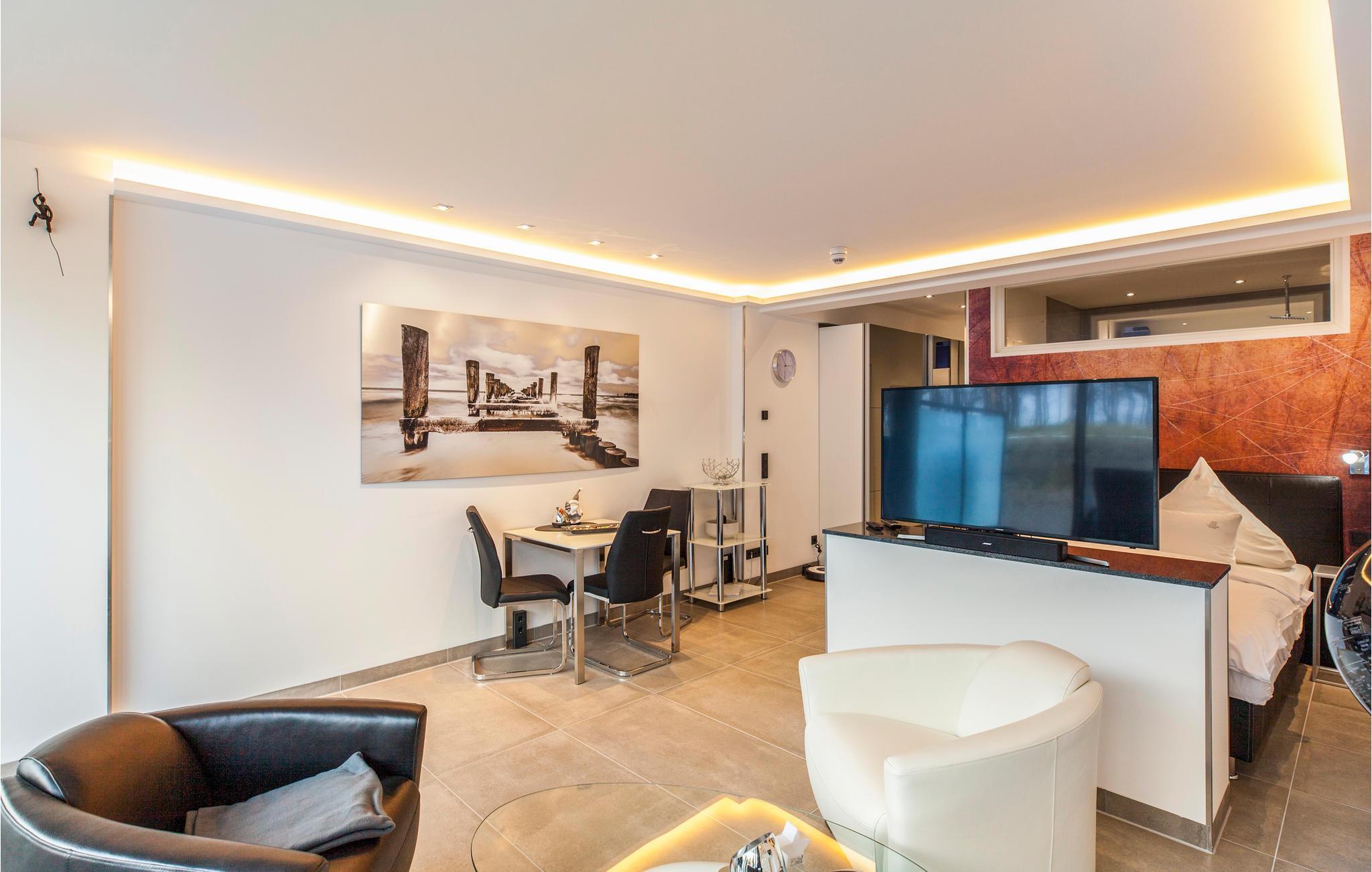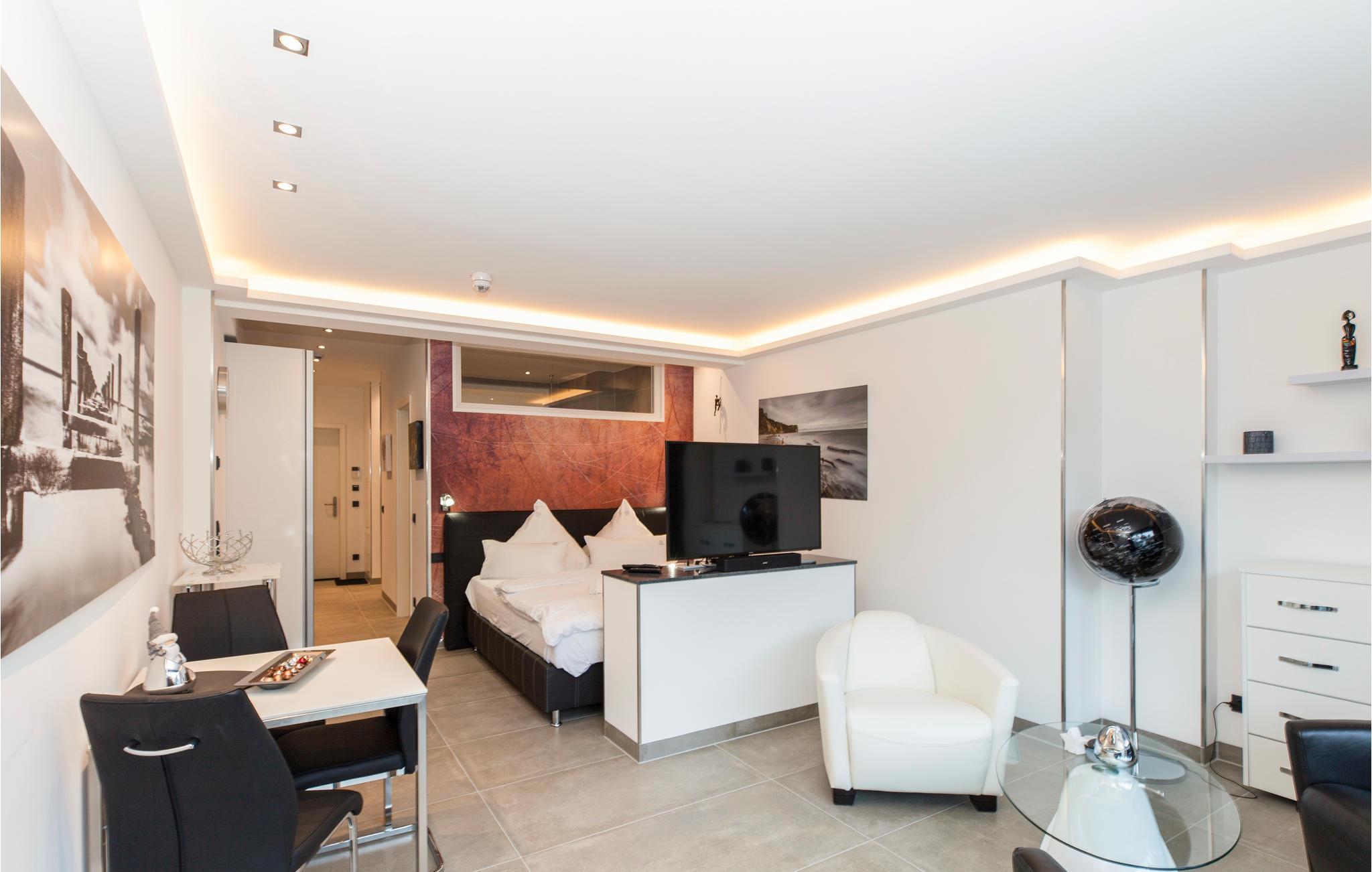 Det højkvalitets og allergivenlige "Panorama Studio" ligger i stueetagen og lige ud til siden af ??udendørspoolen. På terrassen kan I nyde morgenmad med udsigt over poolen og med lidt held endda høre havets brusen, mens I nyder de første solstråler. Etværelseslejligheden kombinerer søvn, madlavning og ophold i ét rum. Ud over den komfortable dobbeltseng er der en ekstra soveplads på den udtrækkelige seng. Tekøkkenet er af høj kvalitet og fuldt udstyret, så I ikke mangler noget på jeres ferie. Der er opvaskemaskine, fryser og kaffemaskine til rådighed. Kaffeelskere vil sætte pris på den ekstra Nespresso-maskine (medbring venligst jeres egne kapsler).