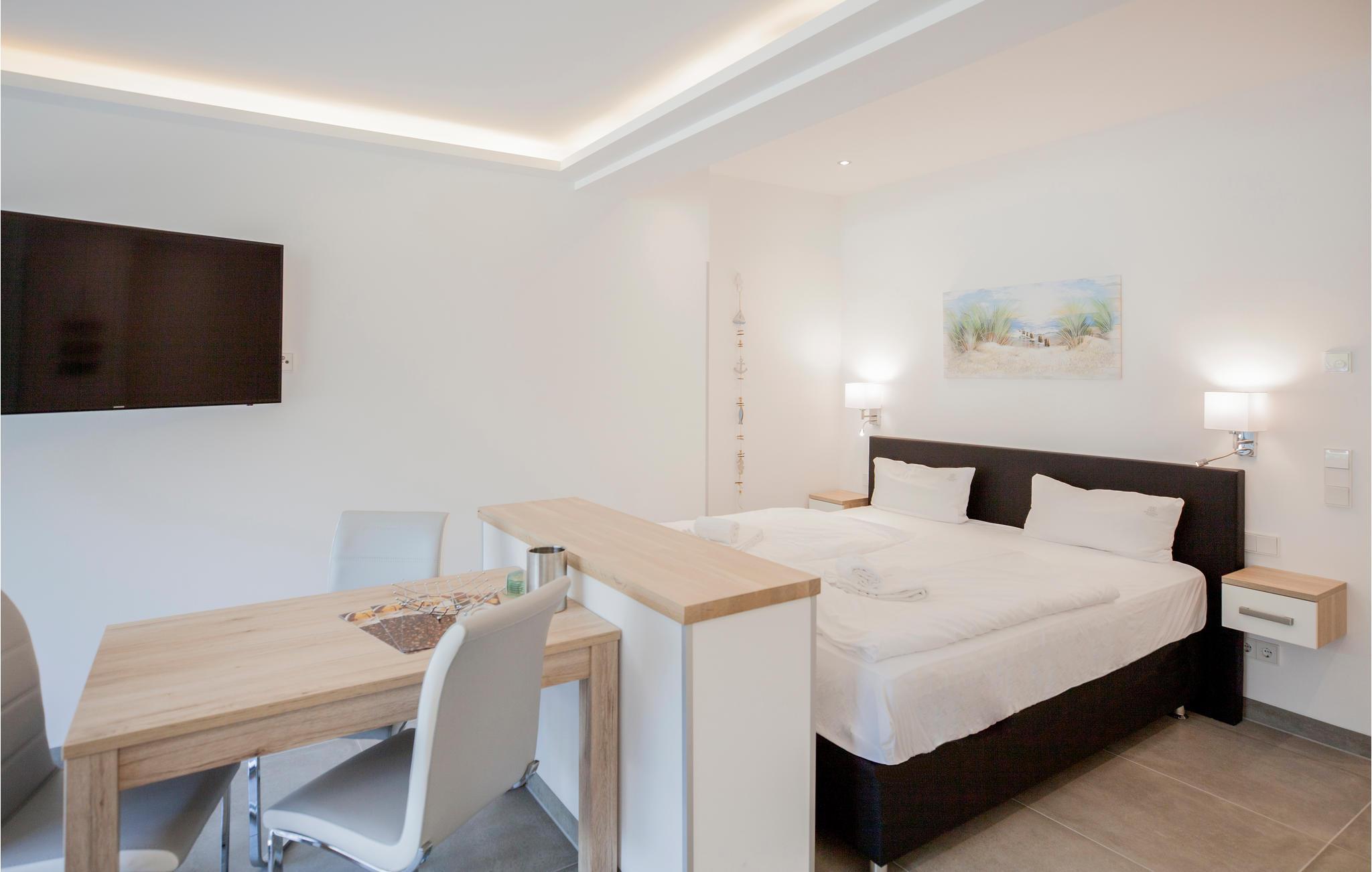 Det højkvalitets og allergivenlige "Panorama Studio" ligger i stueetagen og lige ud til siden af ??udendørspoolen. På terrassen kan I nyde morgenmad med udsigt over poolen og med lidt held endda høre havets brusen, mens I nyder de første solstråler. Etværelseslejligheden kombinerer søvn, madlavning og ophold i ét rum. Ud over den komfortable dobbeltseng er der en ekstra soveplads på sovesofaen. Tekøkkenet er af høj kvalitet og fuldt udstyret, så I ikke mangler noget på jeres ferie. Der er opvaskemaskine, fryser og kaffemaskine. Kaffeelskere vil sætte pris på den ekstra Nespresso-maskine (medbring venligst jeres egne kapsler).