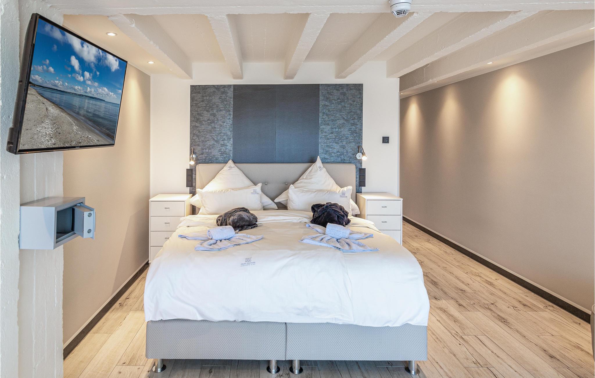 Lejligheden ligger i det historiske feriekompleks Prora, der blev påbegyndt i 1936. I dag er det omdannet til et moderne feriested og inviterer jer indenfor til en behagelig ferie. Nyd godt af wellnessafdelingen med sauna og pool. I finder også et fitnesscenter med træningsudstyr, så I også kan holde jer i form på ferien.