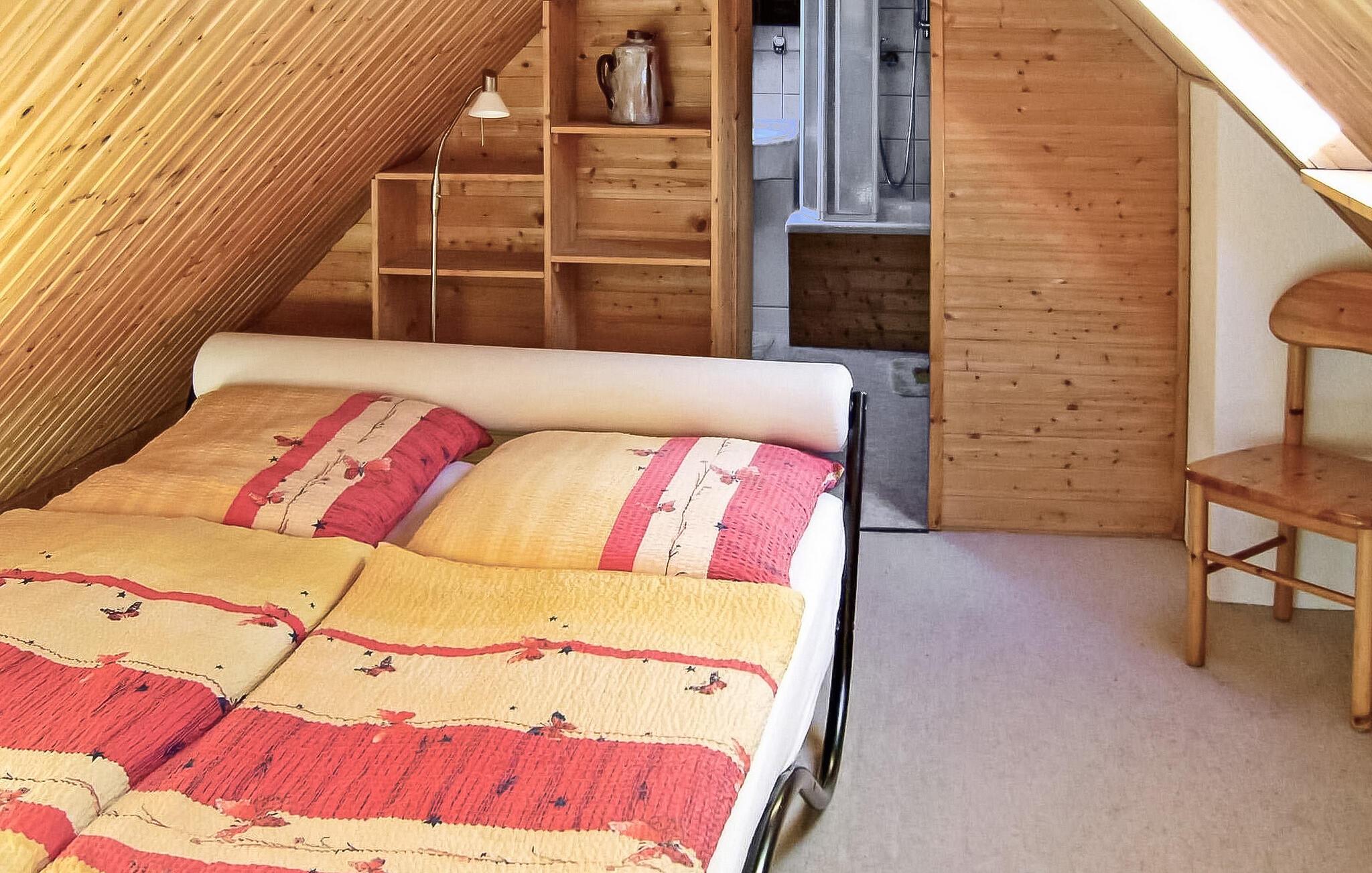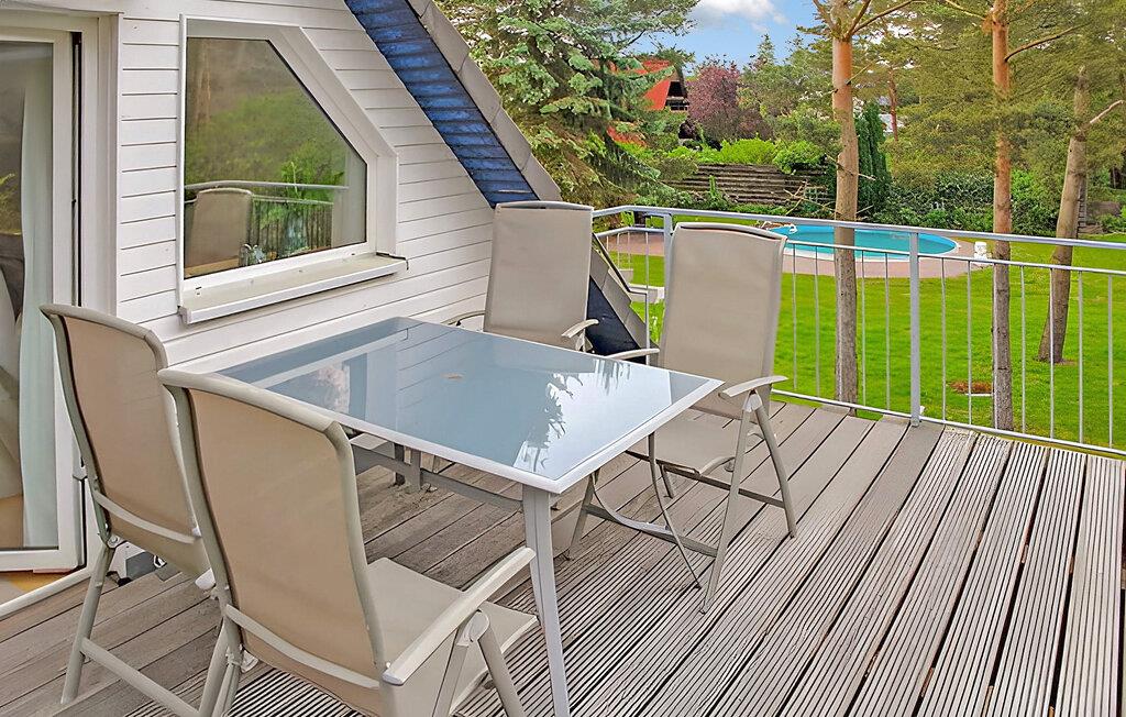 På ejerens 3.000 kvadratmeter store keramik- og feriegård i direkte skovbeliggenhed er der to ferielejligheder, som ligger hver for sig i stueetagen og øverste etage i et sommerhus. Der tilbydes i alt seks ferielejligheder i forskellig størrelse. Alle boligenheder har separat adgang. Der er en udendørs pool (fælles brug), en møbleret terrasse, en grill og parkeringsplads og WiFi. Den samlede pris inkluderer vand, energi og slutrengøring. Du skal selv medbringe håndklæder og sengetøj. Husdyr: En lille hund tilladt op til en maksimal højde på 40 cm. Betales på stedet: turistskat. Lejligheden strækker sig over 3 plan. Adgang via entre i stueetagen. På øverste etage er der et stort åbent opholdsområde (satellit-tv, radio, spisebord, pejs), et åbent tekøkken (elkomfur med ovn, køleskab med fryser, mikroovn, opvaskemaskine, diverse køkkenmaskiner), et soveværelse ( to enkeltsenge) samt bad/toilet. På loftet (stejl trappe) er der soveværelse (1x dobbeltseng) og endnu et badeværelse med brus/toilet. Lejligheden har en møbleret altan. Pruchten er en lille by i det sydlige lagunelandskab, cirka 6 km fra feriestedet Zingst ved Østersøen. I byen: restaurant, shopping, lille. Havn, båd- og cykeludlejning, ridestalde og de bedste fiskemuligheder.
