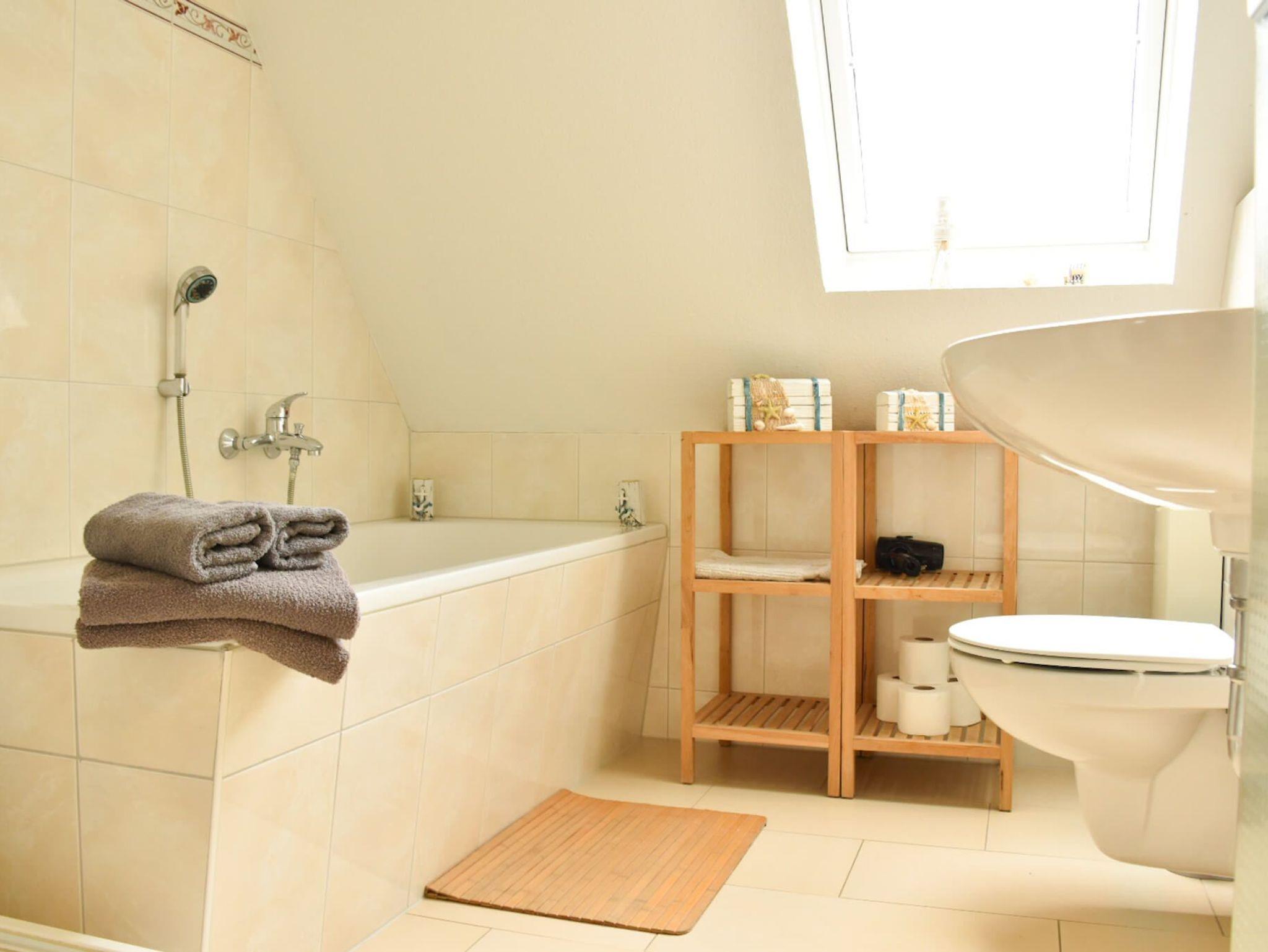 Das Bad im Ferienhaus Auszeit? ist mit einer Badewanne ausgestattet, in der Sie nach einem ereignisreichen Tag entspannen und die Seele baumeln lassen können. Im 1. und 2. Stock finden Sie die gemütlichen Schlafbereiche mit einem Doppelbett im 1. Stock und zwei Einzelbetten im 2. Stock. Falls Sie mit einer größeren Gruppe reisen, können ggfs. zwei weitere Personen auf der Lounge-Ecke im Durchgangsbereich schlafen.
