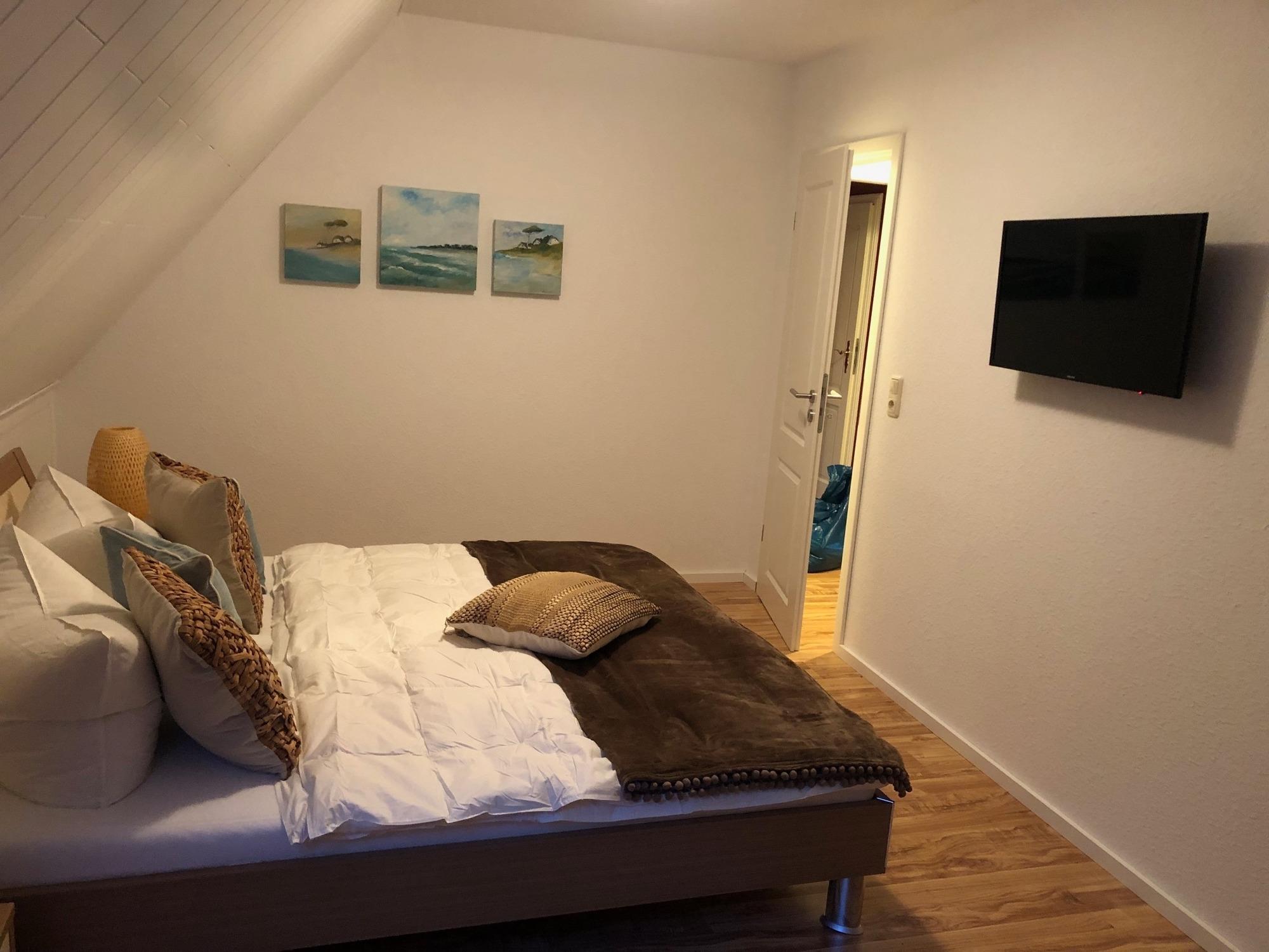 Im Obergeschoss gibt es vier teils sehr großzügige Schlafzimmer, abwechselnd mit Doppelbetten / Boxspringbetten und eins mit Einzelbett. Zum Teil mit Balkon.