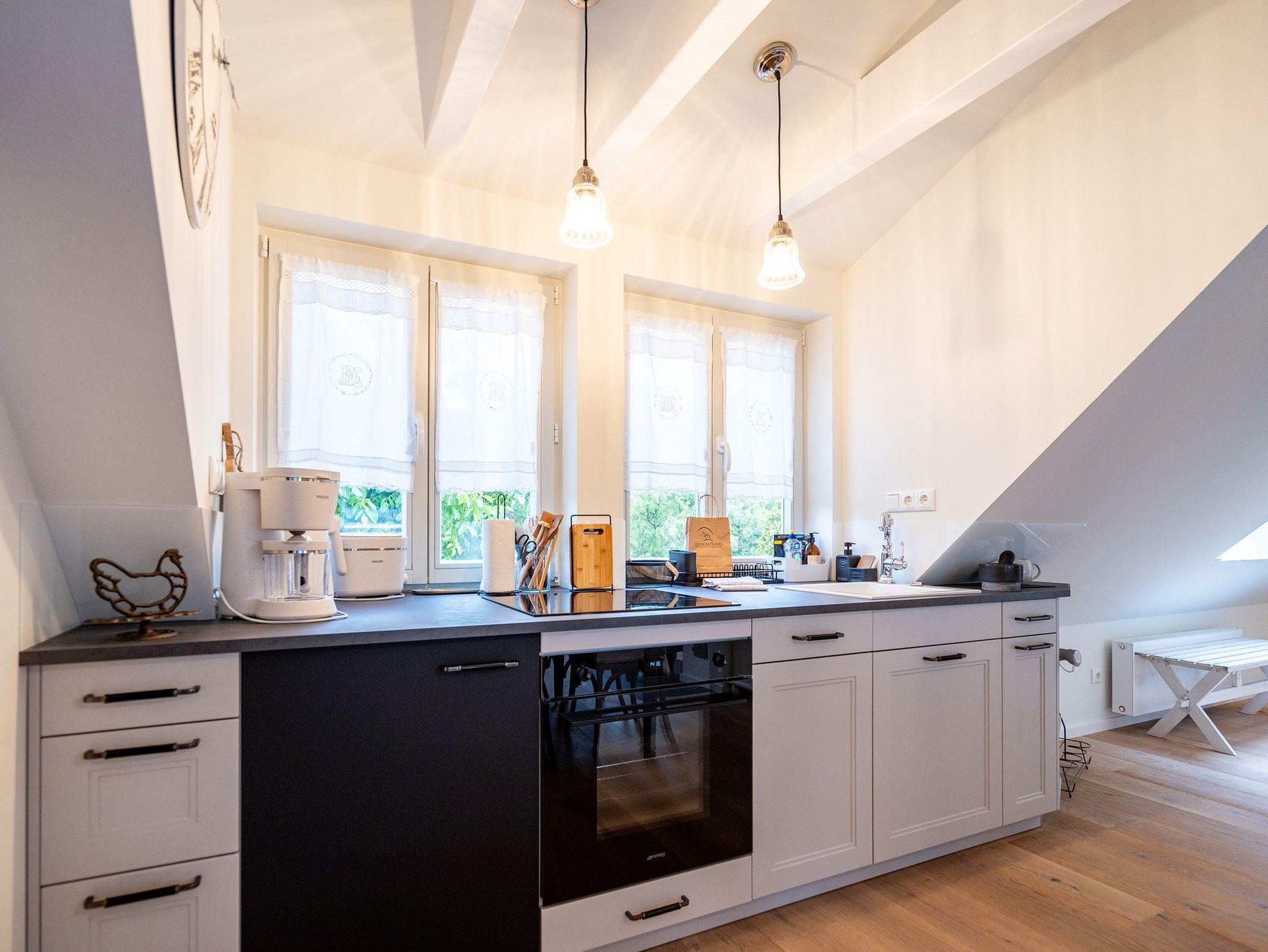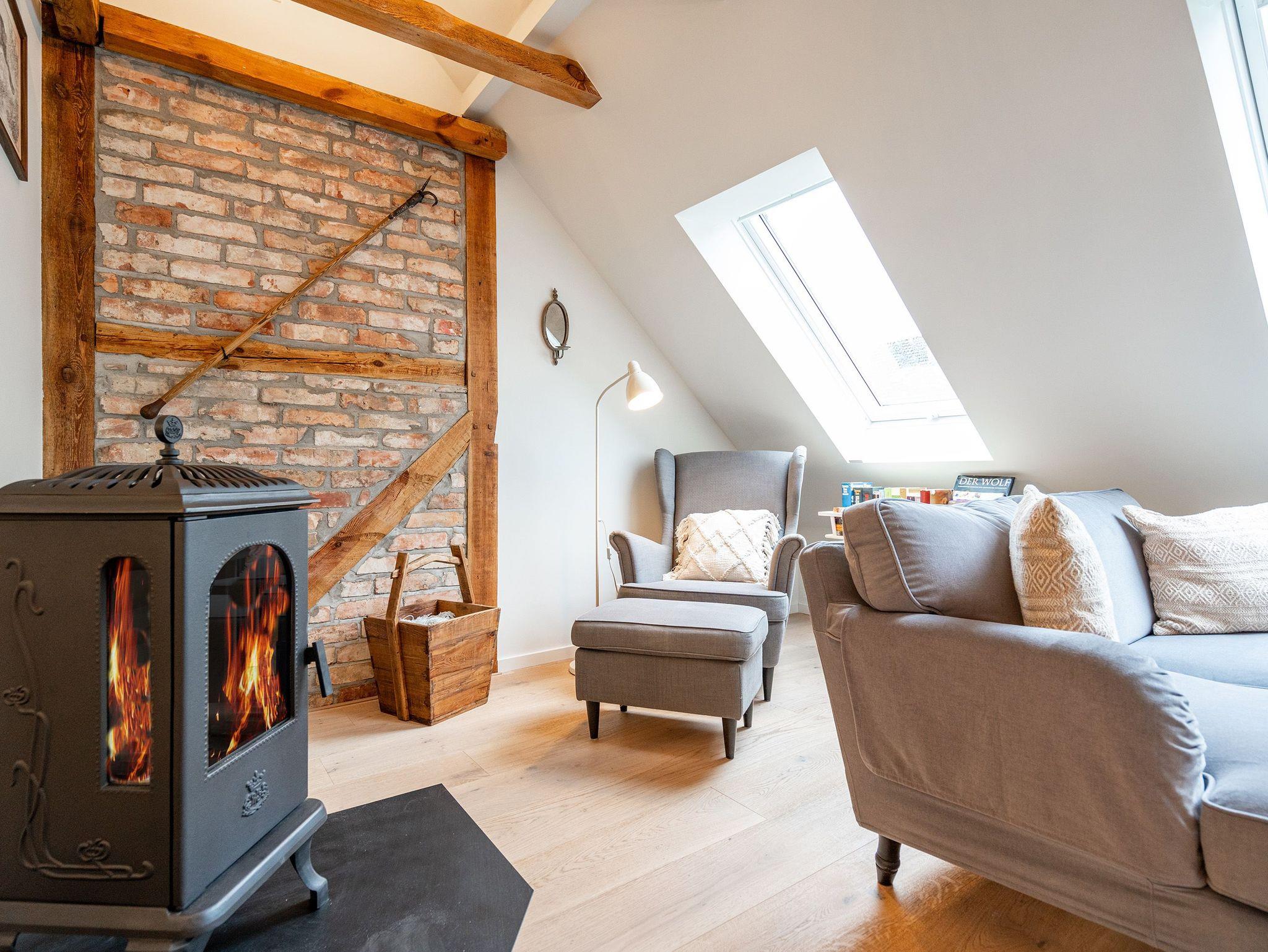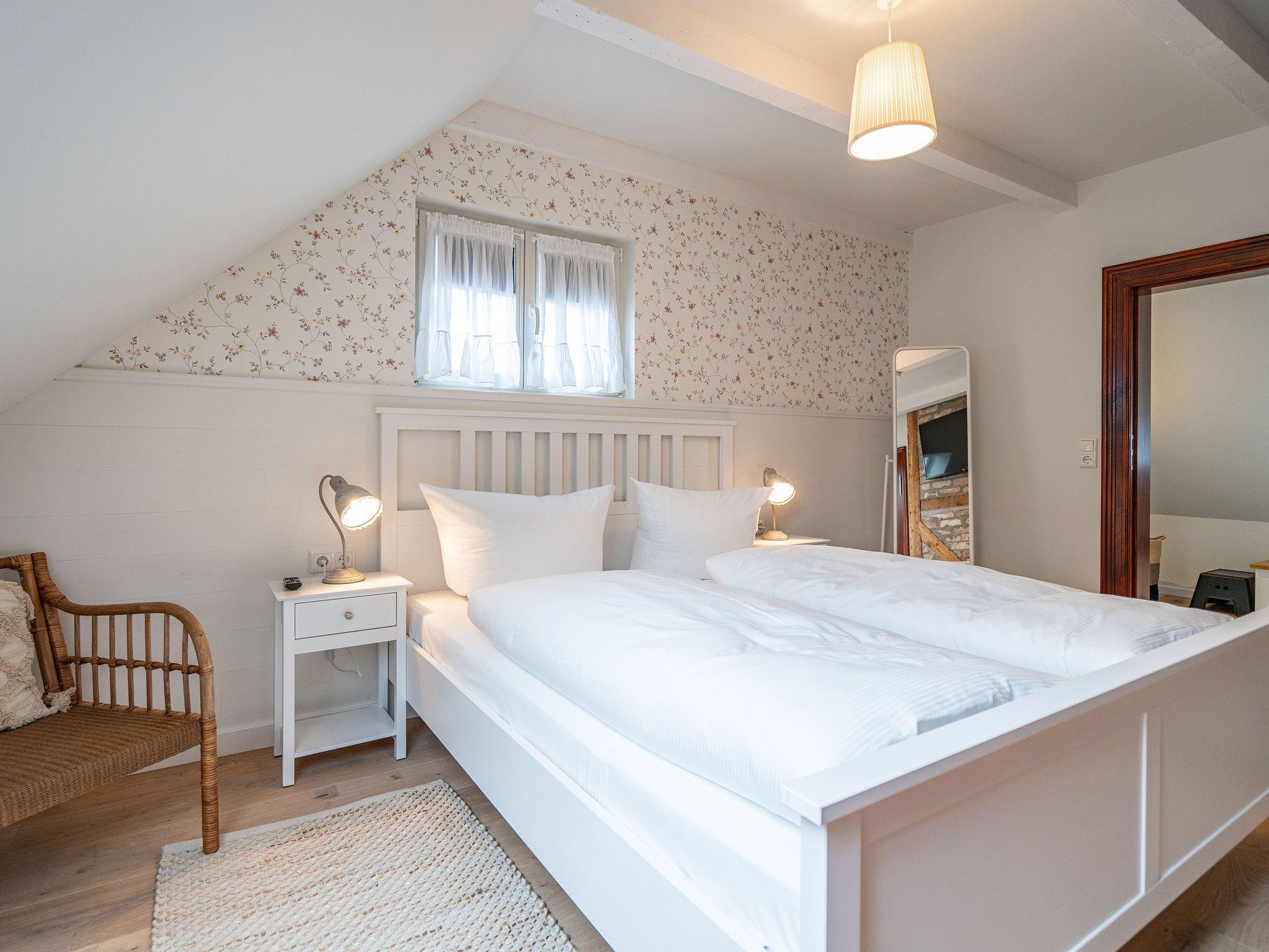 Mit viel Charme und Gemütlichkeit empfängt Sie das Appartement 01 im Alten Tagelöhner Haus in Pudagla. Über eine Treppe gelangen Sie in das Obergeschoss des 1915 erbauten Hauses, wo sich das 75 Quadratmeter große Appartement befindet. Hinter Ihrem Flur mit Garderobe finden Sie den offenen Wohn-Essbereich. Alte Holzbalken, Dachschrägen und freigelegte Mauerwerke sorgen direkt für ein heimeliges Gefühl. Ein Esstisch mit Marmorplatte und Platz für bis zu 5 Personen sowie liebevolle Details aus einer einst vergangenen Zeit, wie ein alter Kronleuchter, sind die perfekte Ergänzung für das Appartement im Landhausstil. Hier darf ein Holzkamin auf gar keinen Fall fehlen, vor dem Sie es sich an Ihren Abenden gemütlich machen können. Zwei Sofas und ein Sessel mit Hocker sowie ein 55-Zoll Flat-TV und ein Radio mit Bluetooth laden zudem zum entspannten Verweilen ein. Die voll ausgestattete Landhausküche mit Cerankochfeld, Backofen, Kühlschrank mit Gefrierfach sowie diverse Kleinküchengeräte lässt keine Wünsche beim Zubereiten Ihrer Speisen offen. Bis zu vier Personen und zwei Kleinkinder (im Kinderreisebett bis 3 Jahre) finden in den beiden Schlafzimmern mit Doppelbetten (1,60m x 2,00m) Platz und erholsamen Schlaf. Flat-TVs und ausreichend Schrankraum für Ihre Urlaubsgarderobe runden die Schlafbereiche ab. Eine morgendliche Regendusche können Sie im innenliegenden Badezimmer mit Waschtisch und WC genießen, welches einen direkten Zugang von einem Schlafzimmer aus hat. Ein Highlight ist der Zugang zum Schmollensee, den Sie auch mit einem bereitgestellten Kanu für bis zu 3 Personen erkunden können. Von Oktober bis April erhaschen Sie zudem von Ihrer Küche und Ihrem Badezimmer aus einen Blick auf den naturbelassenen See. Auch auf der überdachten und 12 Quadratmeter großen Südwest-Terrasse können Sie Ihre Zeit verbringen. Ein Grill steht Ihnen ebenfalls zur freien Verfügung. Das umzäunte Gelände eignet sich ideal für Familien mit Kindern. Bei Ihrer Anreise steht Ihnen ein PKW-Stellplatz sowie Fahrradstellplätze am Haus zur Verfügung. Außerdem sind die Betten bereits bezogen und Handtücher liegen für Sie bereit. Ab Juli 2025 steht Ihnen hinter dem Haus ein eigener Tennisplatz (Kunstrasen mit Quarzsand) zur Verfügung ? ideal für alle, die auch im Urlaub aktiv bleiben möchten. Der Platz kann wochenweise dazugebucht werden.