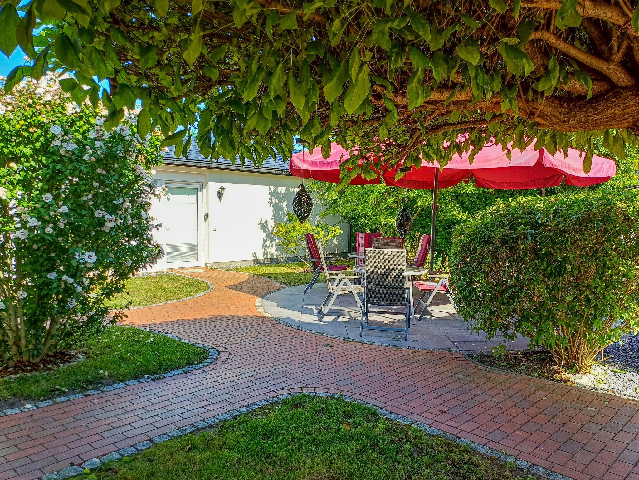 Terrasse ist mit bequemen Gartenmöbeln und einem großen Sonnenschirm ausgestattet und lädt zu einem