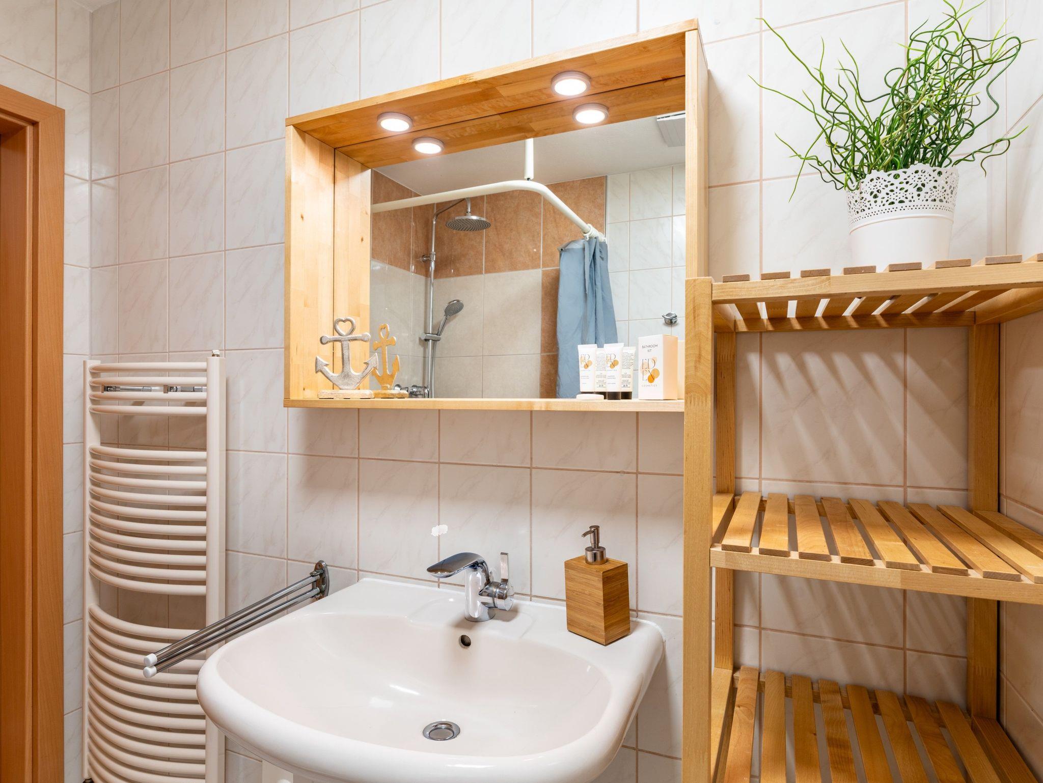 Die circa 50 m² große Ferienwohnung ist ideal für zwei Erwachsene und zwei Kinder. Sie verfügt über ein Schlafzimmer mit einem 180 cm breiten Doppelbett und einem großen Kleiderschrank mit Spiegeltür. Das zweite Schlafzimmer verfügt über ein 140 cm breites französisches Bett.
