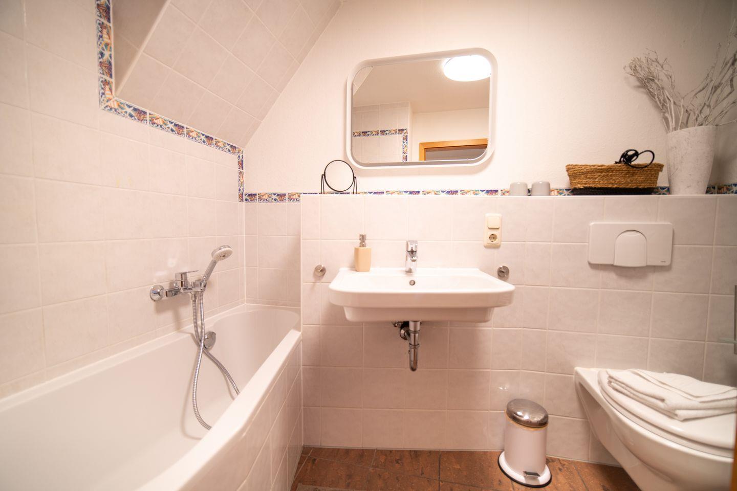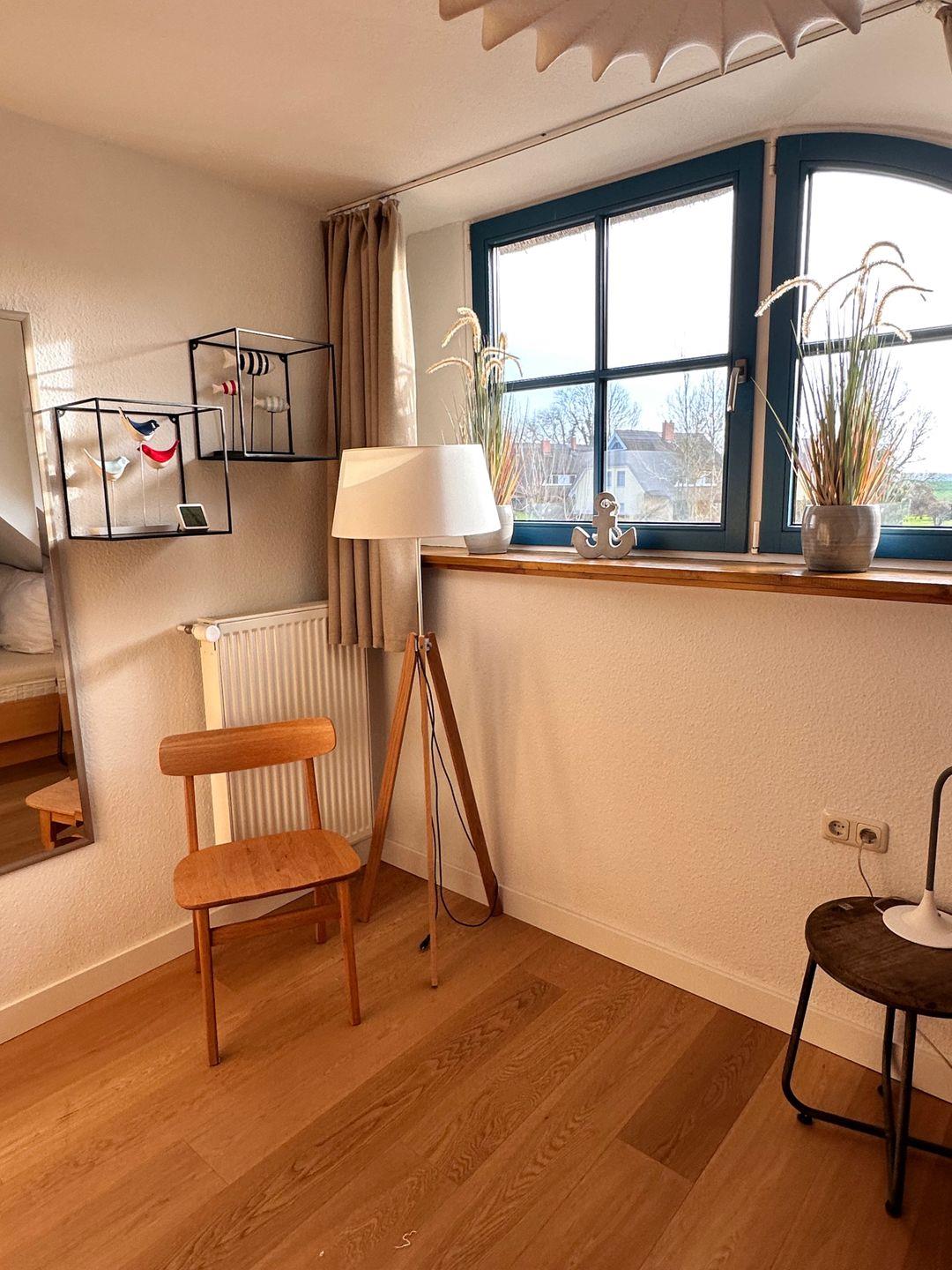 Im Obergeschoss befinden sich zwei geräumige Schlafzimmer mit Doppelbetten sowie ein innenliegendes Bad mit Badewanne – ideal für gemütliche Abendrituale. Das Dachgeschoss beherbergt ein charmantes Kinderzimmer mit zwei Einzelbetten – ein wunderbarer Rückzugsort für die kleinen Gäste.