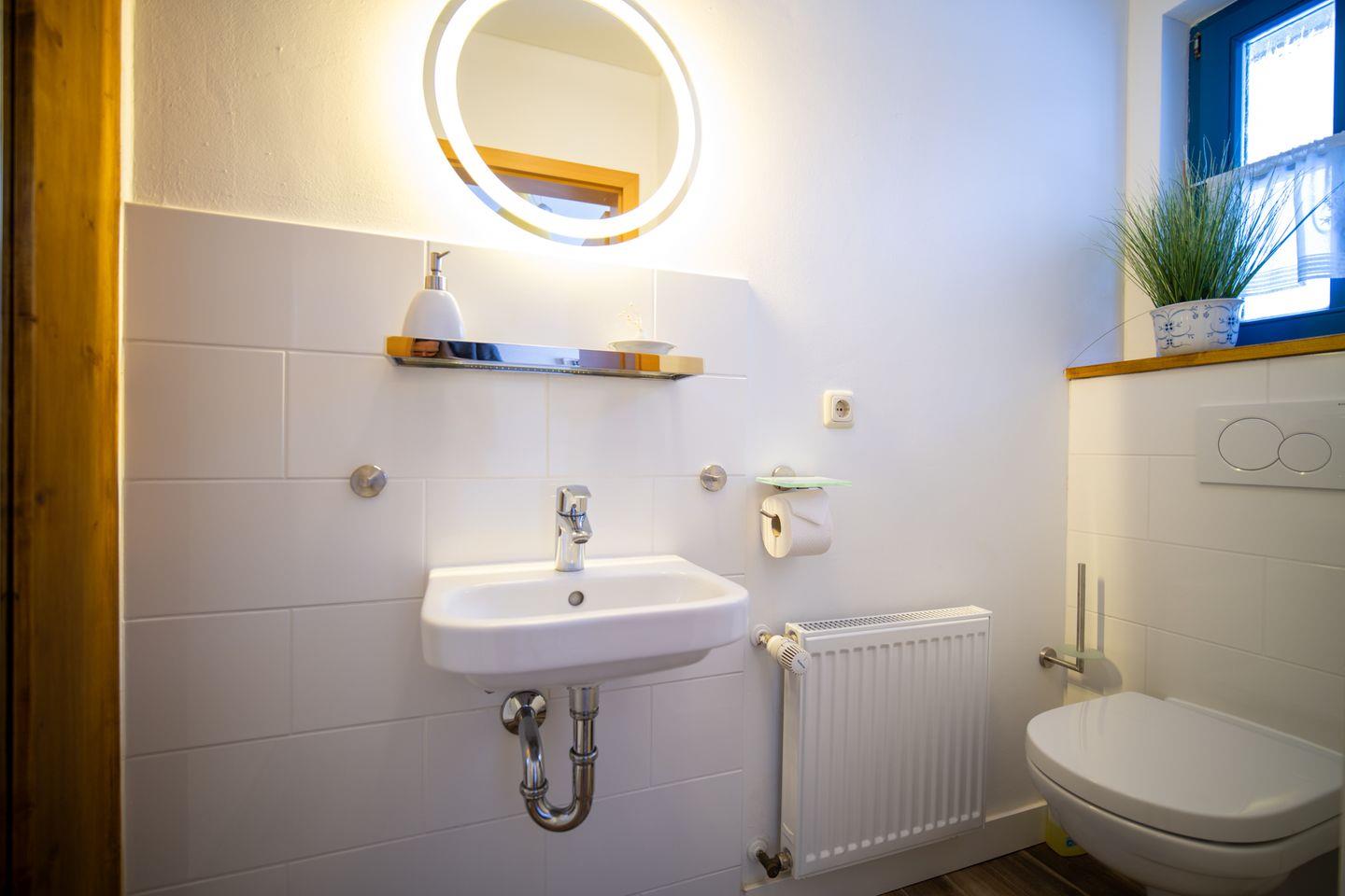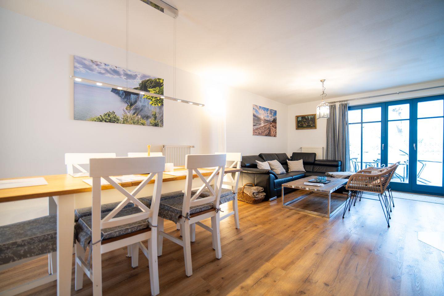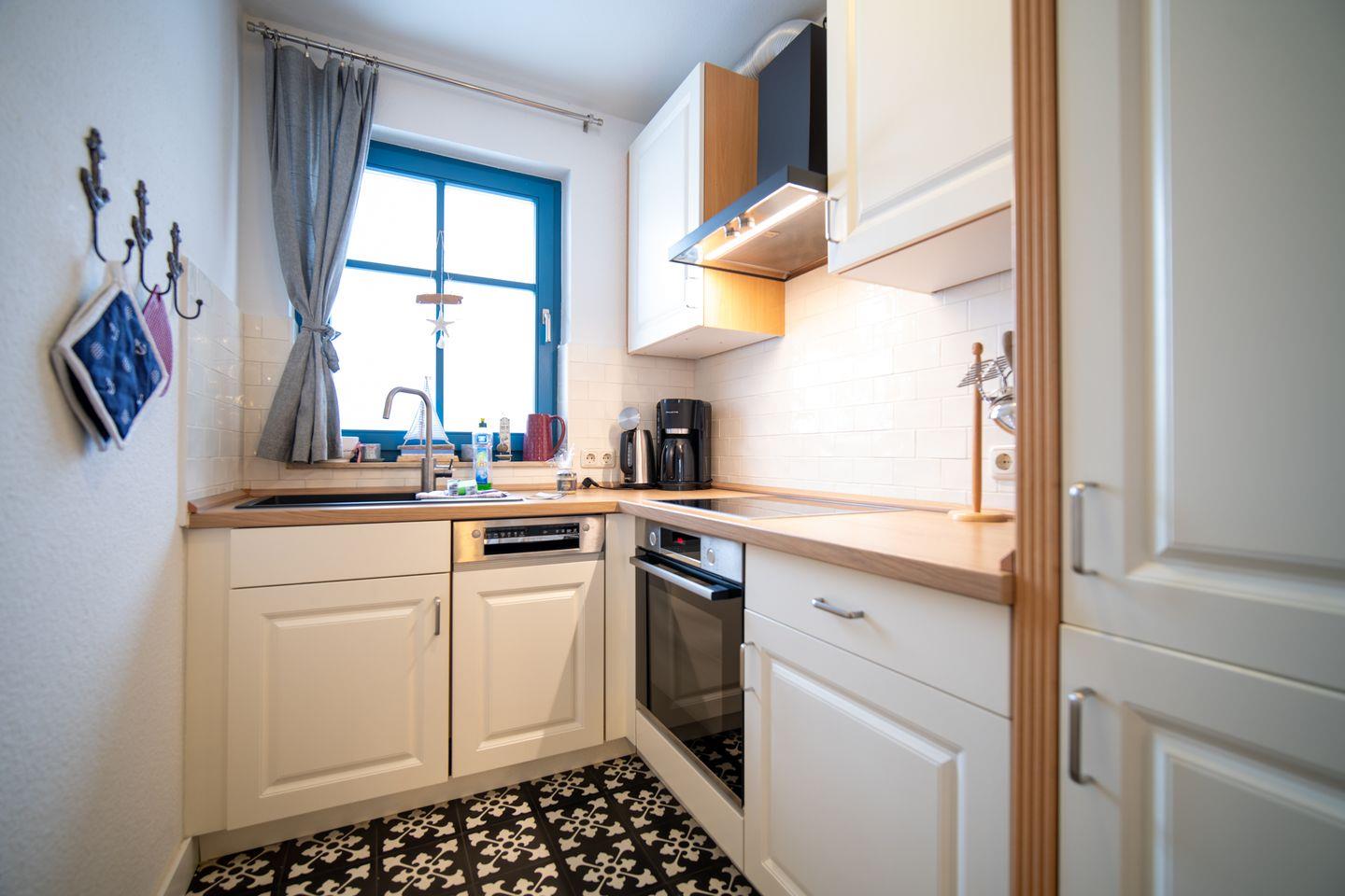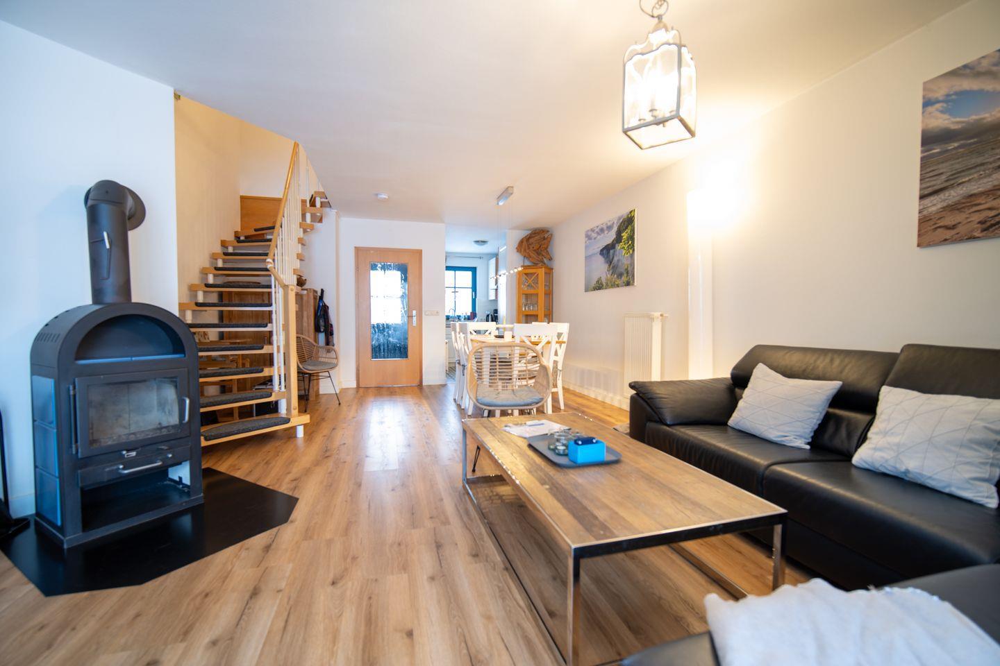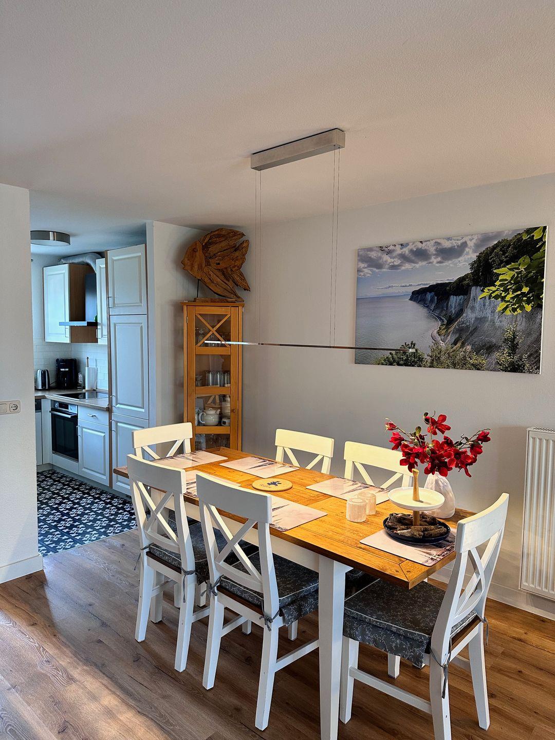 Im offen gestalteten Erdgeschoss lädt der helle Wohnbereich mit Sofaecke und Kamin zu entspannten Stunden ein. Durch bodentiefe Fenster gelangen Sie auf die sonnige Westterrasse – perfekt, um den Tag bei warmem Abendlicht ausklingen zu lassen. Die angrenzende Landhausküche ist vollständig ausgestattet und bietet alles, was Sie für gemeinsame Kochmomente brauchen. Ein kleines Duschbad sorgt auf dieser Ebene für zusätzlichen Komfort.