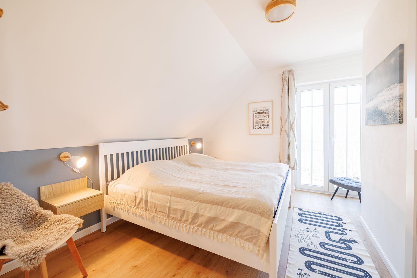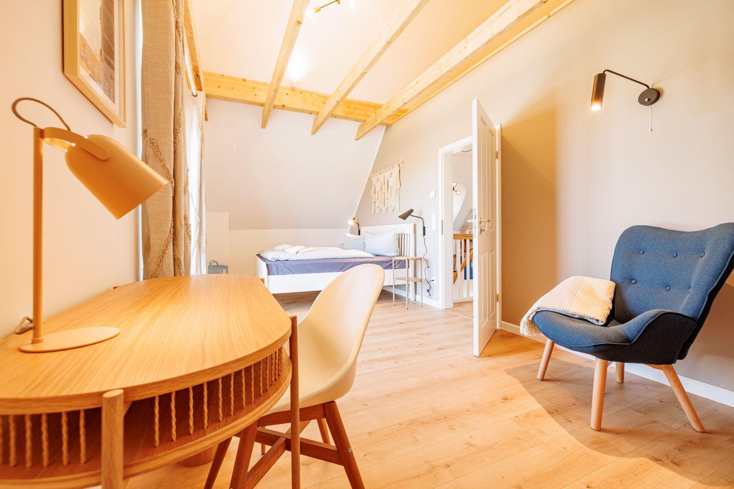 Im Dachgeschoss erwarten Sie drei gemütliche Schlafzimmer mit Doppelbetten. Dank der bodentiefen Fenster mit französischen Balkonen sind die Räume lichtdurchflutet; Außenrollos sorgen bei Bedarf für angenehme Verdunkelung. Das Hauptbad mit Dusche, Badewanne und der charakteristischen Fledermausgaube bietet ebenfalls einen wunderbaren Blick über die Wiek. Eine kleine Leseecke in der Galerie lädt zum Entspannen und Träumen ein. Für alle, die auch im Urlaub arbeiten müssen, steht schnelles Internet via Glasfaser zur Verfügung.