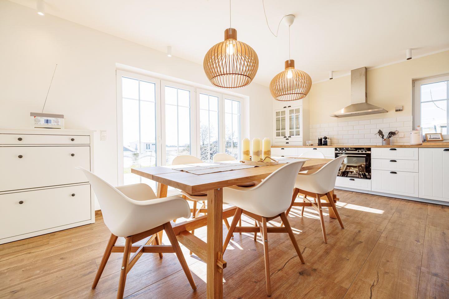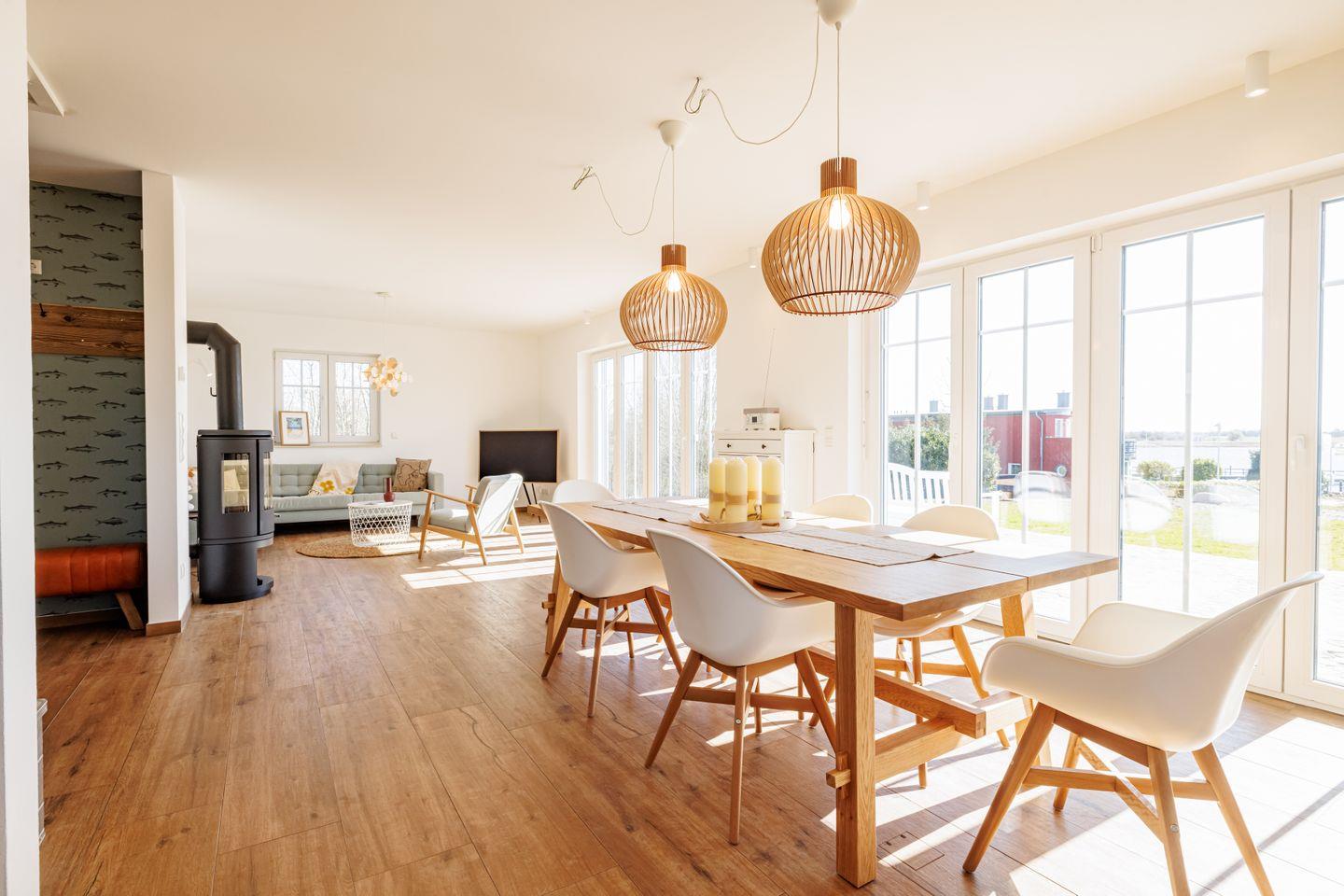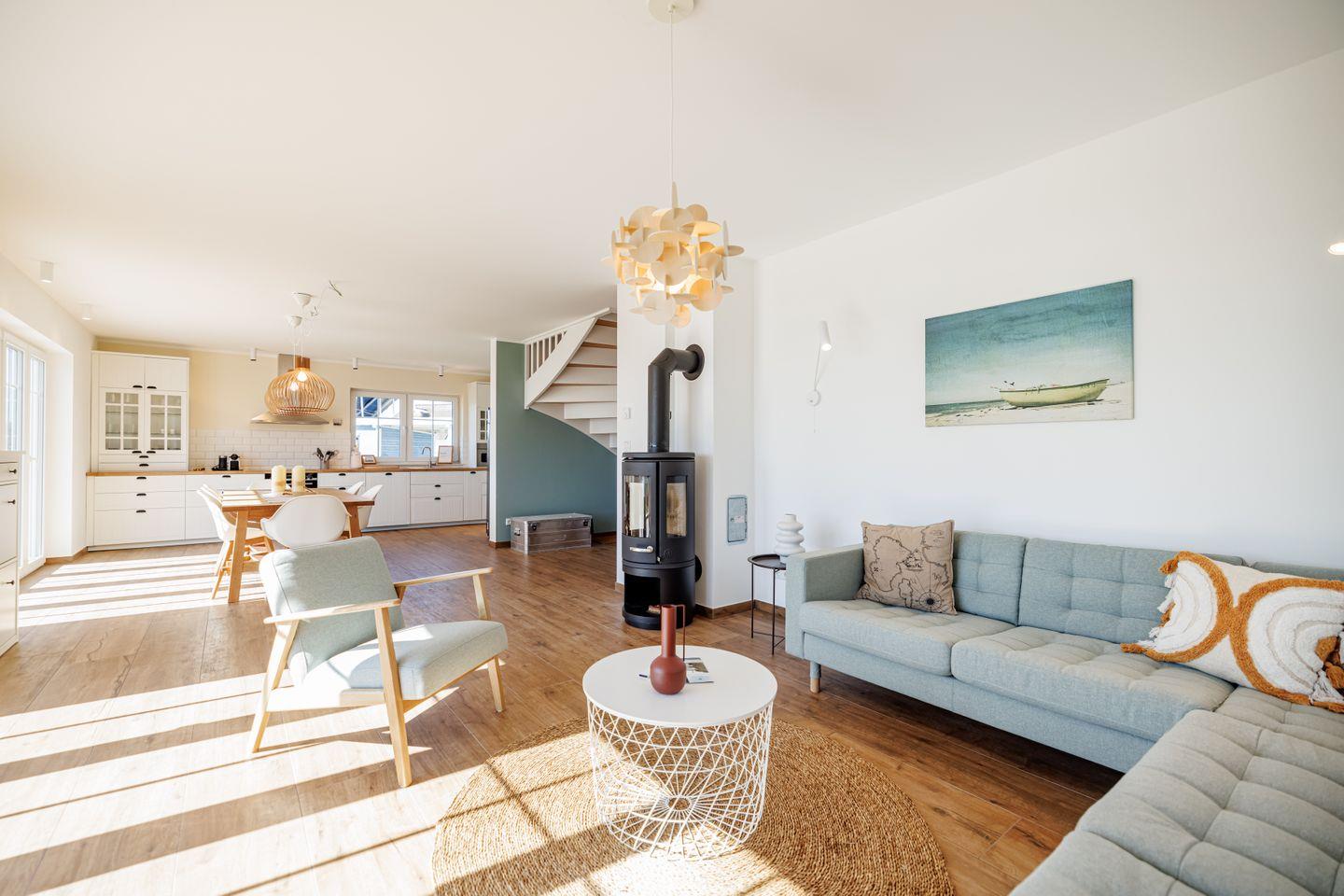 Das offen gestaltete Erdgeschoss beeindruckt mit bodentiefen Fenstern und einem traumhaften Blick über den Puddeminer Hafen. Die hochwertige Landhausküche mit großem Side-by-Side-Kühl- und Gefrierschrank inklusive Eiswürfelspender lässt keine Wünsche offen. Zudem befinden sich im Erdgeschoss eine großzügige Sauna mit Dusche und WC sowie ein Hauswirtschaftsraum mit Waschmaschine.