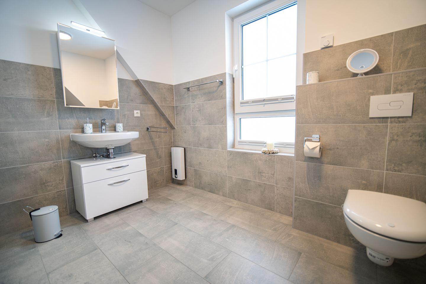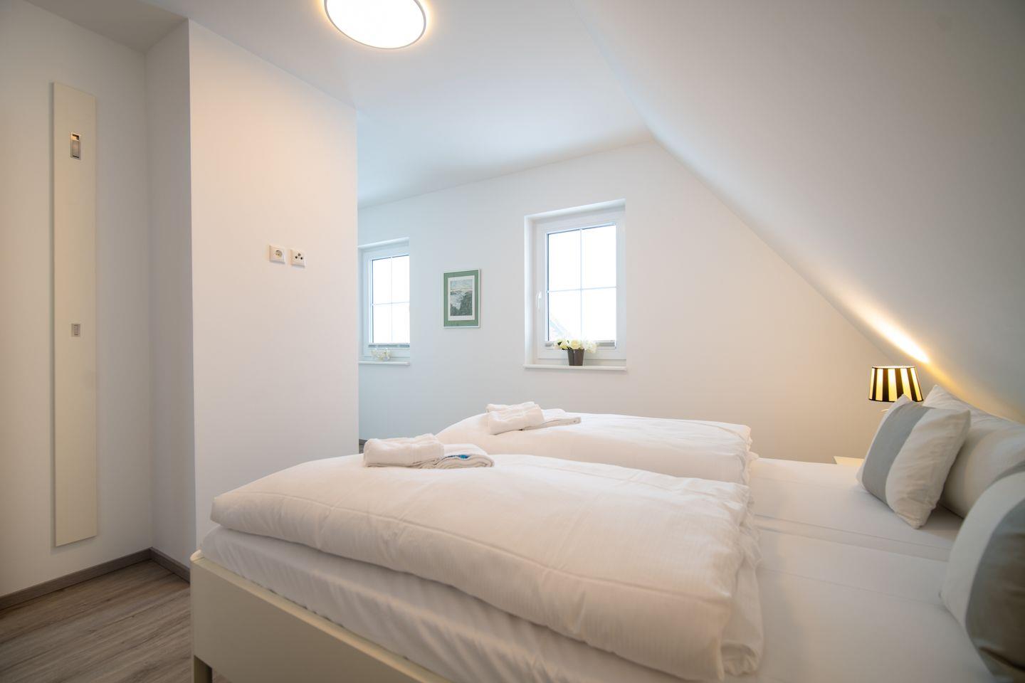 Im Obergeschoss liegen drei behagliche Schlafzimmer – jedes ausgestattet mit einem 160 cm breiten Doppelbett und viel Stauraum. Das große Badezimmer kombiniert Dusche und Badewanne, ideal für Wellnessmomente nach einem Strandtag oder einer Bodden-Wanderung.