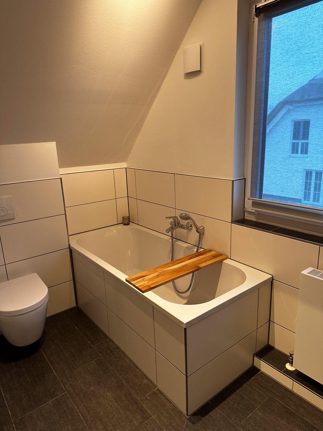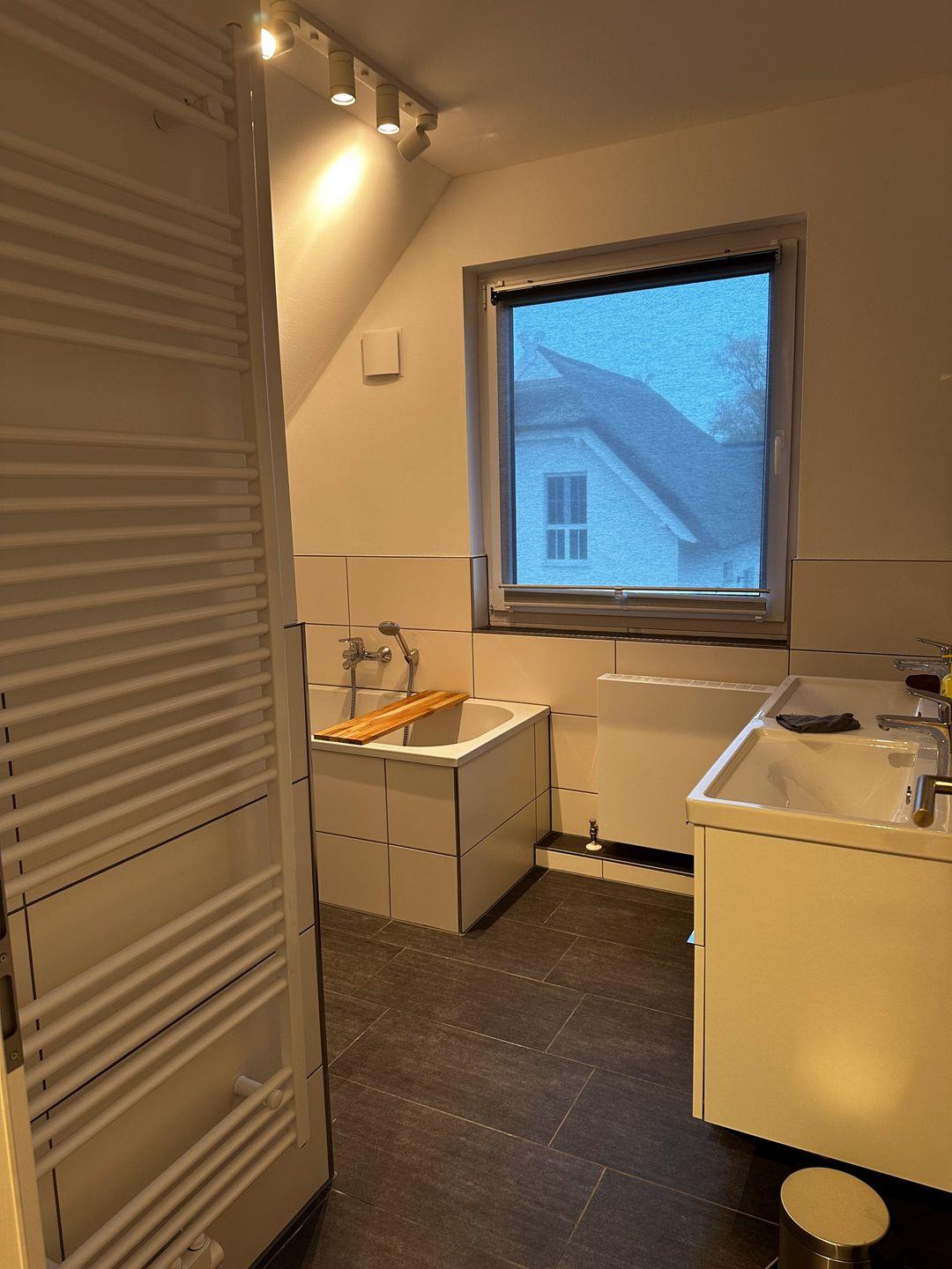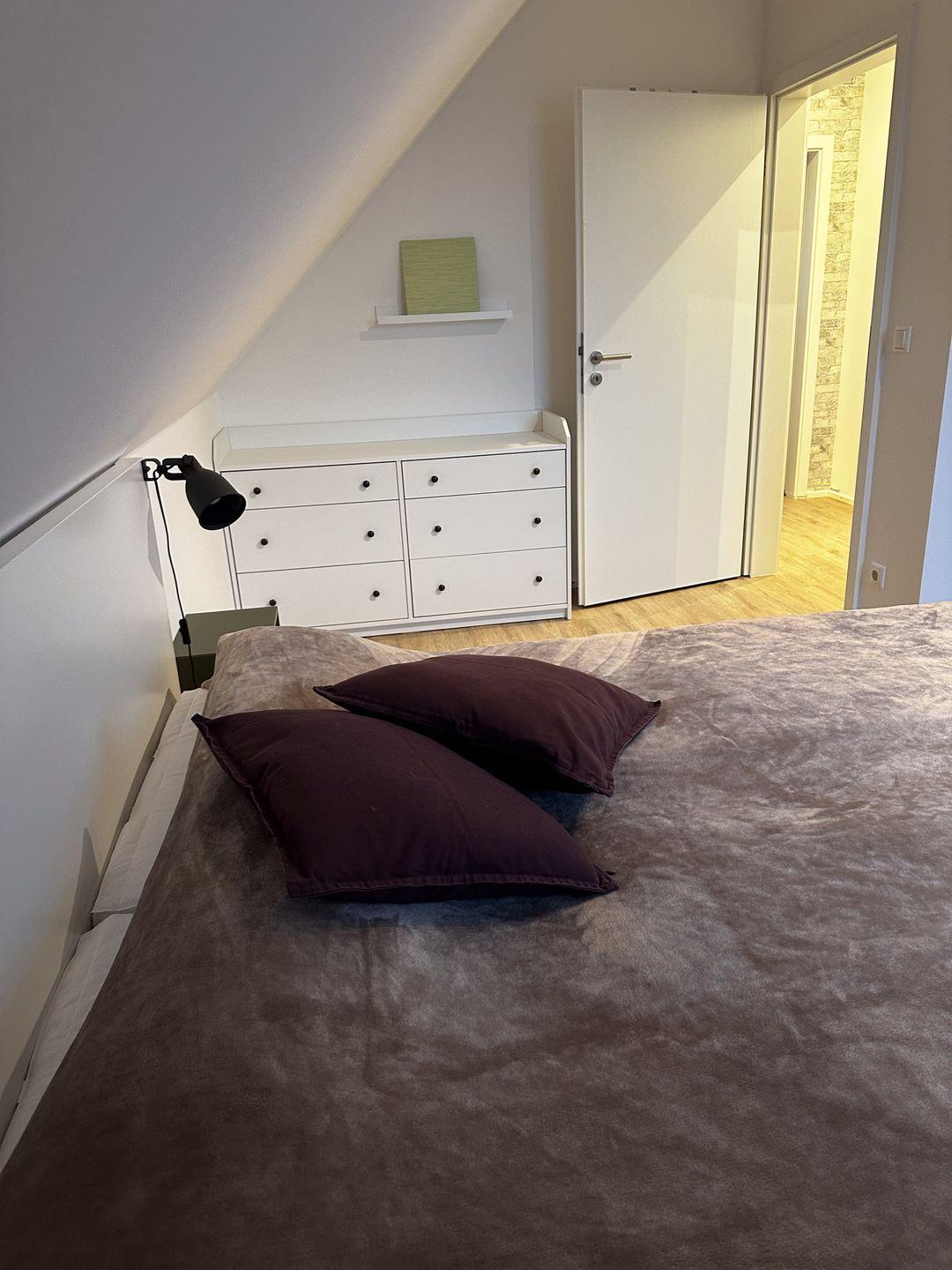 Die drei Schlafzimmer befinden sich im Obergeschoss und verfügen jeweils über ein 1,60 m breites Doppelbett. Das Vollbad mit Wanne und Dusche finden Sie ebenfalls im Obergeschoss. Ein weiteres Bad mit Dusche und ein kleiner Abstellraum befinden sich im Erdgeschoss.