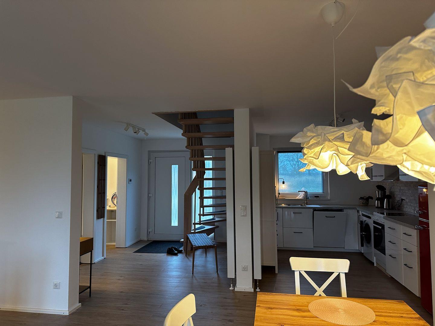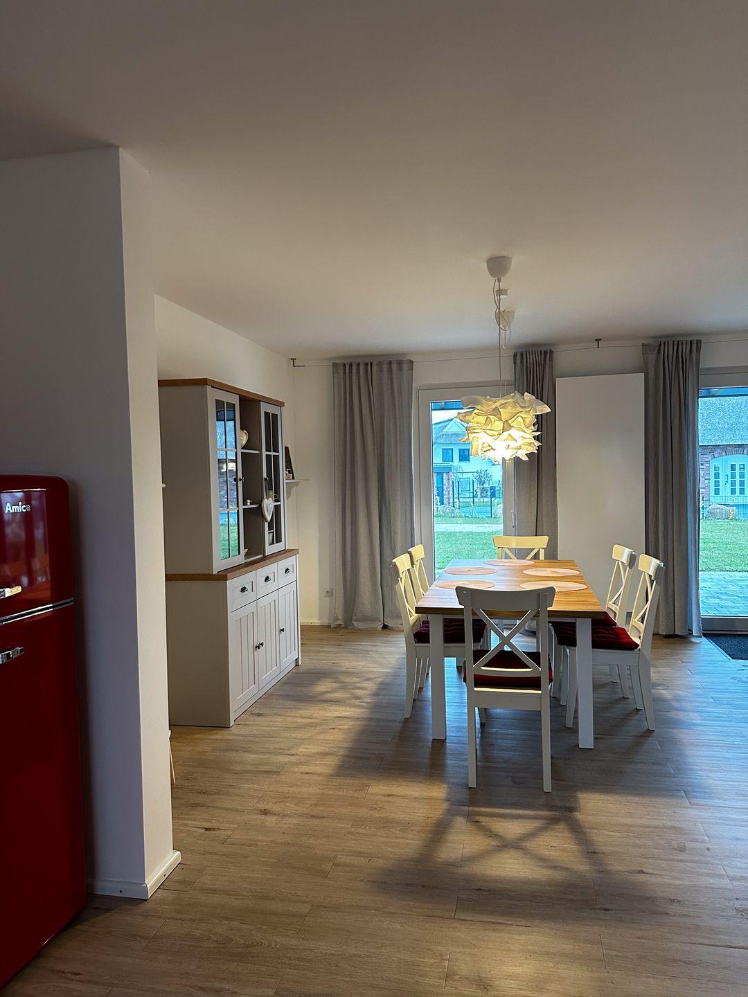 Im luftig und hell gestalteten Erdgeschoss finden Sie den großen Wohn-und Essbereich mit offener, sehr gut ausgestatteter Küche. Für besonderes Ambiente an stürmischen Tagen sorgt der komfortabel zu bedienende Elektrokamin. Die großen Glastüren lassen viel Licht in das Haus und führen auf die überdachte, windgeschützte Südterrasse. Neben bequemen Mobiliar steht Ihnen für den sommerlichen Grillgenuss ein Gasgrill zur Verfügung.