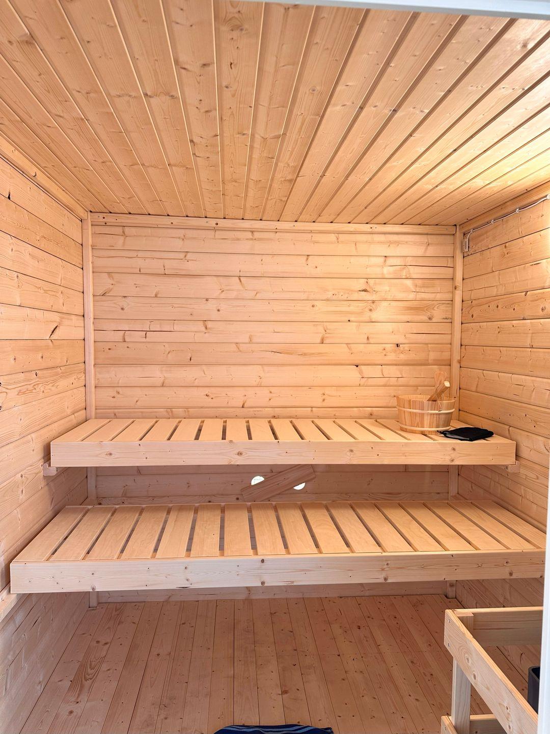 Der sonnige Garten hat eine Größe von ca. 950 m² und ist mit einem 80 cm hohen Stabmattenzaun umzäunt. Entspannen können Sie in Ihrer eigenen Gartensauna.