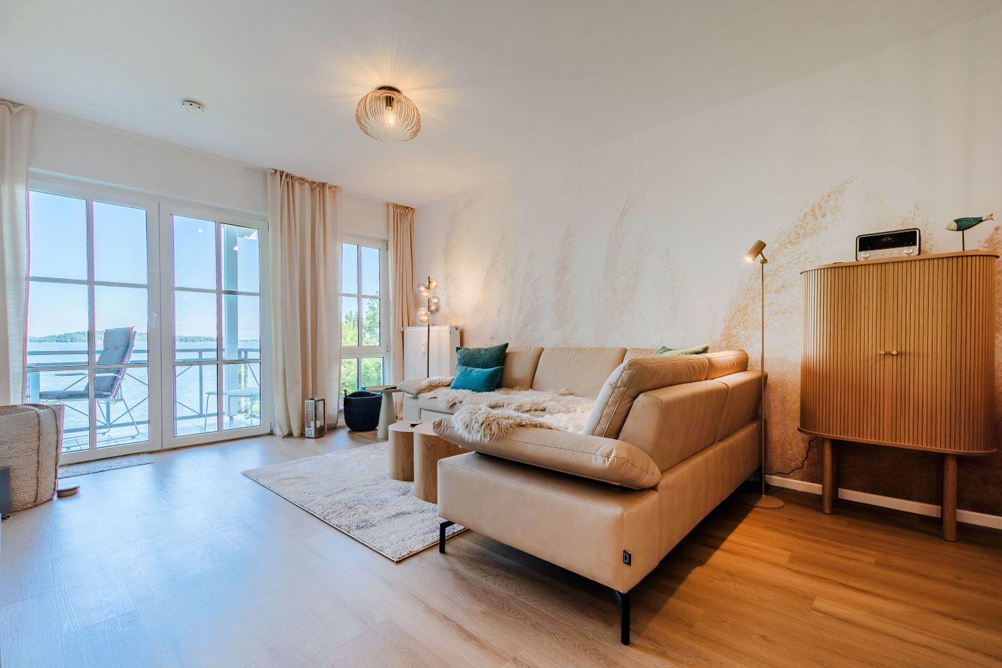 WOHNEN // Wohnraum mit Essbereich, Sitzgarnitur mit bequemer Sofalandschaft (mit Schlaffunktion), Esstisch, SMART-TV, Radio, überdachter Balkon ++