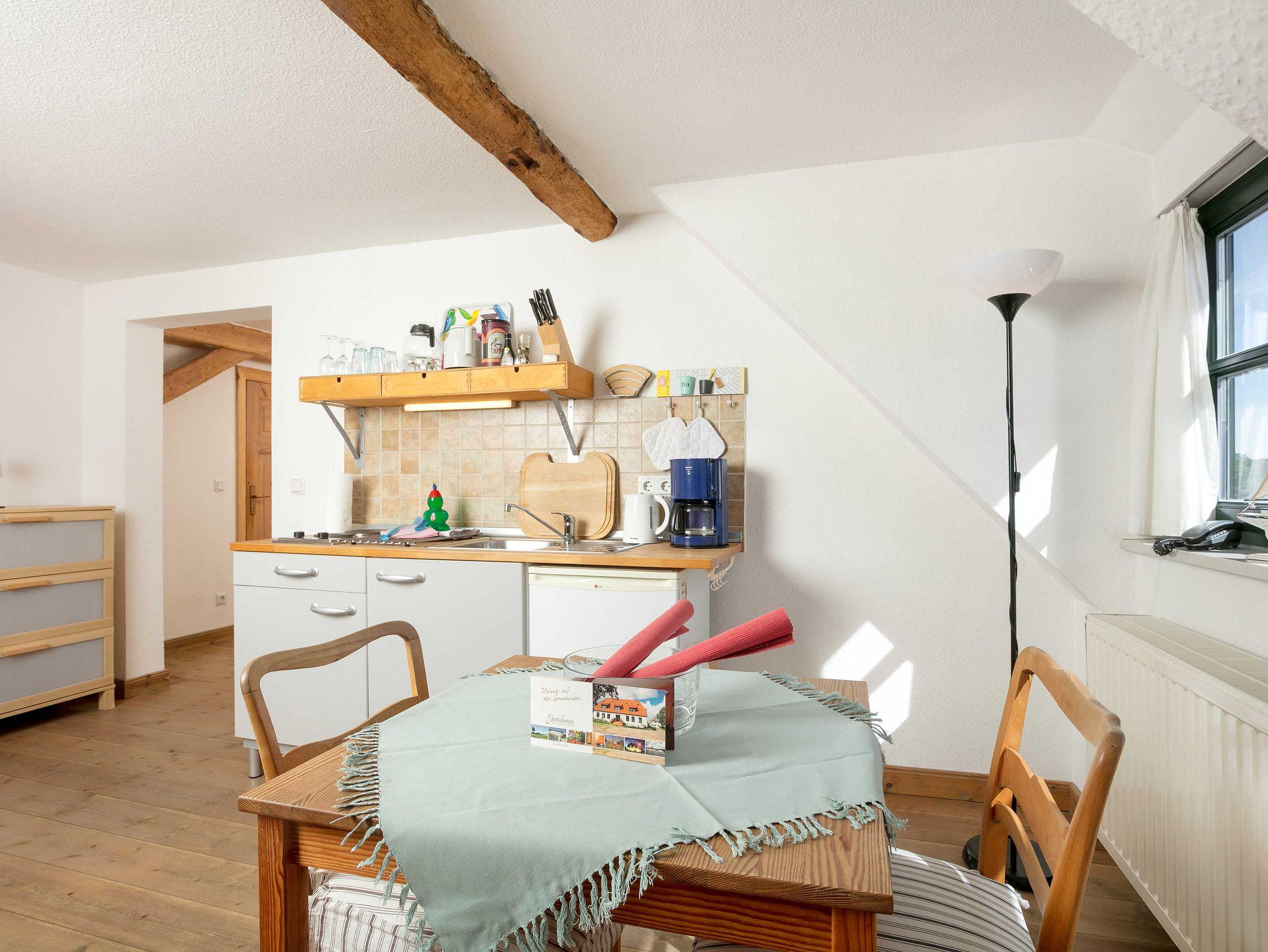Die Ferienwohnung besteht aus einen Wohnraum und einem sep. Schlaftzimmer, Flur, Küchenzeile, Bad mit Badewanne. Die Fewo liegt im 2 OG. des Gutshauses.