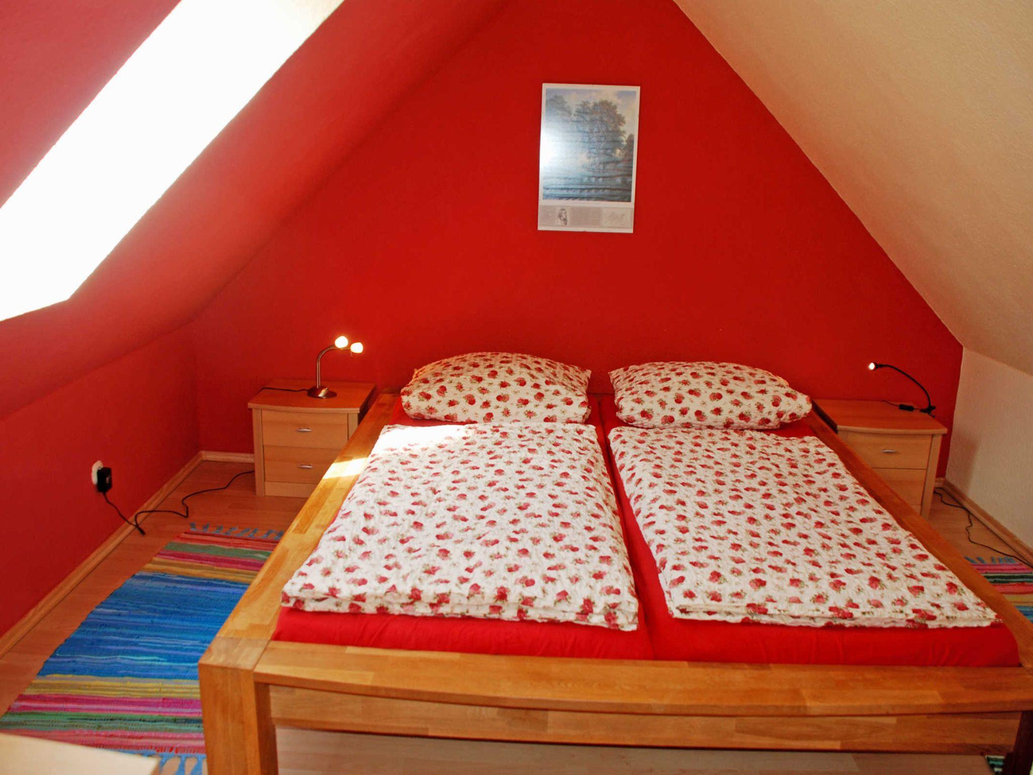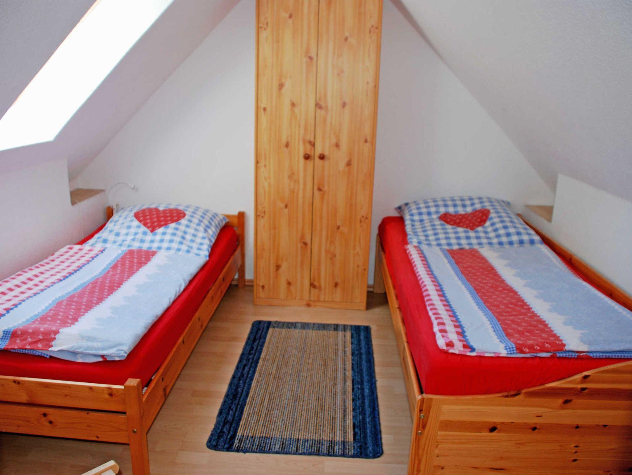 Das erste Schlafzimmer im Obergeschoss ist mit einem bequemen Doppelbett mit Nachttischen und Leselampen sowie einem Kleiderschrank ausgestattet. Im zweiten Schlafzimmer im Obergeschoss stehen zwei Einzelbetten. Für unsere kleinen Gäste stehen ein Kinderstuhl und Reisebett kostenlos zur Verfügung.
