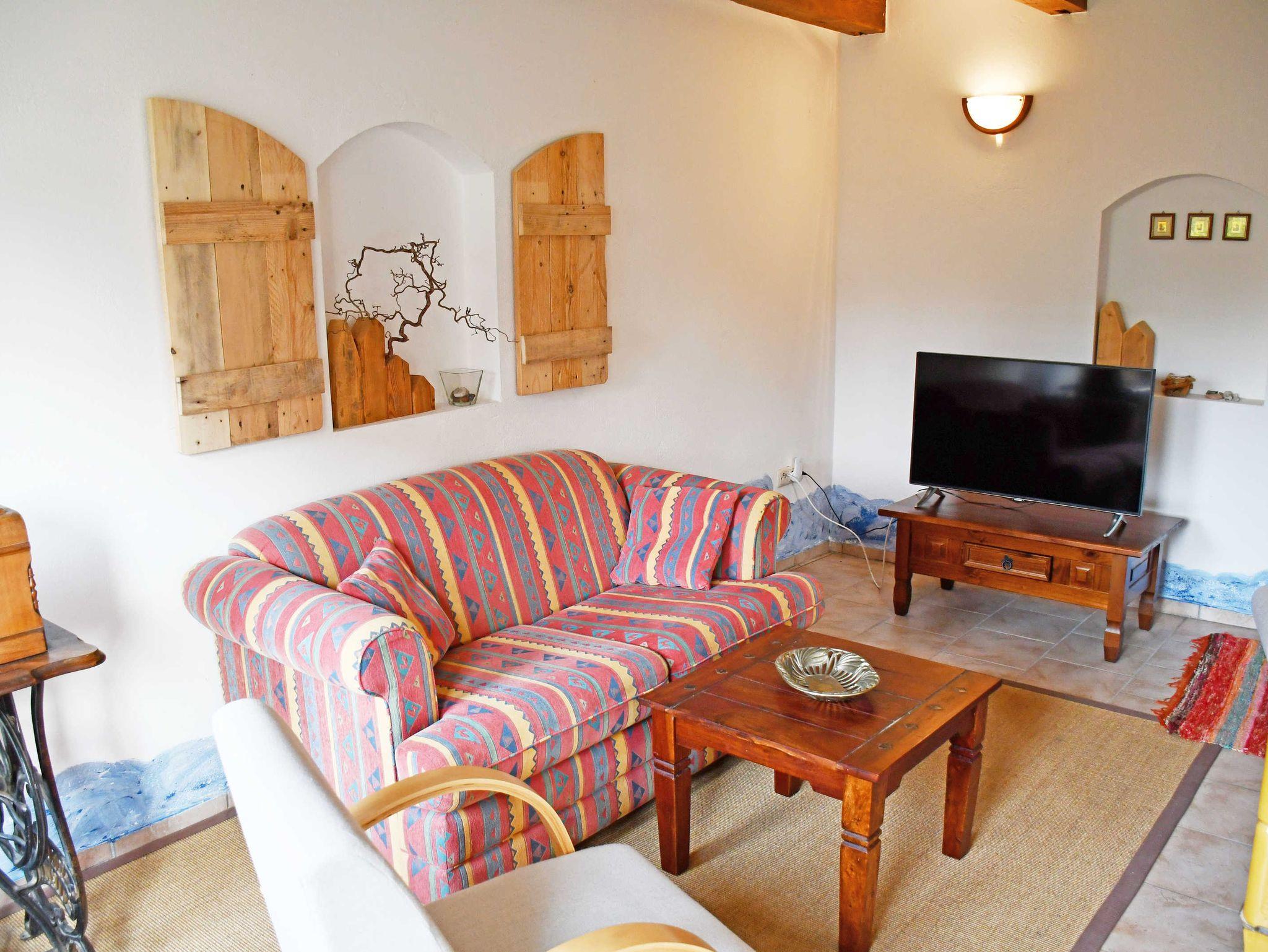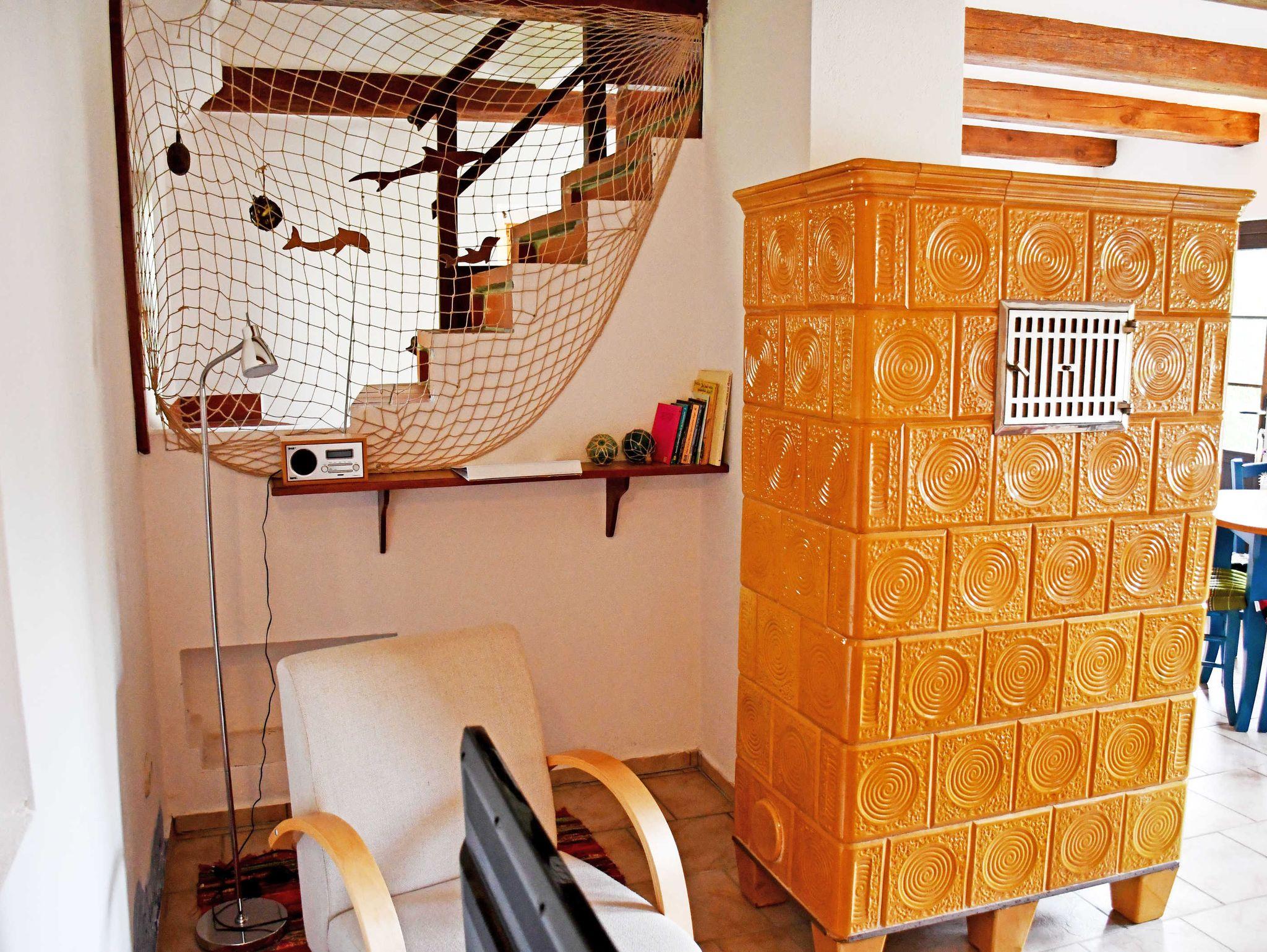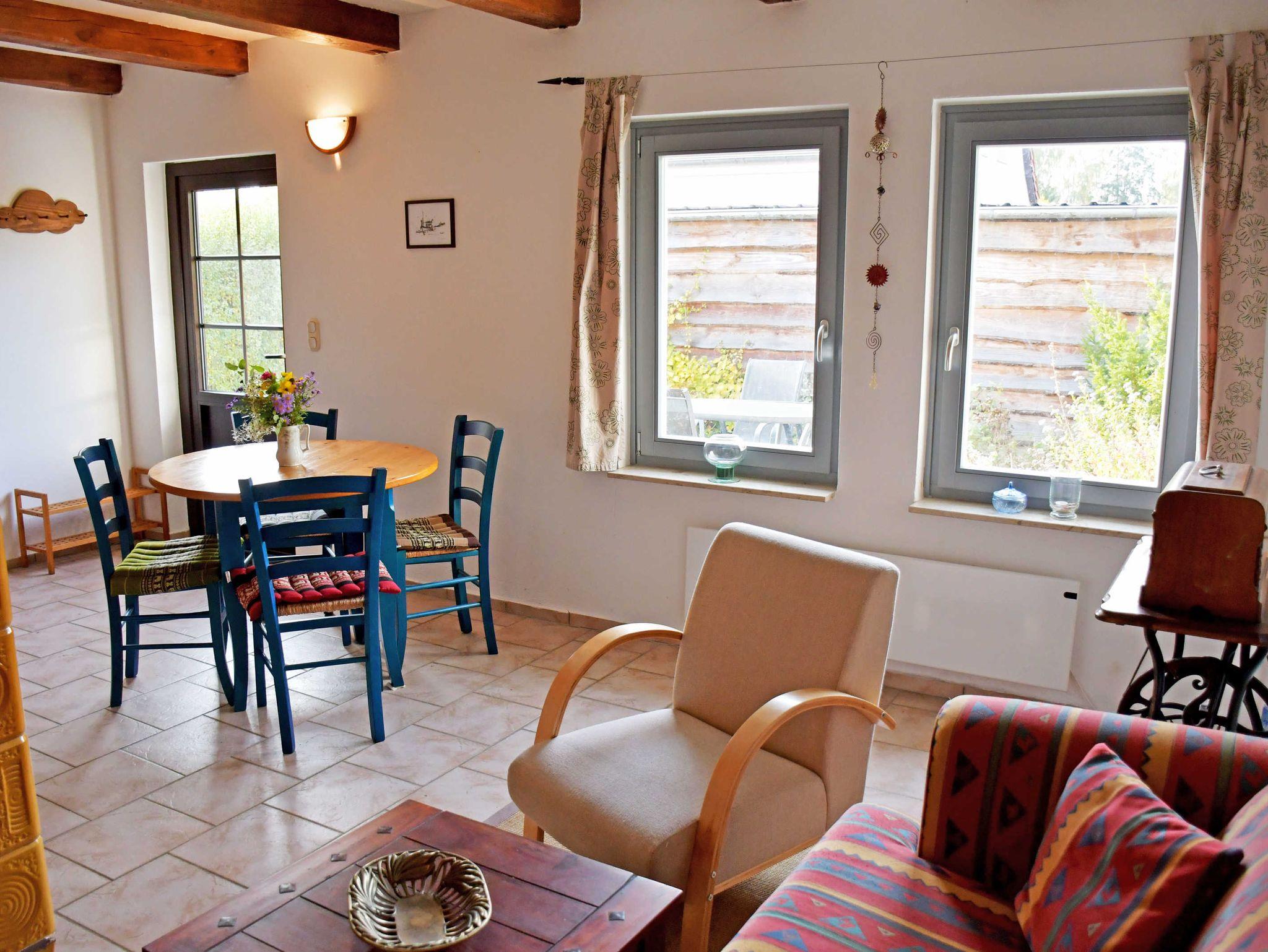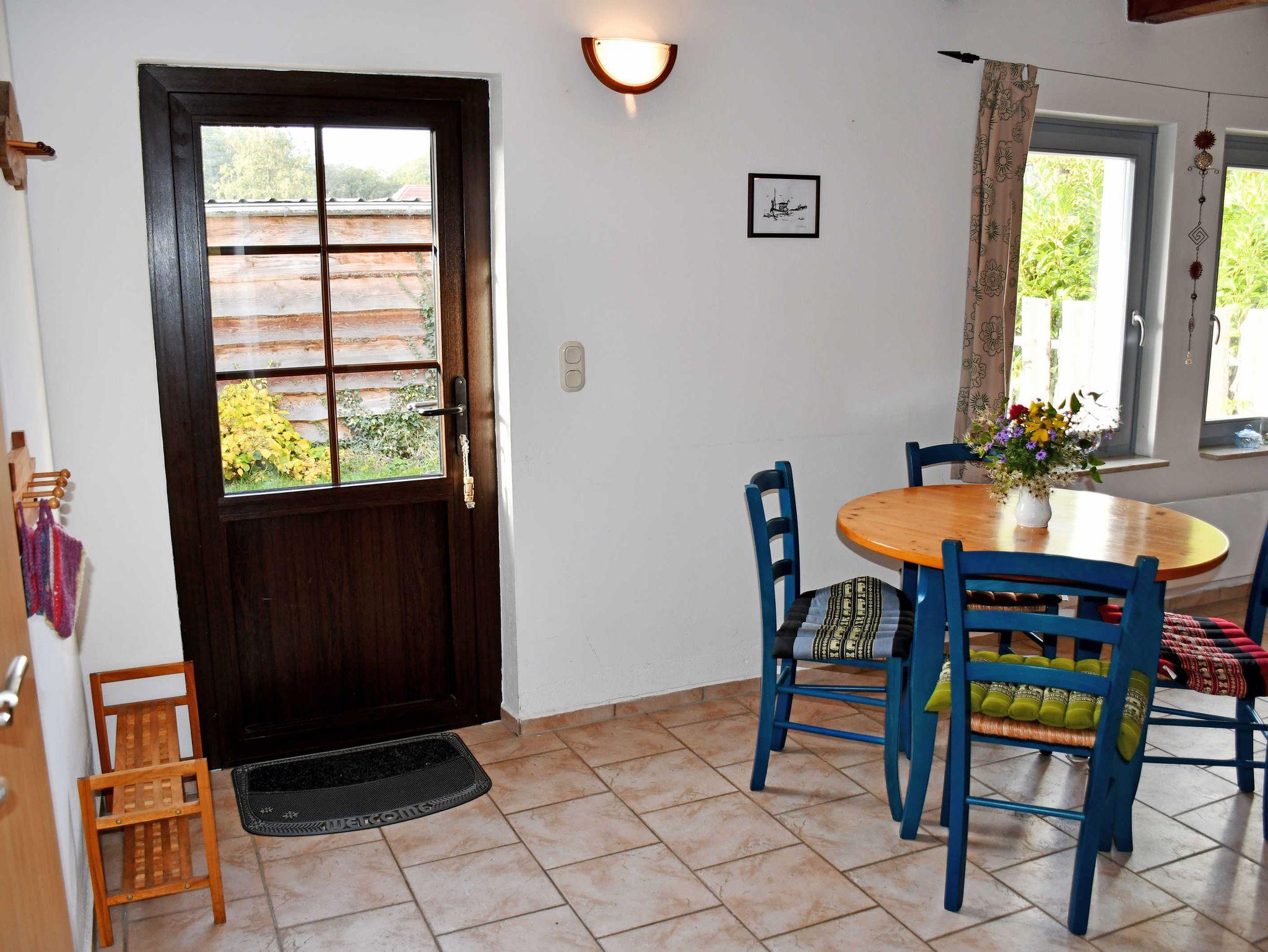 Das Ferienhaus verfügt über einen separaten Eingang. Es ist ca. 55 qm groß, hat Platz für maximal 4 Gäste und wurde im letzten Winter liebevoll neu eingerichtet und mit einem Kachelofen versehen, der an kalten Tagen das ganze Haus heizen kann. WLAN-Internetzugang steht für Sie kostenlos zur Verfügung. (Ausbaumaßnahmen und damit verbundene Unterbrechungen führen leider dazu dass das WLAN-Netz nur eingeschränkt nutzbar ist. Bitte buchen Sie NICHT, wenn das für Sie ein großes Problem darstellt.) Im Wohnraum befinden sich eine bequeme Sitzcouch mit Tisch und ein modernes Flachbild-TV-Gerät. Hier stehen auch ein Esstisch mit Stühlen sowie der Kachelofen für kuschlige Abende. Die offene - aber räumlich getrennte Küche ist mit Glaskeramik-Induktionskochfeld mit 2 Kochfeldern, Minibackofen, Wasserkocher, Kaffeemaschine, Toaster und Kühlschrank mit Gefrierfach komplett ausgestattet.