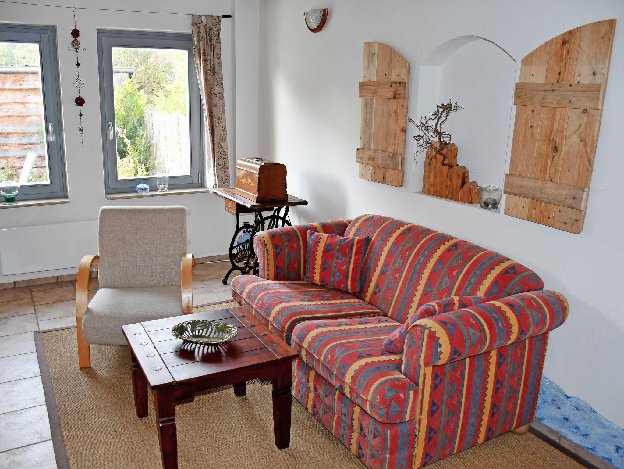 Das Ferienhaus verfügt über einen separaten Eingang. Es ist ca. 55 qm groß, hat Platz für maximal 4 Gäste, wurde modern und liebevoll eingerichtet und bietet ein WLAN-Internetzugang. (Ausbaumaßnahmen und damit verbundene Unterbrechungen führen leider dazu, dass das WLAN-Netz nur eingeschränkt nutzbar ist. Bitte buchen Sie NICHT, wenn das für Sie ein großes Problem darstellt.) Im Wohnraum befinden sich eine bequeme Sitzcouch mit Tisch und ein modernes Flachbild-TV-Gerät. Hier stehen auch ein Esstisch mit Stühlen sowie ein Kachelofen für kuschlige Abende.