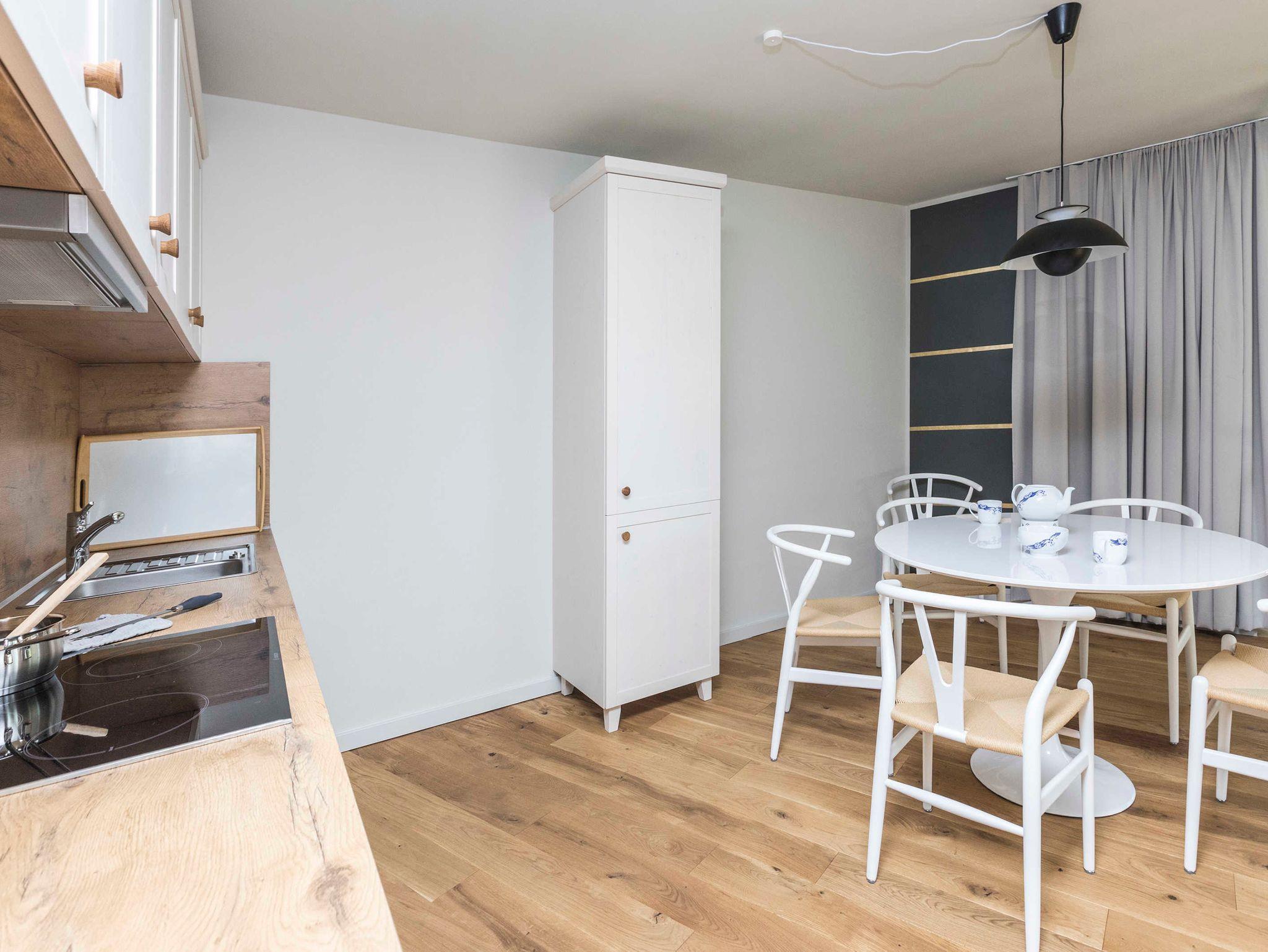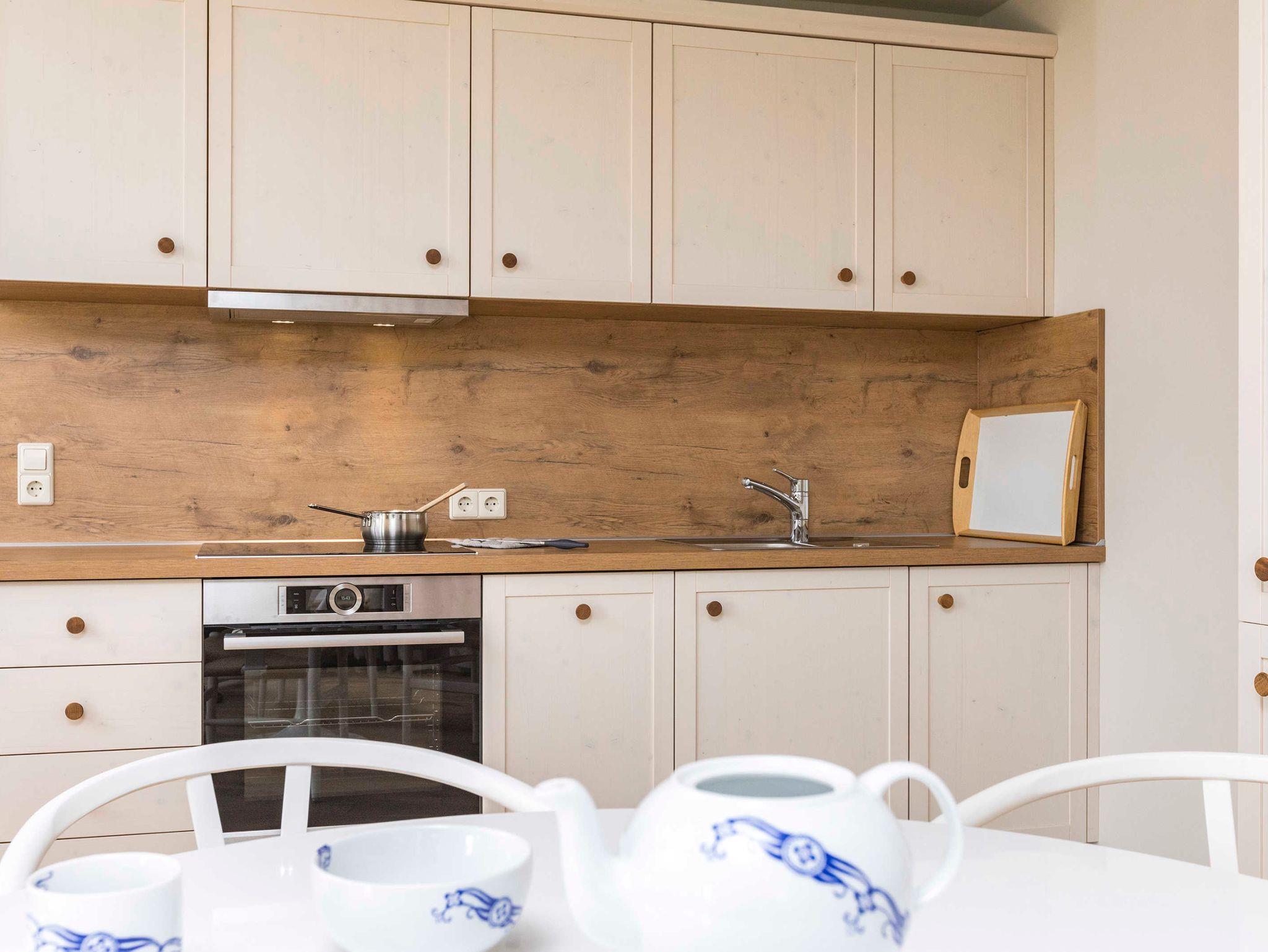 Ausstattung der Küche: 4-Zonen-Kochfeld, Backofen, Geschirrspüler, Filterkaffeemaschine, Wasserkocher, Toaster, Geschirr, Besteck, Pfannen und Töpfe.
