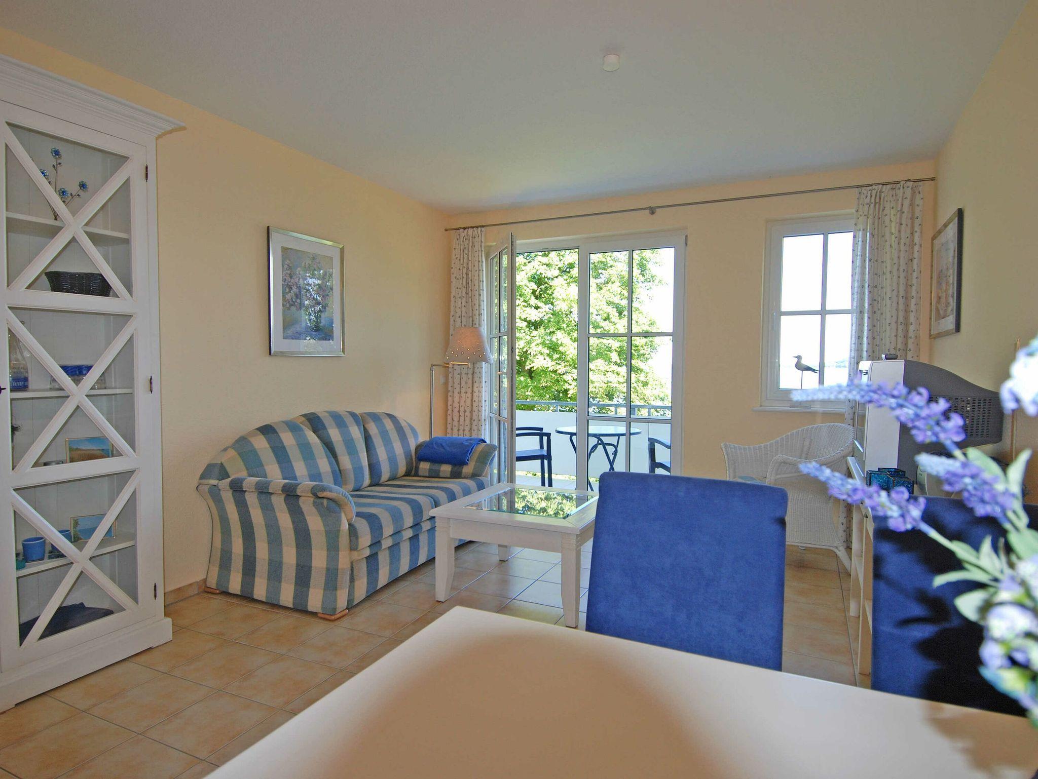 Die Wohnung 05 ist ein 2-Raum-Appartement mit rund 50 m² Wohnfläche und einem großen Balkon mit direktem Boddenblick. Die für bis zu 4 Feriengäste buchbare Nichtraucherwohnung verfügt über ein Wohnzimmer mit einer Schlafcouch für zwei Personen, eine sehr gut ausgestattete Küchenzeile mit Backofen, Mikrowelle und Geschirrspüler, ein Duschbad und ein Schlafzimmer mit einem Doppelbett. Zur technischen Ausstattung zählen ein Fernseher, ein DVD-Player und eine Stereoanlage mit CD-Player.